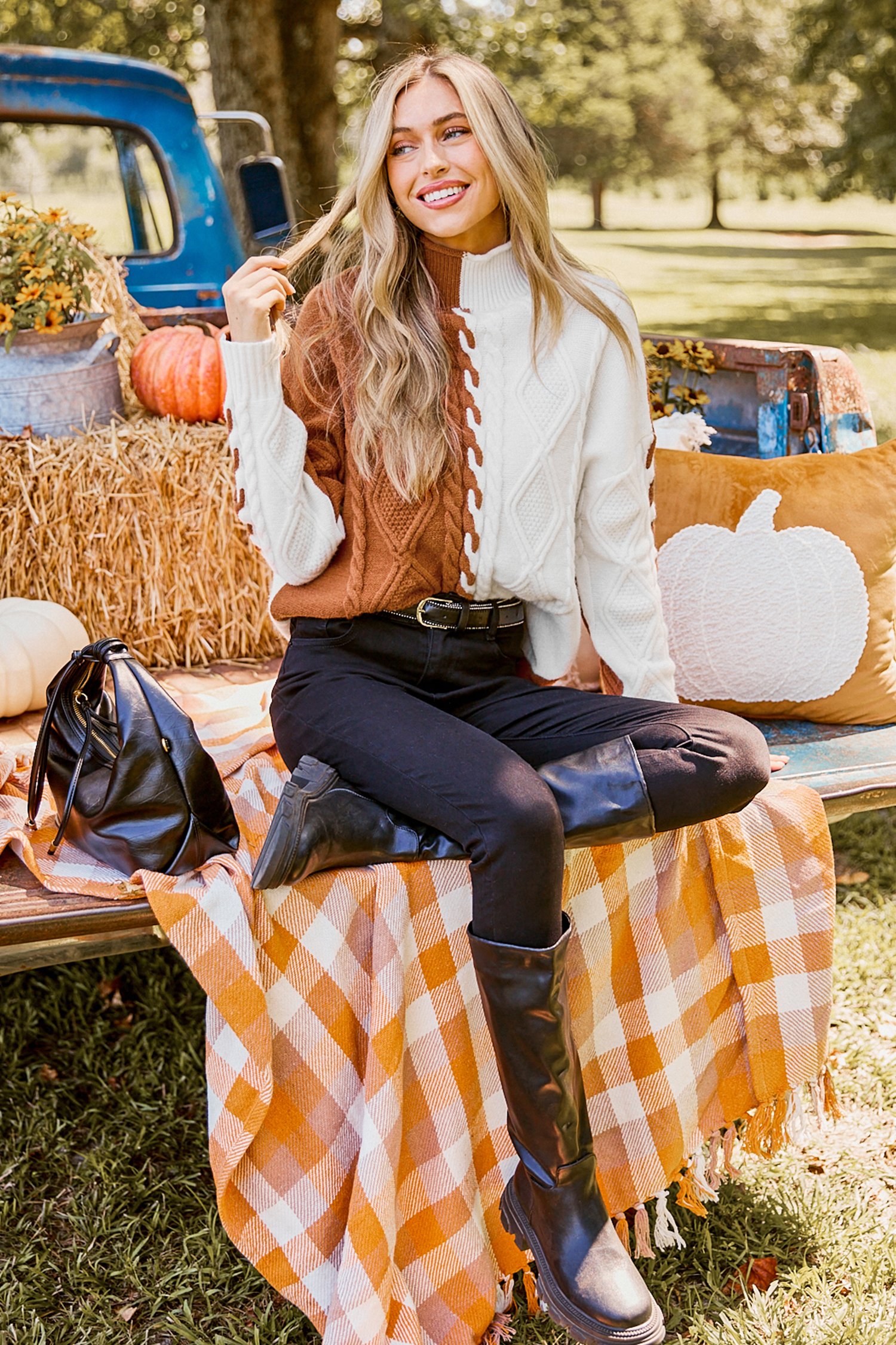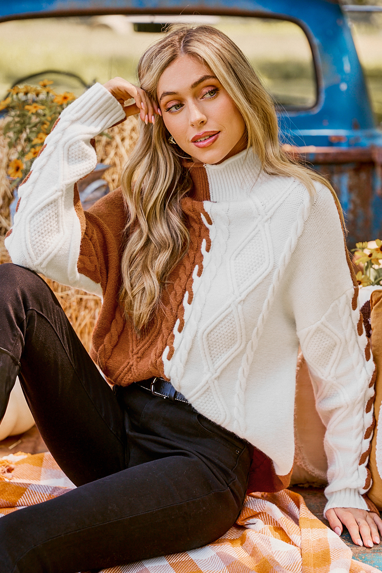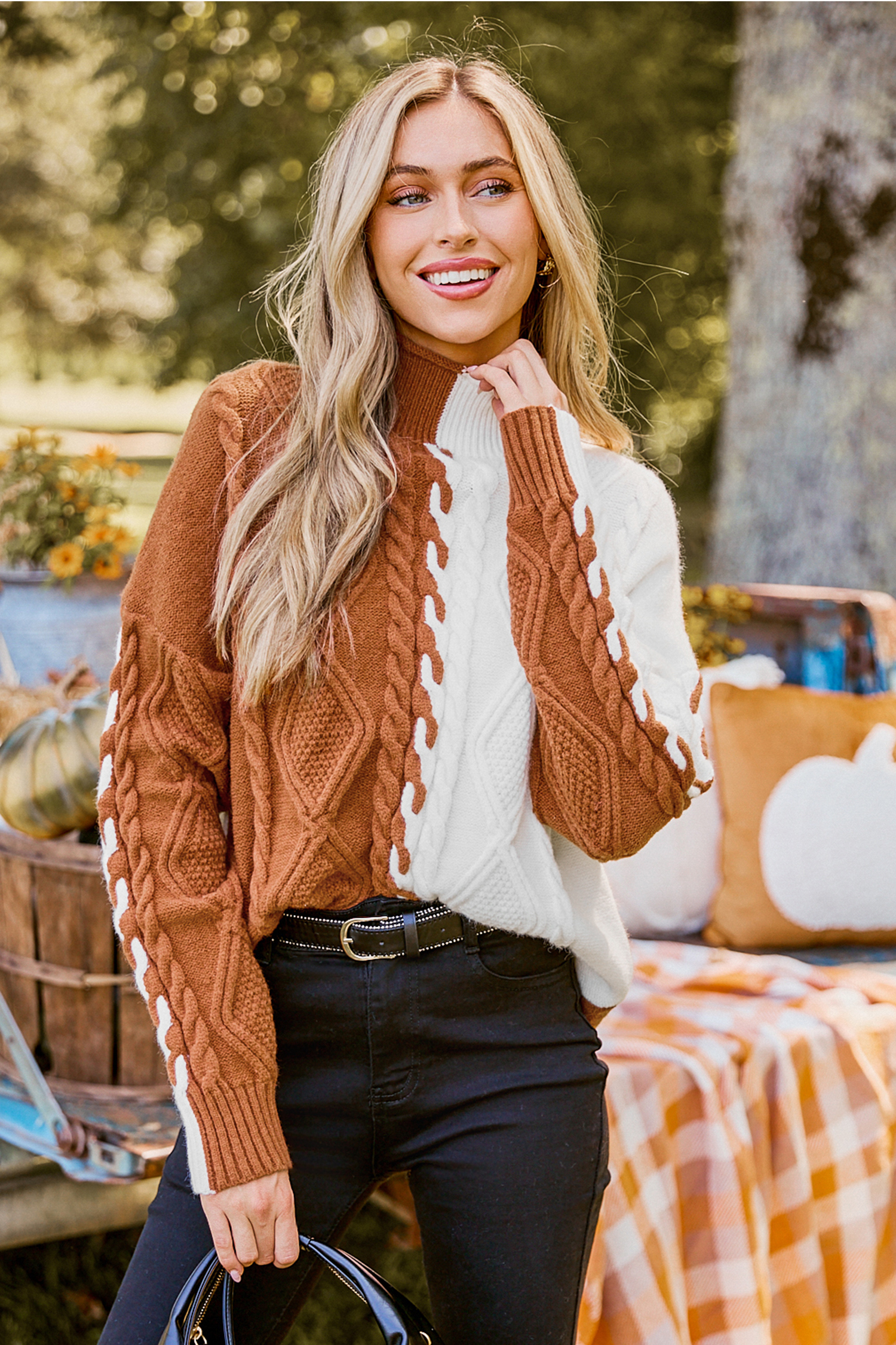 Camel & White Colorblock Turtleneck Long Sleeve Sweater