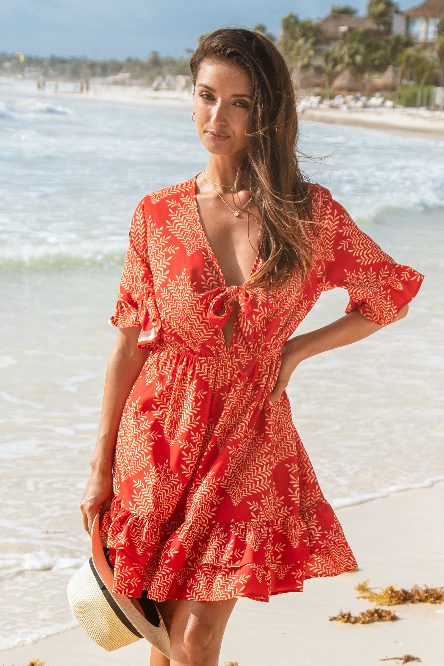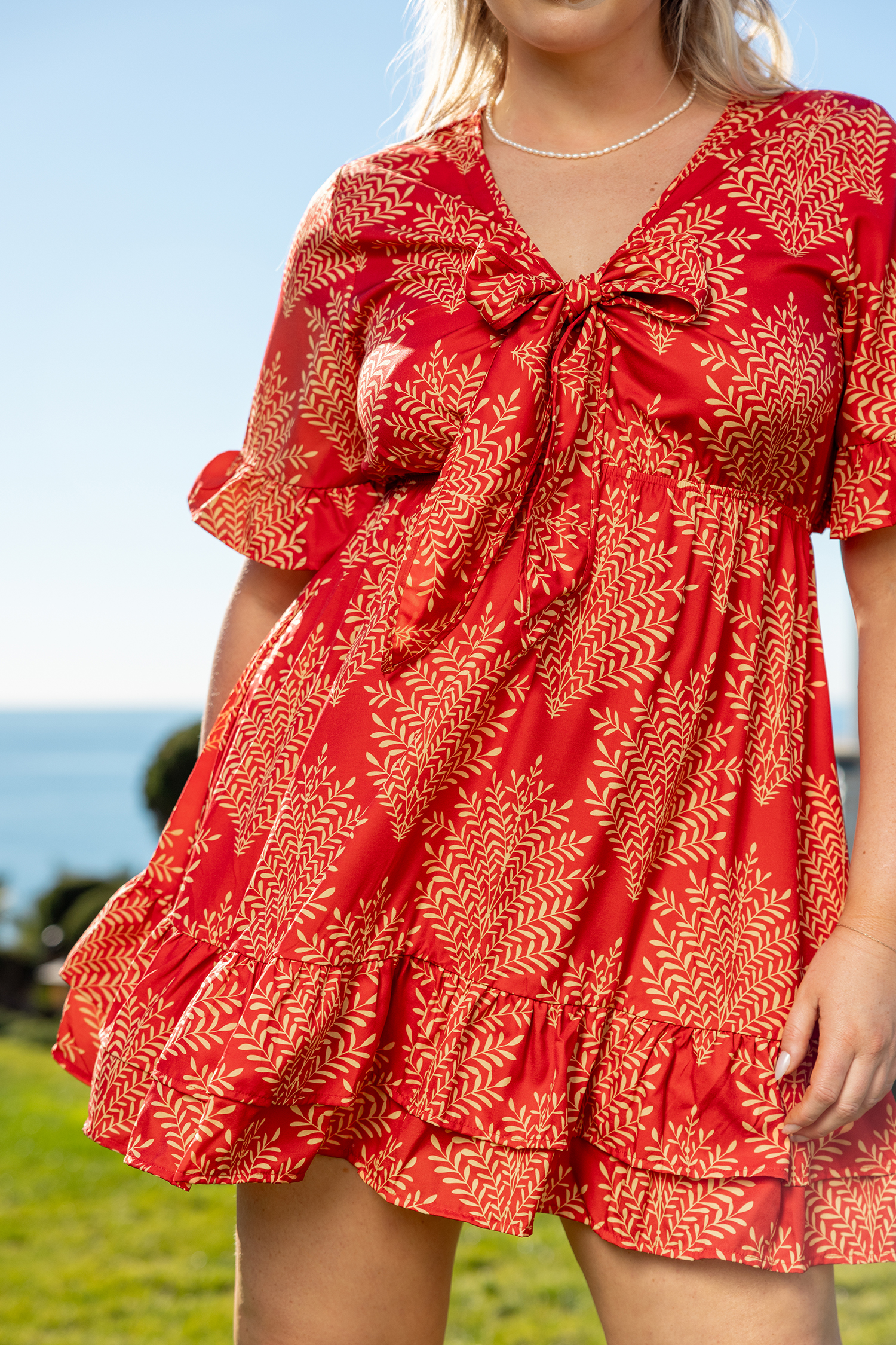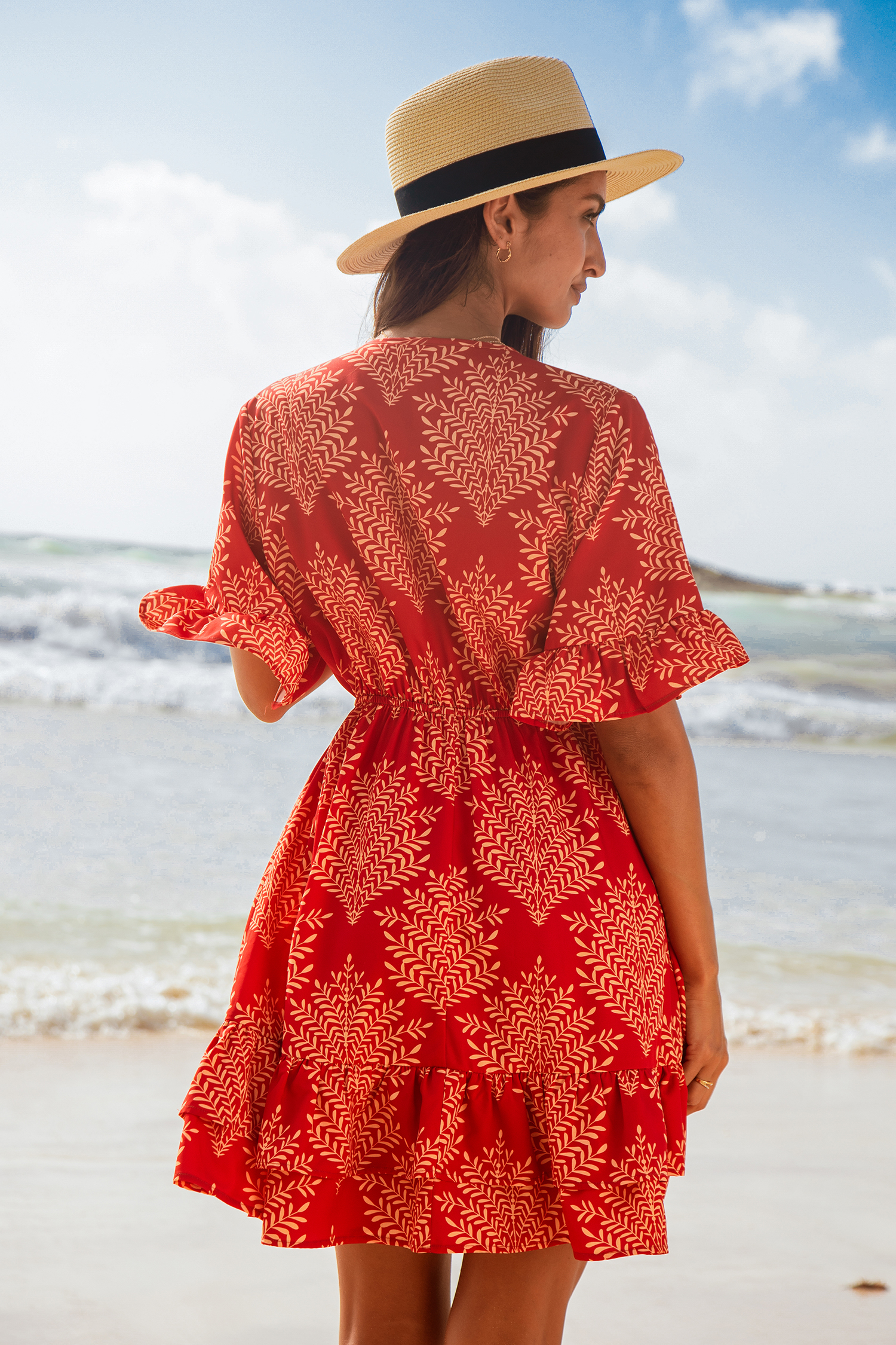 HomeX Iskra Candy Apple Front Tie Flared Sleeve Mini Dress