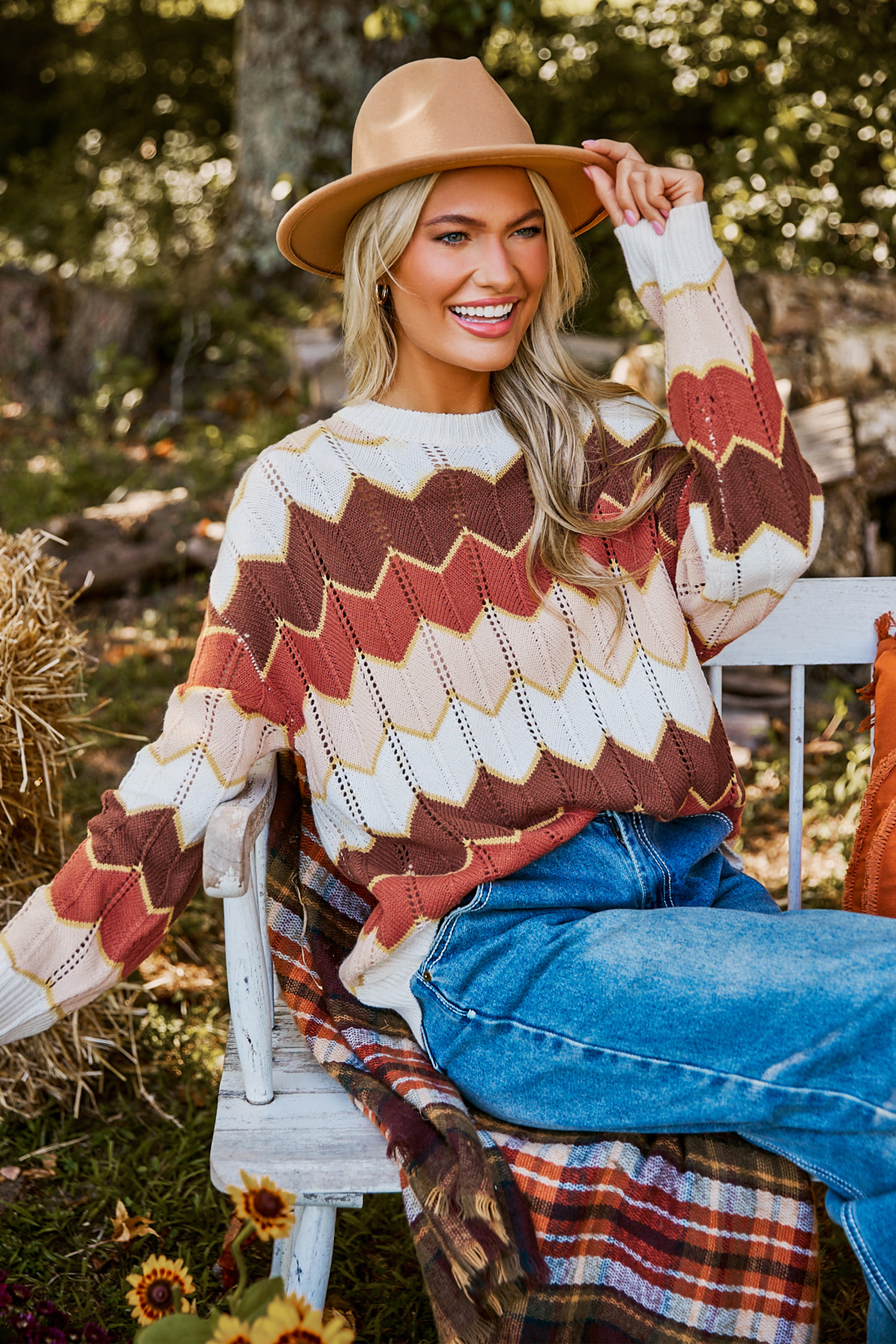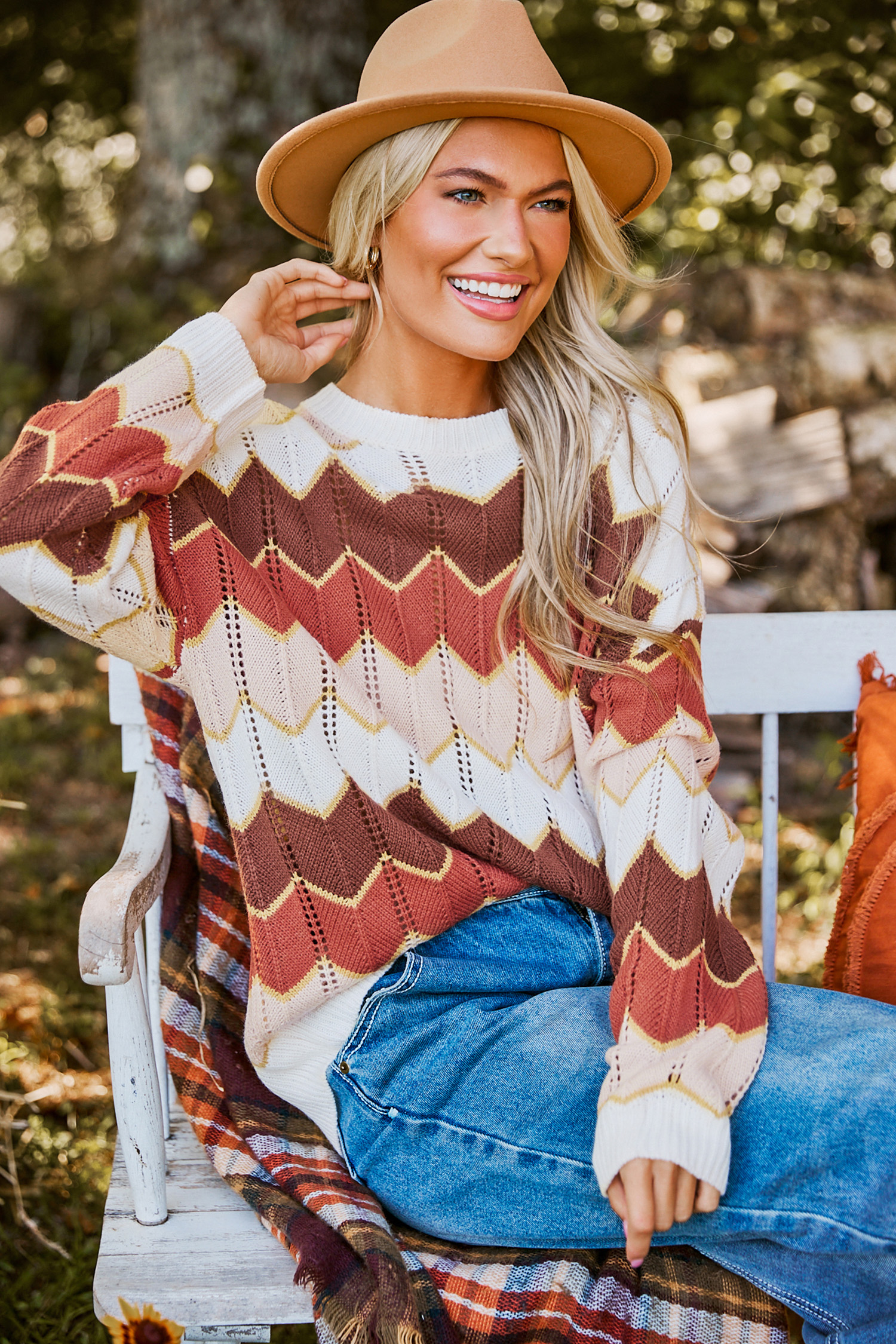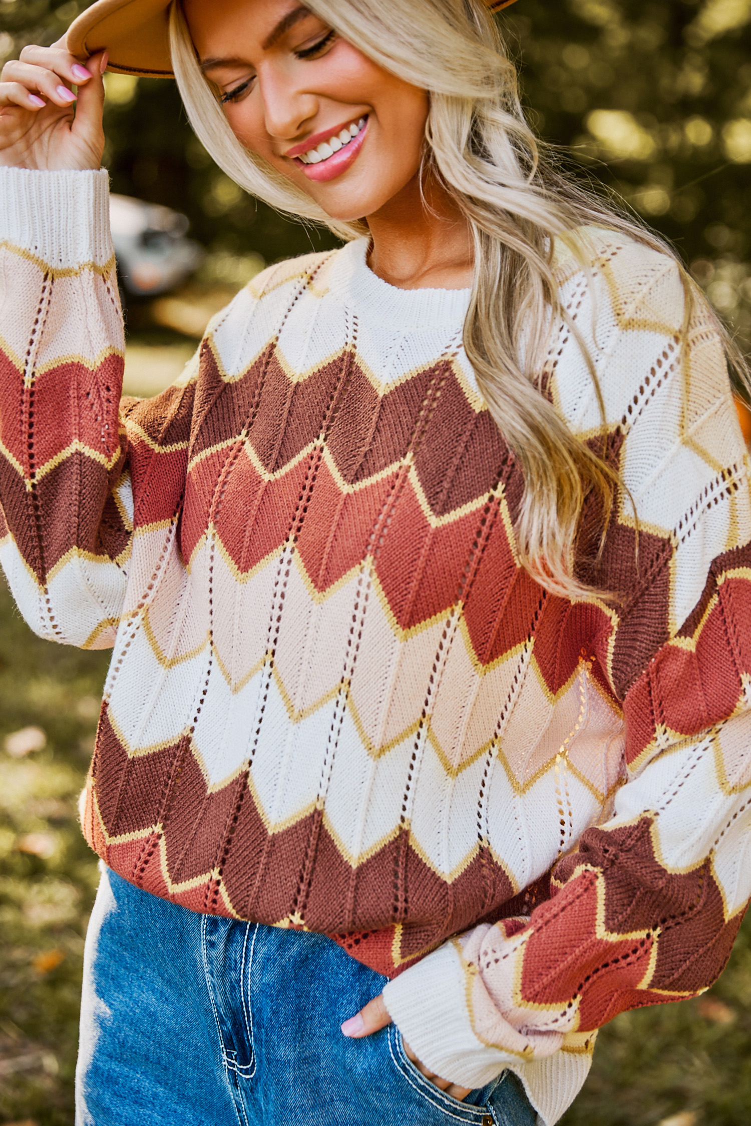 Chevron Colorblock Round Neck Long Sleeve Sweater