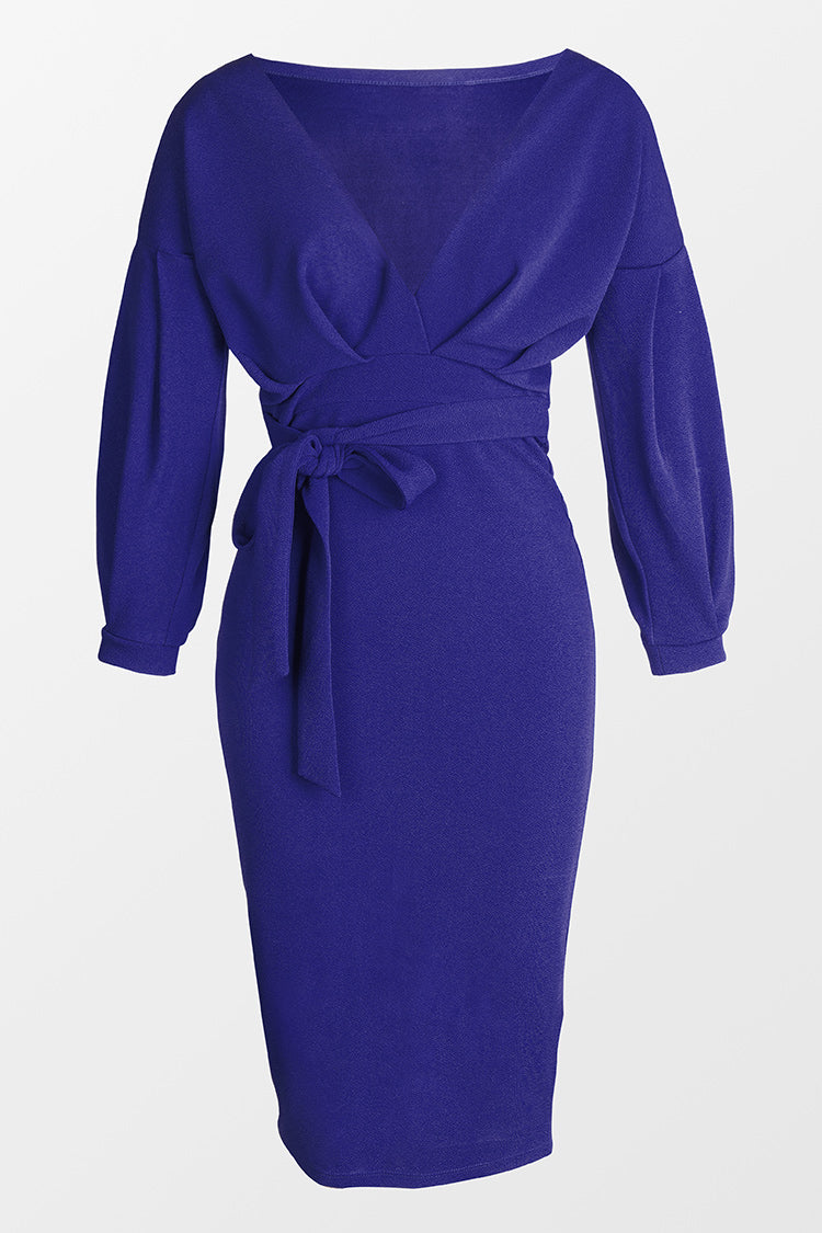 HomeChyna Blue 3/4 Sleeve Tie Waist Tea Length Dress