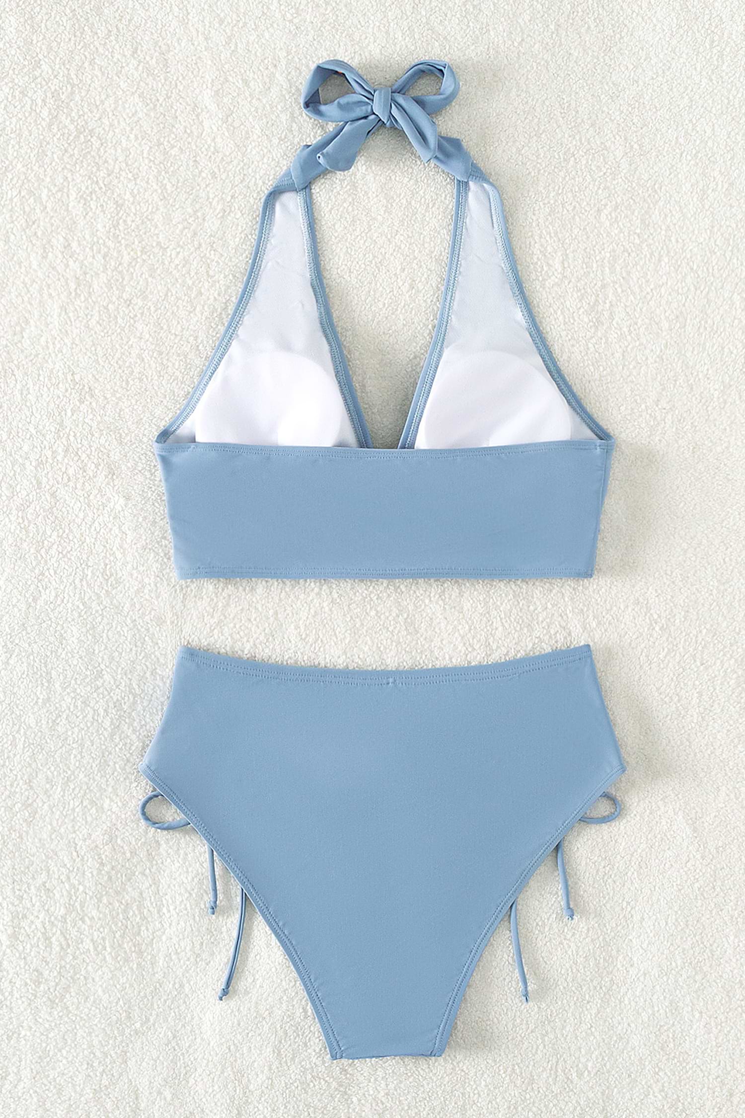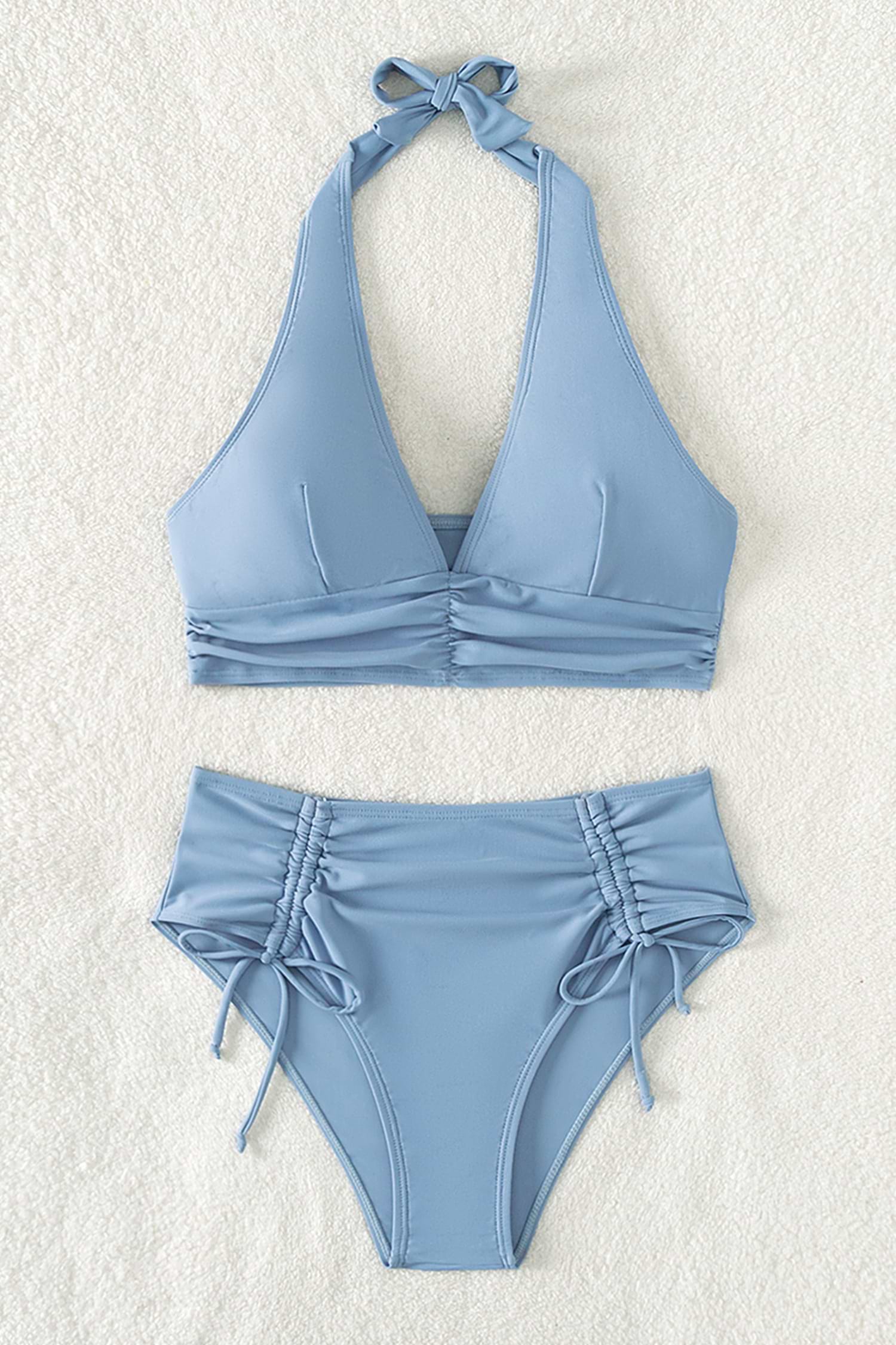 Cinched Halter Longline & Drawstring High Waist Hipster Bikini Set