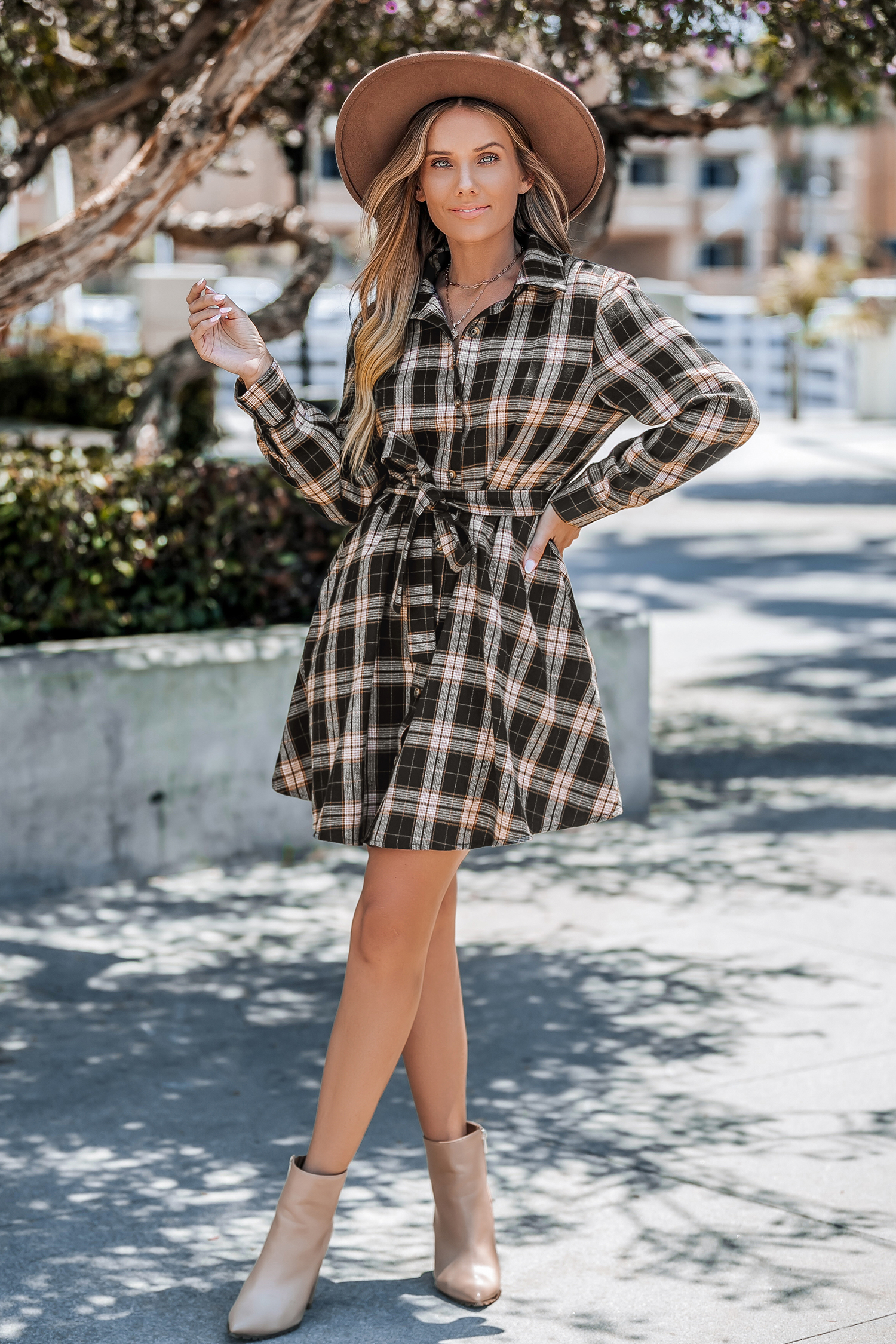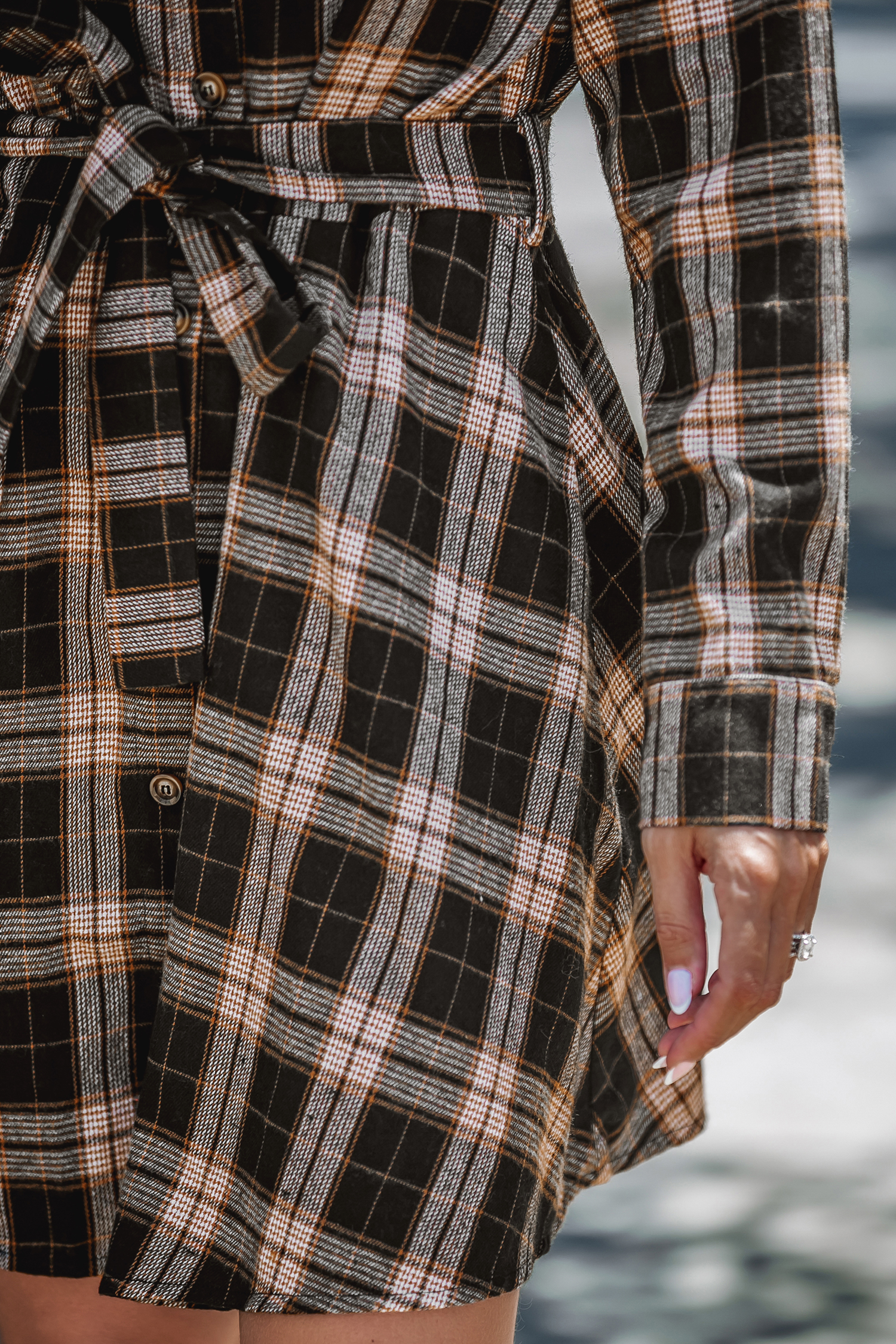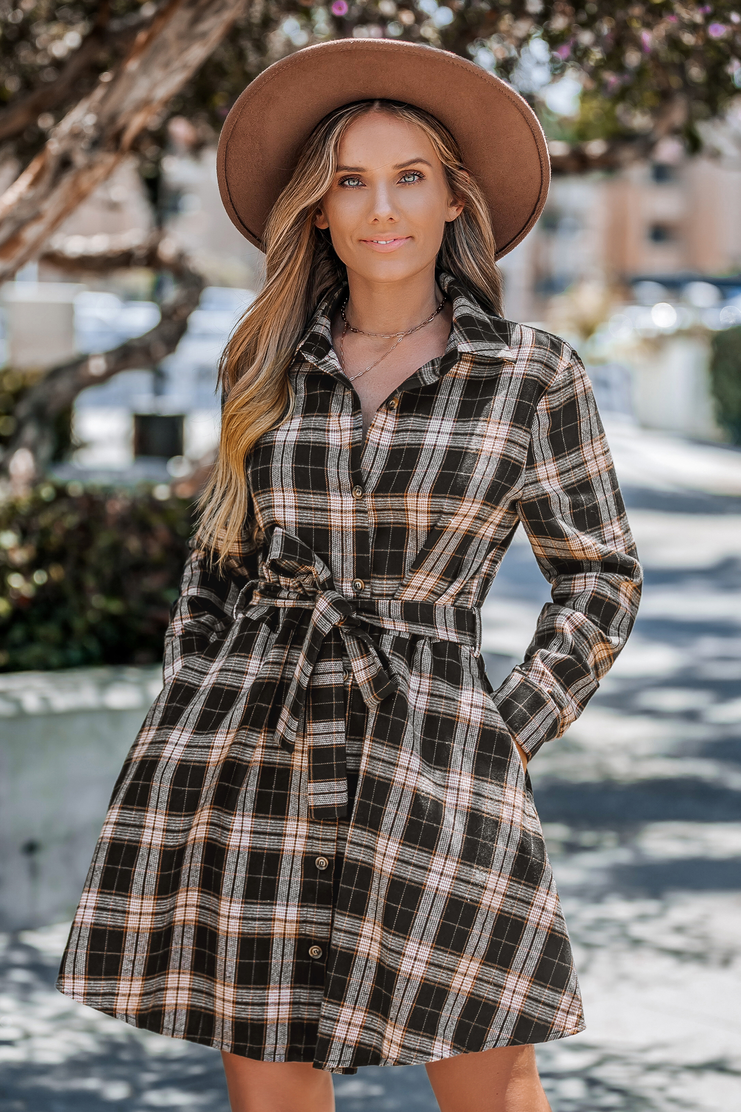HomeCoffee Brown Plaid Collared Button Up Mini Shirt Dress