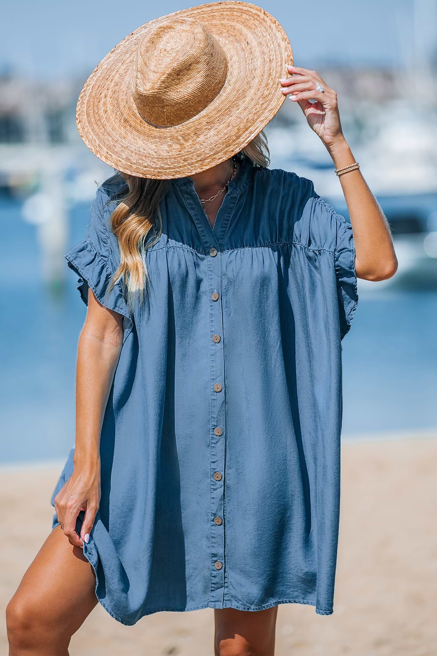 HomeDenim Front Button Ruffle Sleeve Mini Dress
