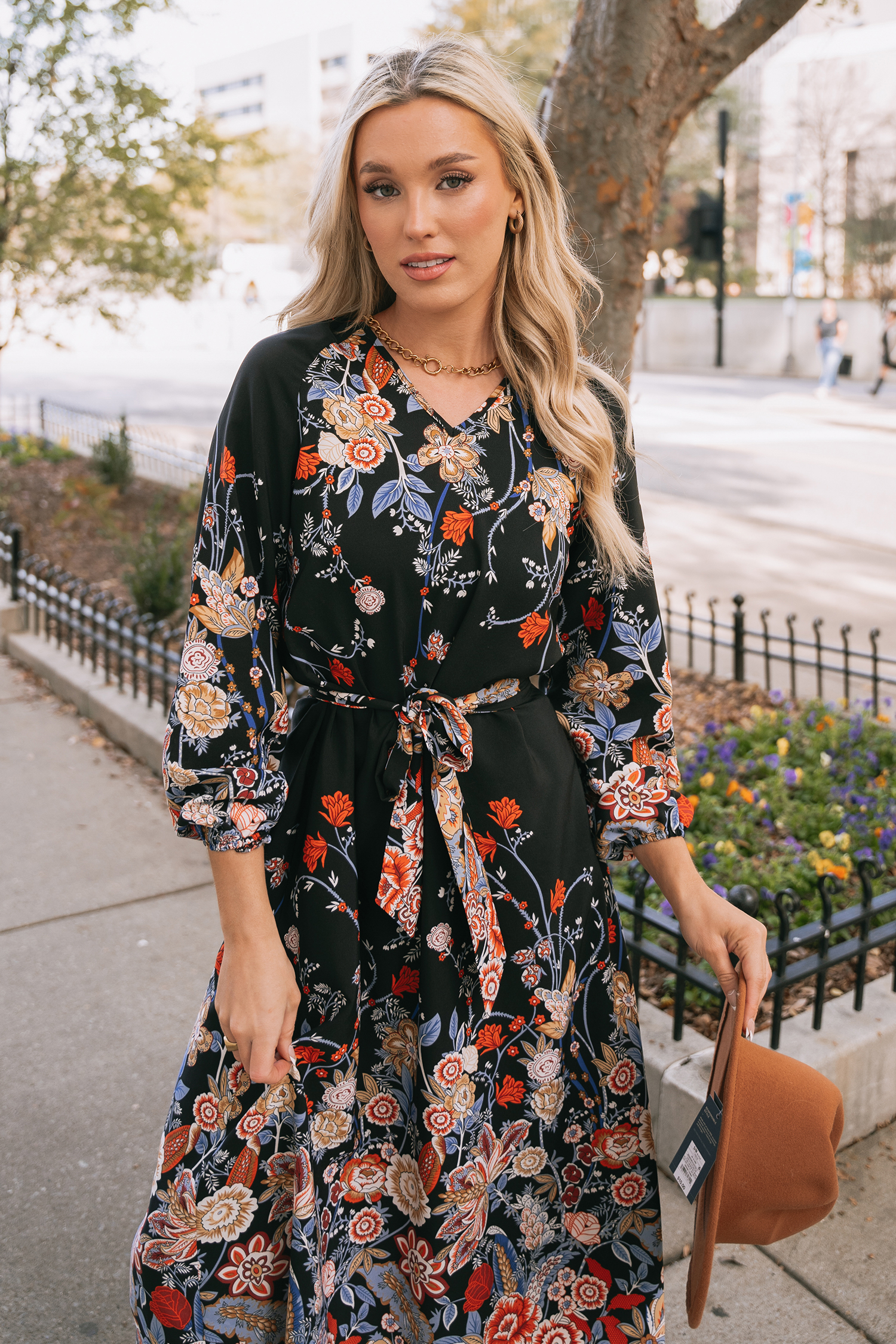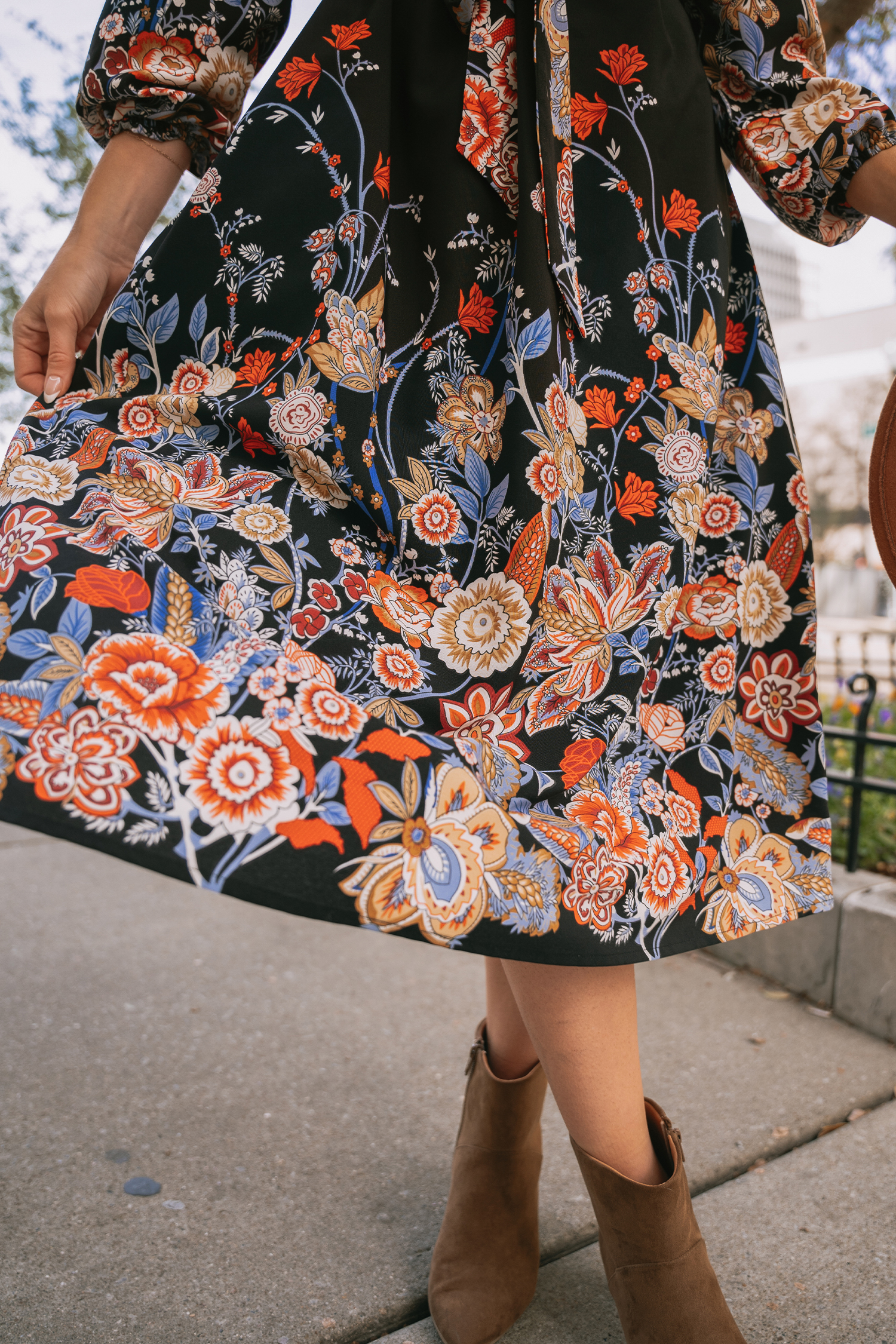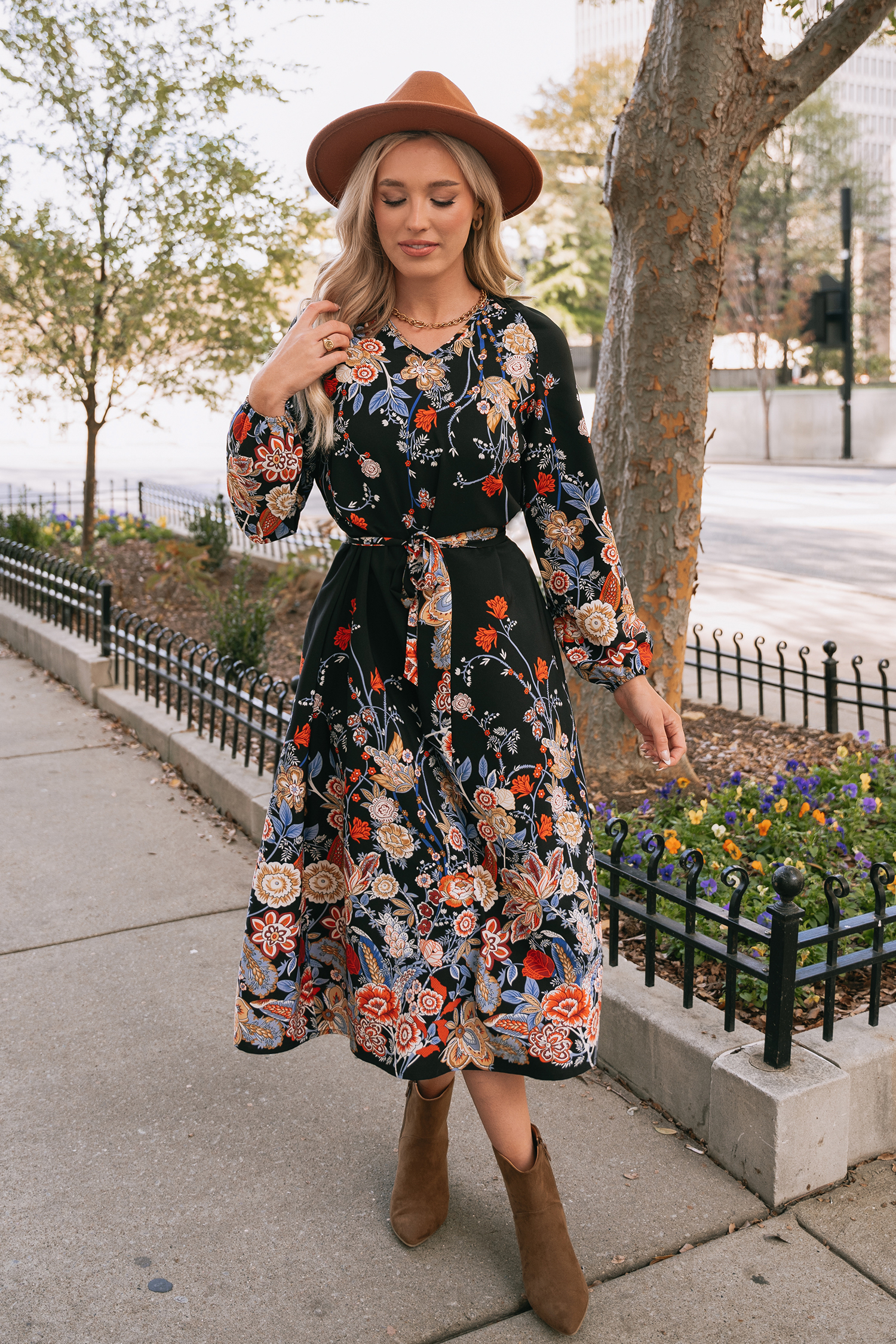 Floral Print Bow Tie Long Sleeve Midi Dress