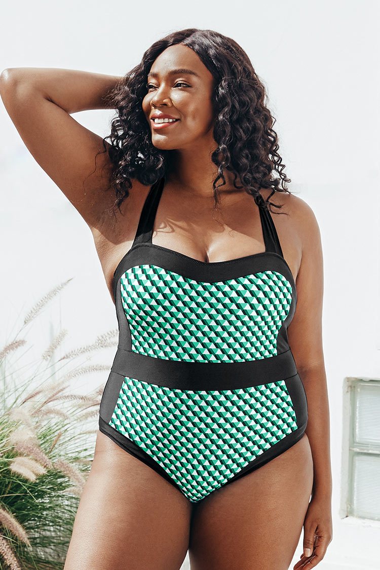 Geometric Print Halter Plus Size One Piece Swimsuit