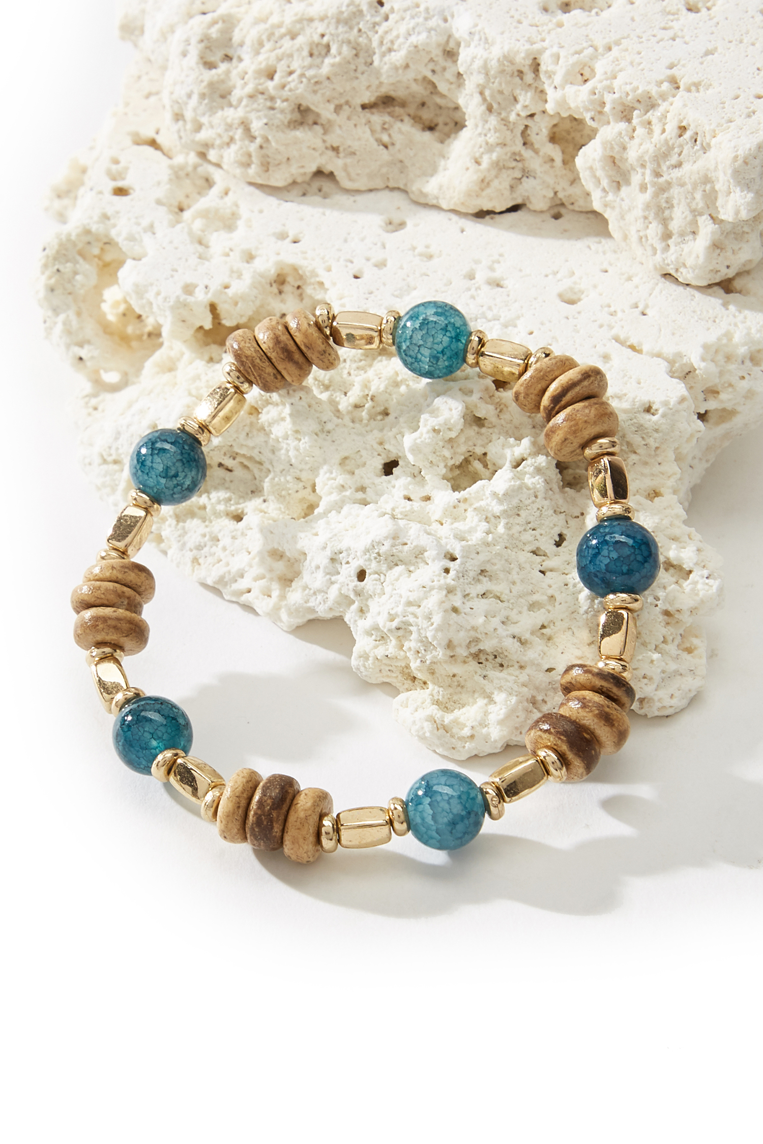 The Gleaming Beaded Bracelet Set brings a subtle pop of shine with a fresh, beachy feel! Gold-tone and aqua beads are designed to mix and match, making it an easy add-on for everything from swim looks to off-duty outfits.