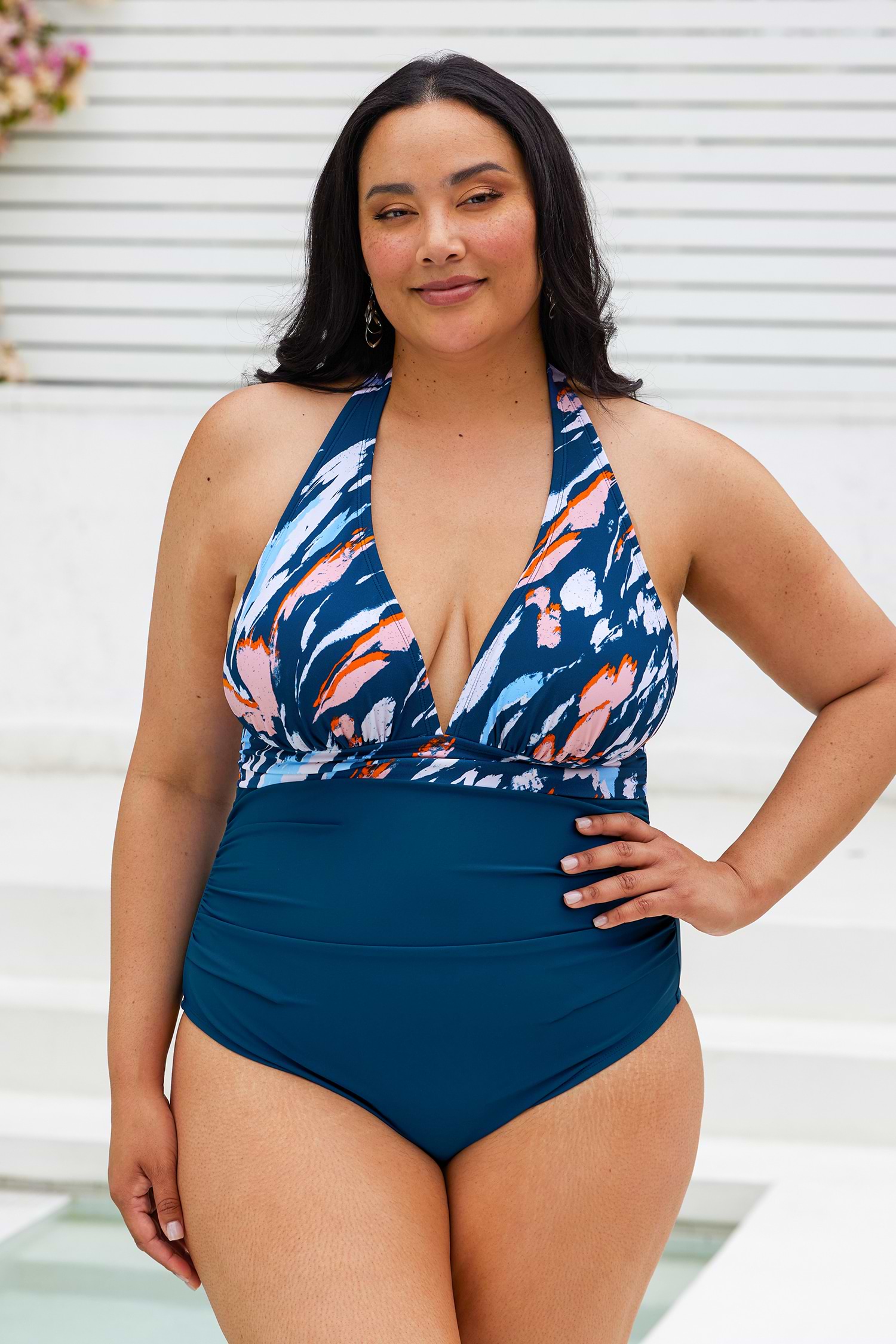 HomeGraffiti Board Plunge Halter Plus Size One Piece Swimsuit