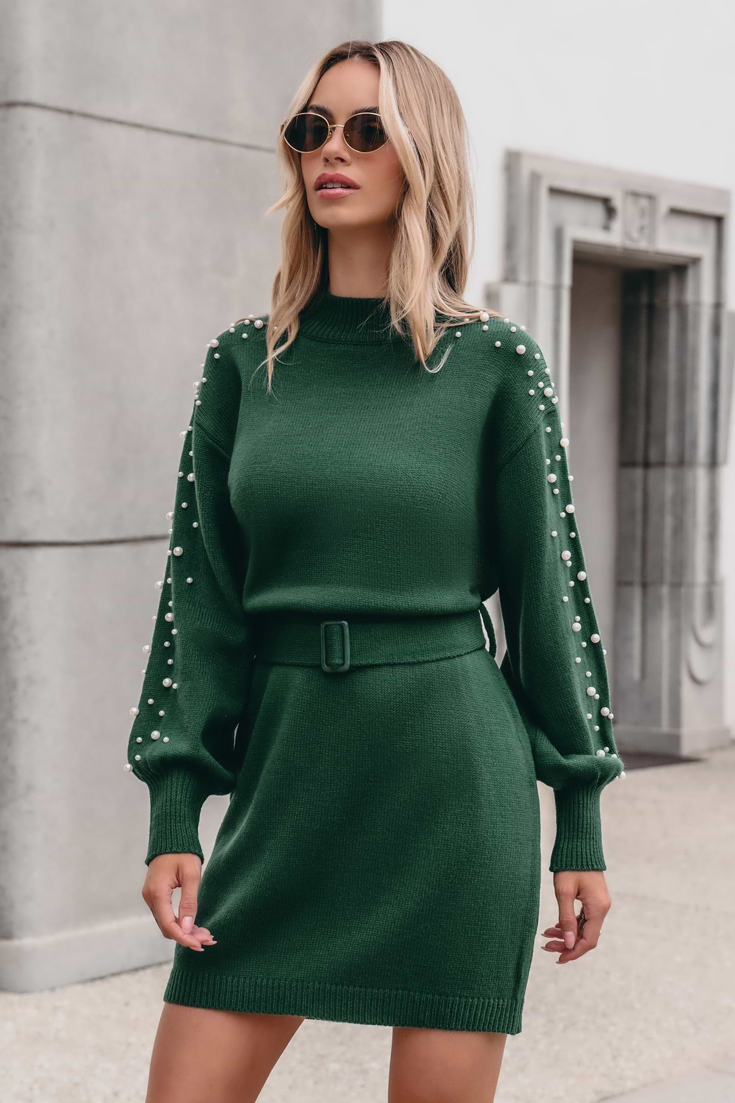 Green Mockneck Beaded Long Sleeve Sweater Dress