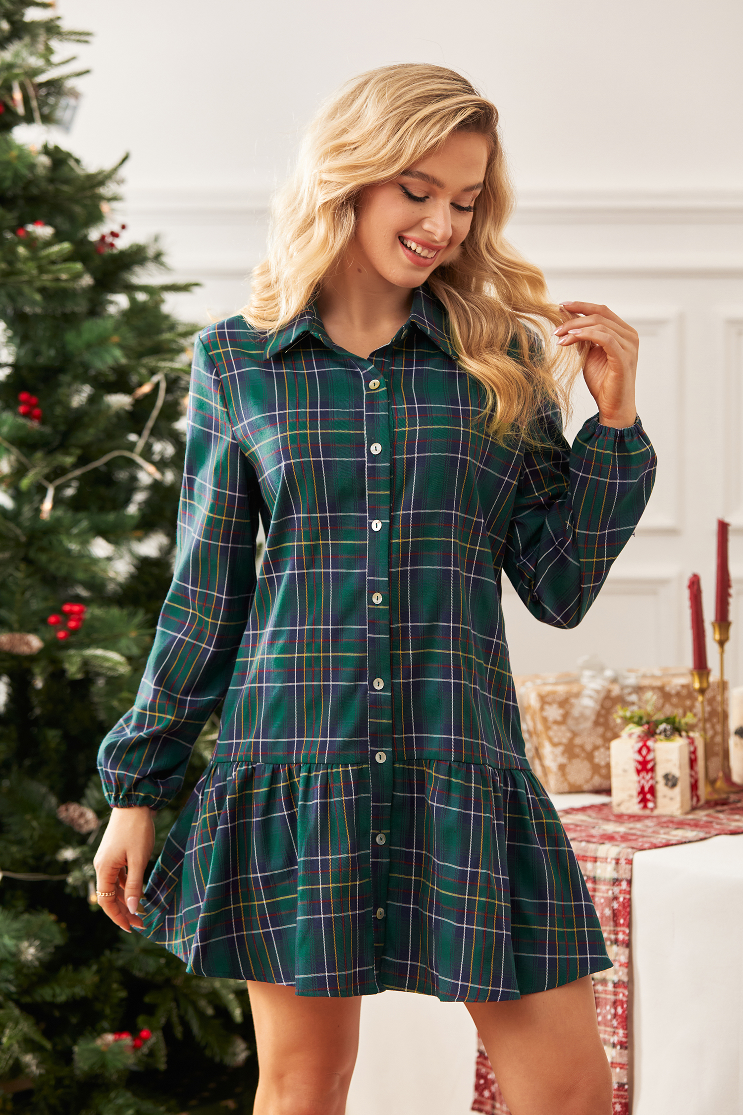 HomeGreen Plaid Collared Flounce Hem Mini Shirt Dress