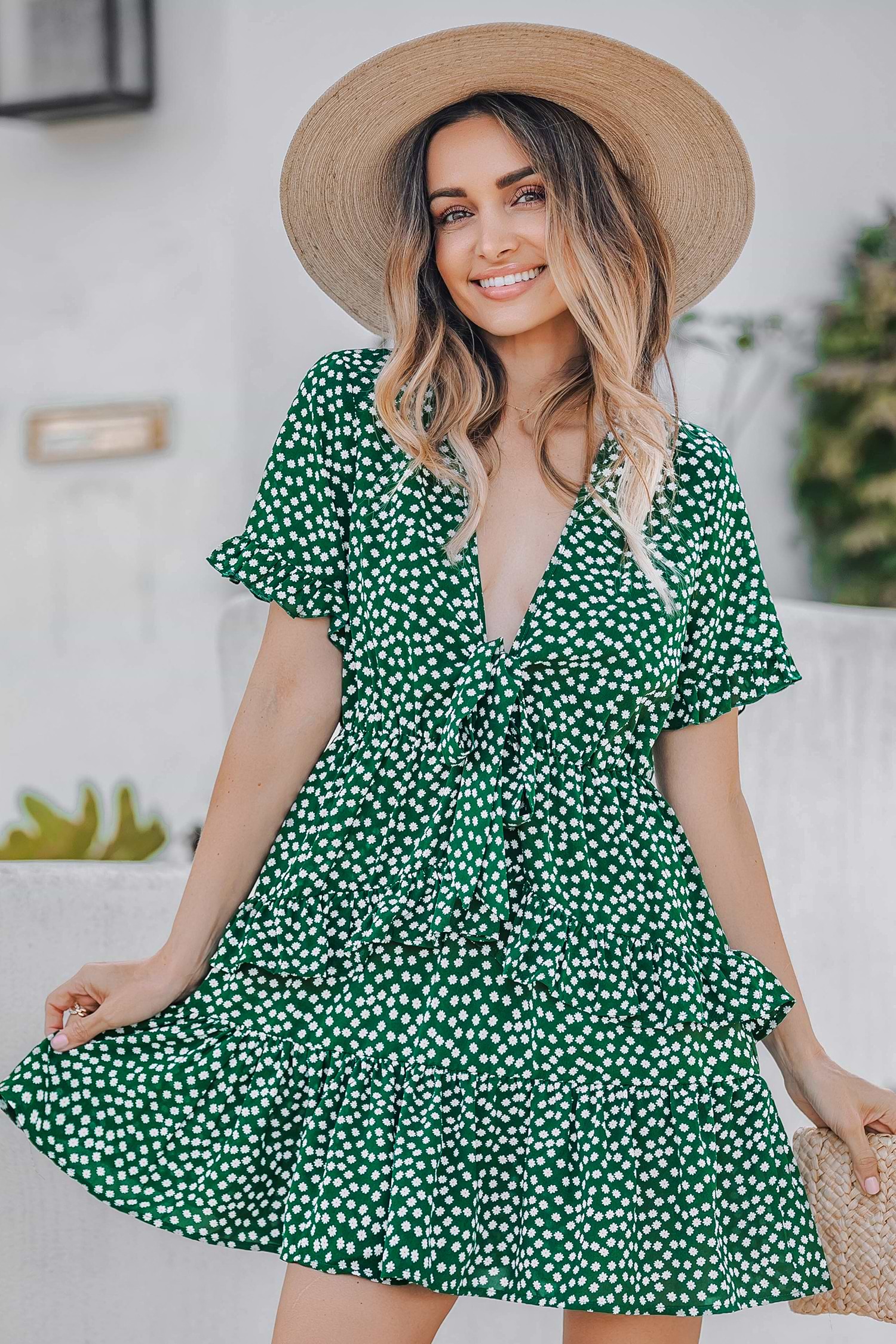 Green Plunging Neck Tiered Mini Dress