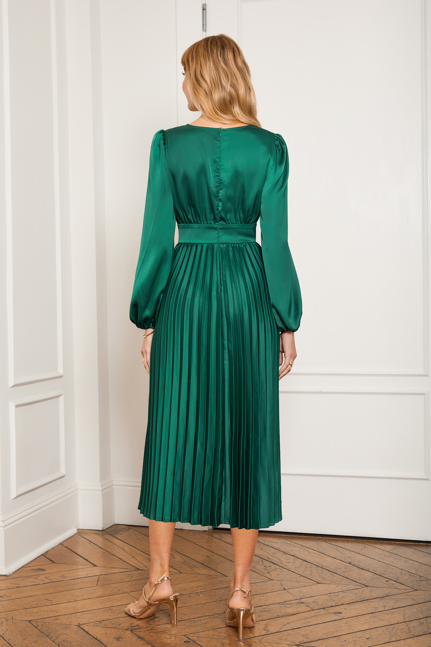 Green Satin Plunging Puff Sleeve Pleated Midi Dress
