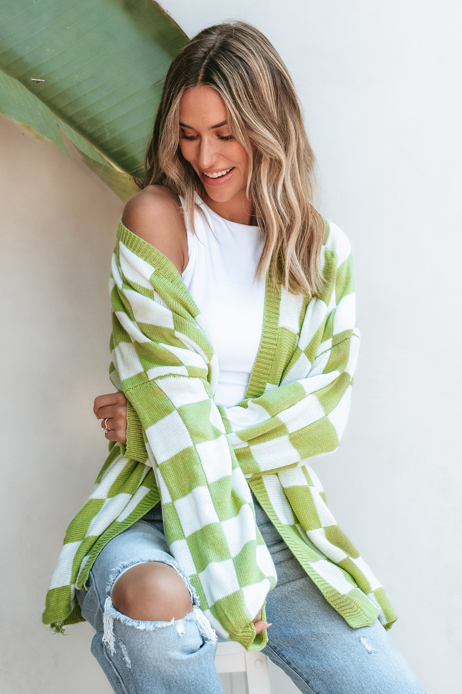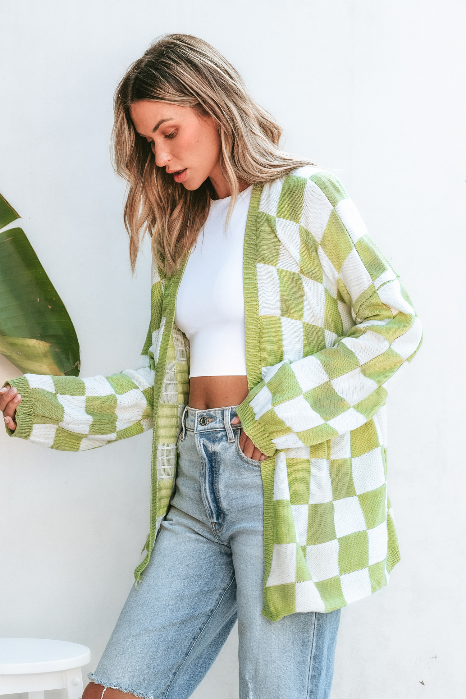 Green & White Checkered Open Front Cardigan