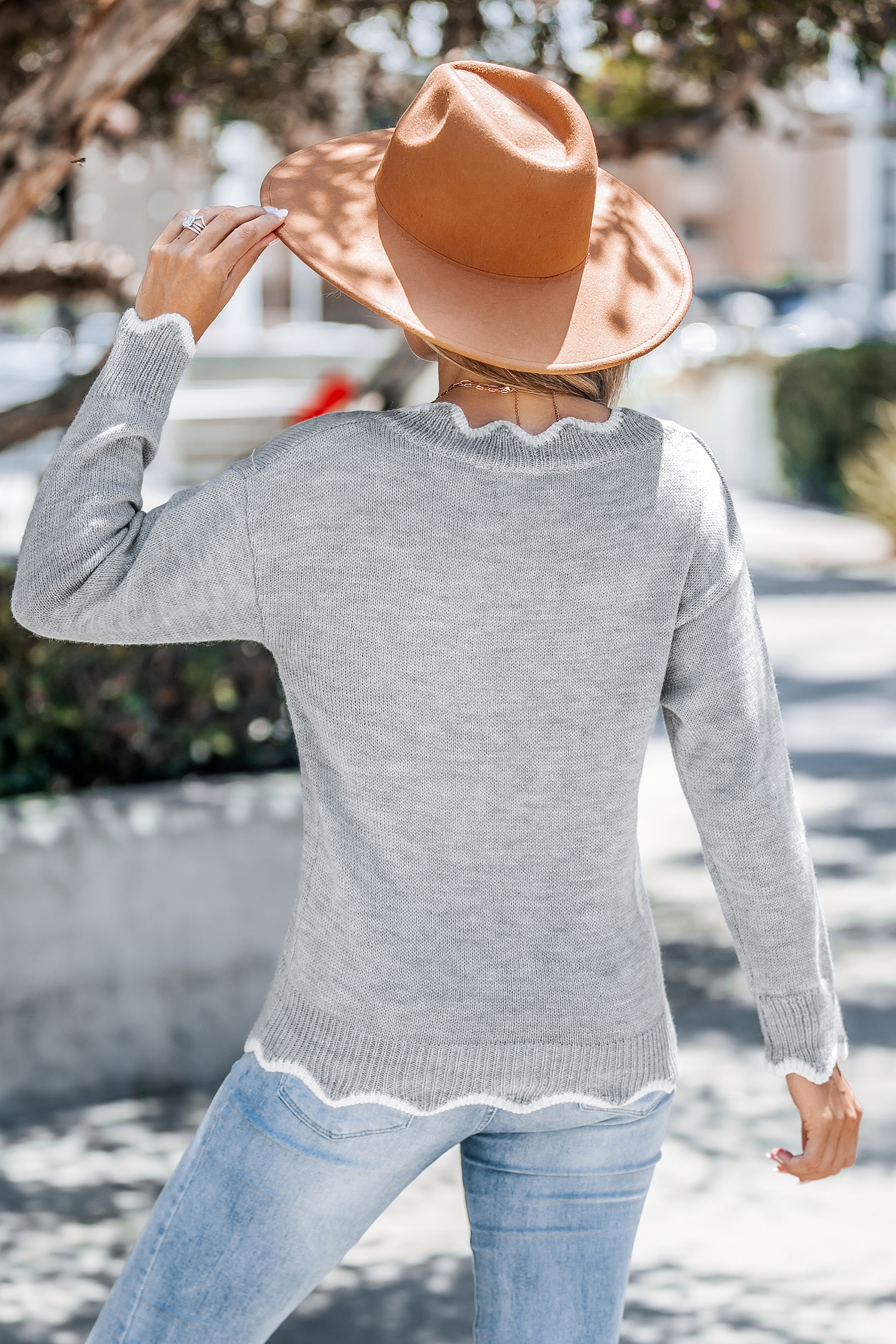 Grey V-Neck Long Sleeve Scalloped Sweater