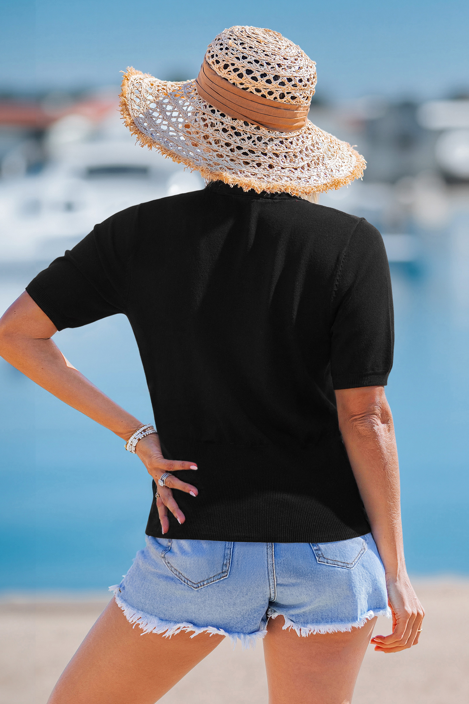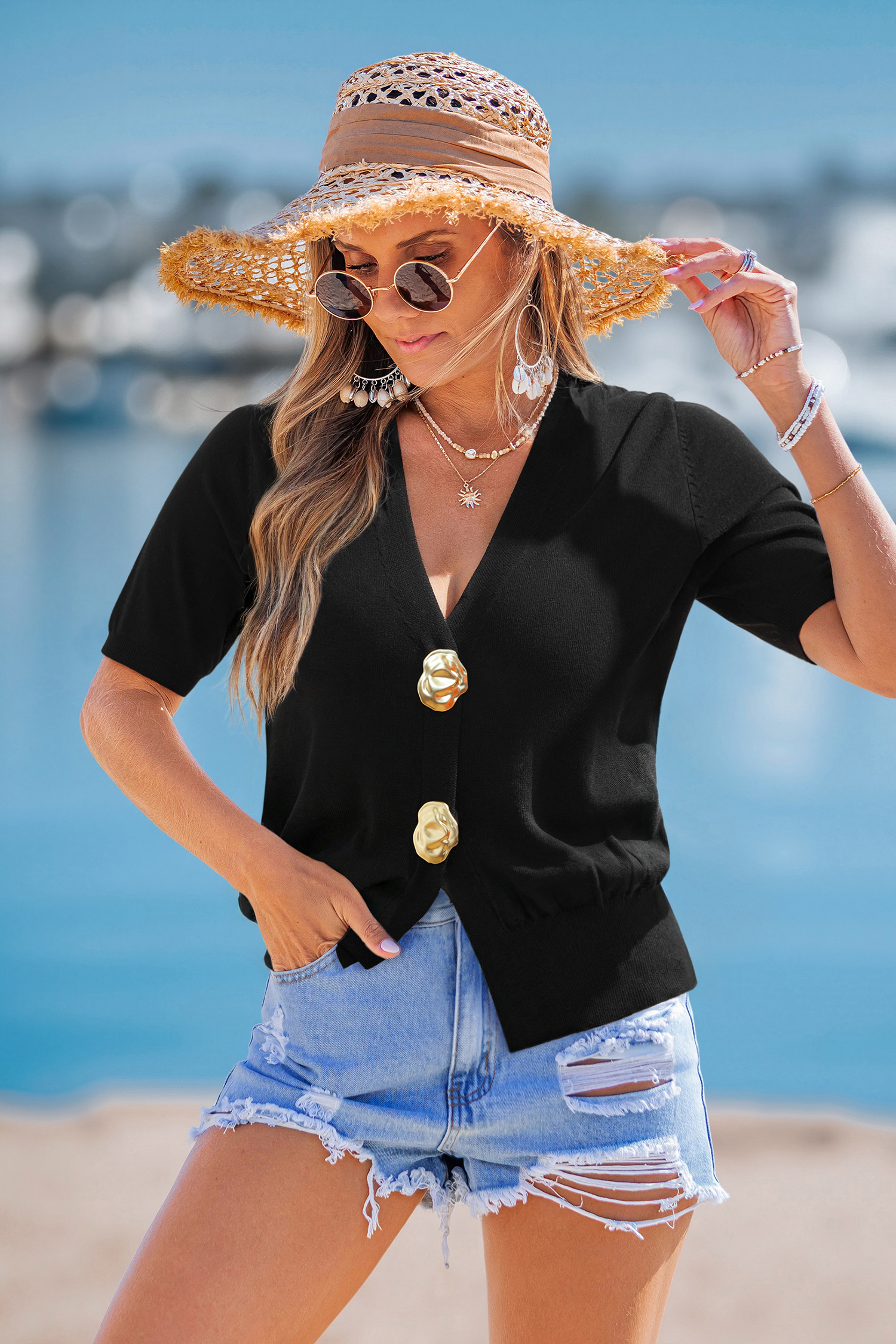 The Harmony Black Top keeps everything balanced and cool! A V-neckline and short sleeves give it a clean look, while the gold-tone details add just enough polish to dress it up or down.