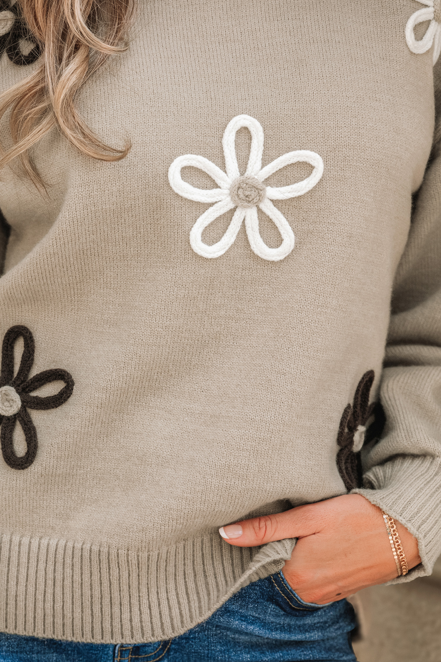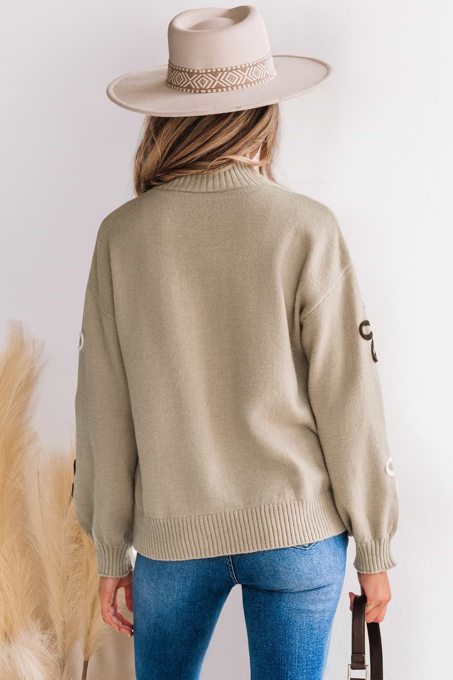 Khaki Floral Puff Sleeve Mockneck Sweater