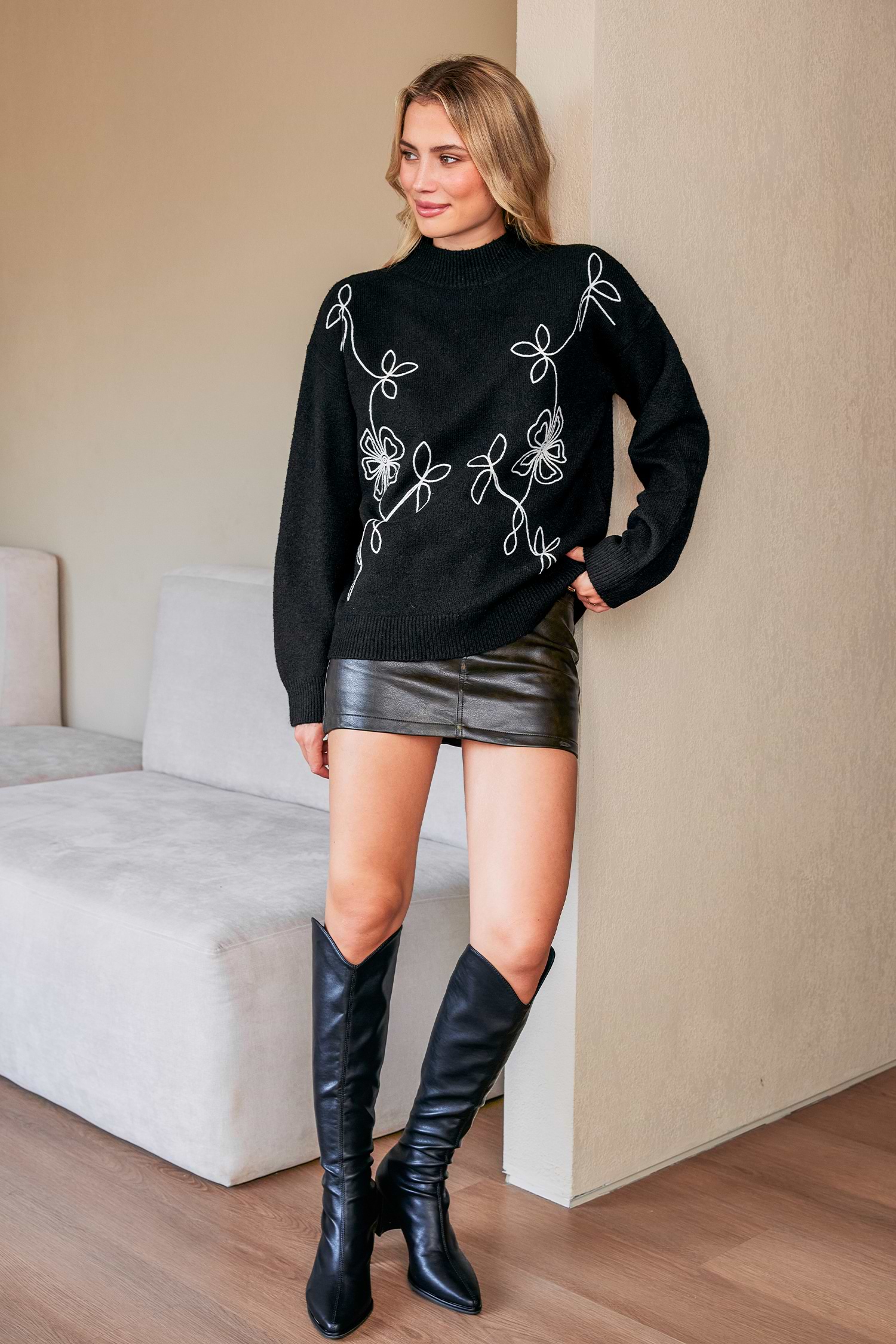 The Little Wins Black Sweater is a cozy essential! Its chunky knit feel, high neckline, and long sleeves make it a versatile pick for layering or wearing as a statement piece.