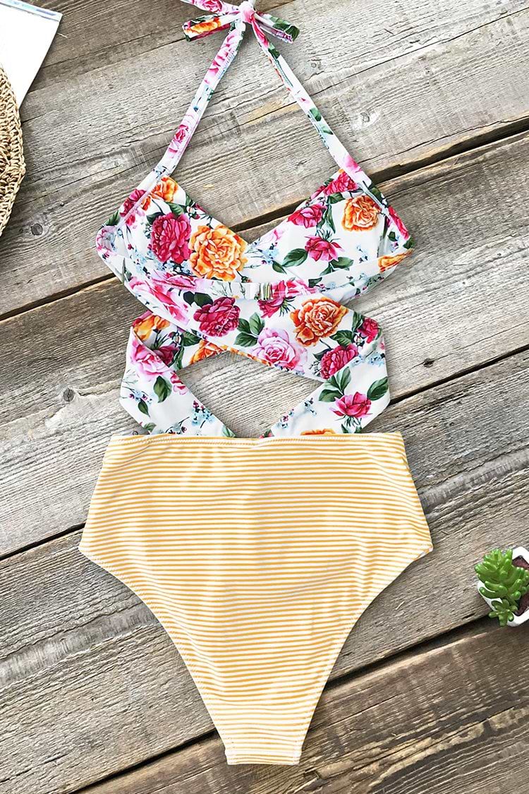 Magenta Floral And Striped Wrap One-Piece Swimsuit