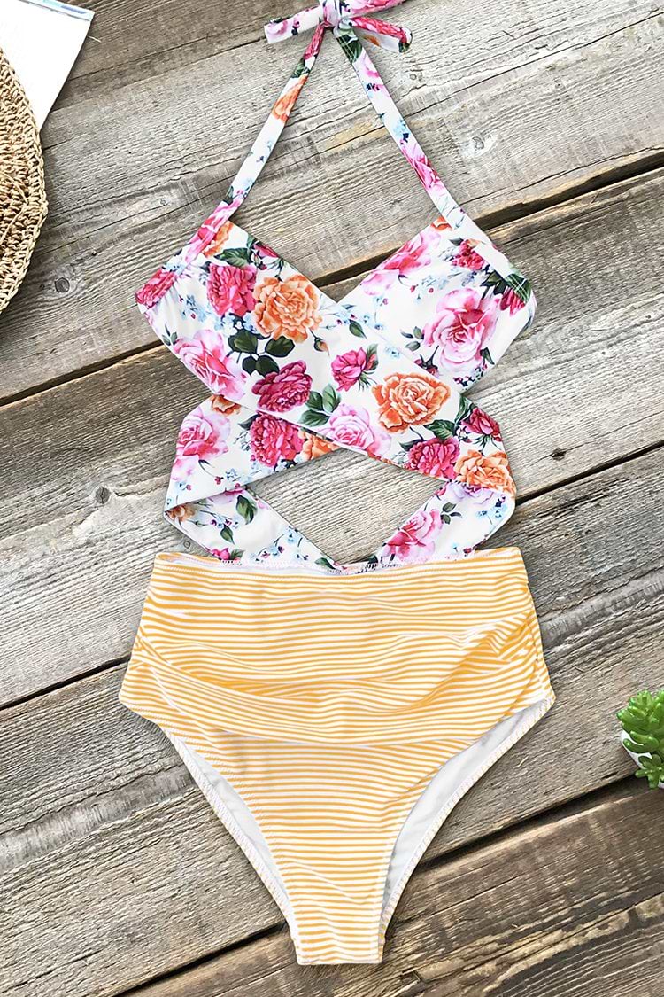 HomeMagenta Floral And Striped Wrap One-Piece Swimsuit