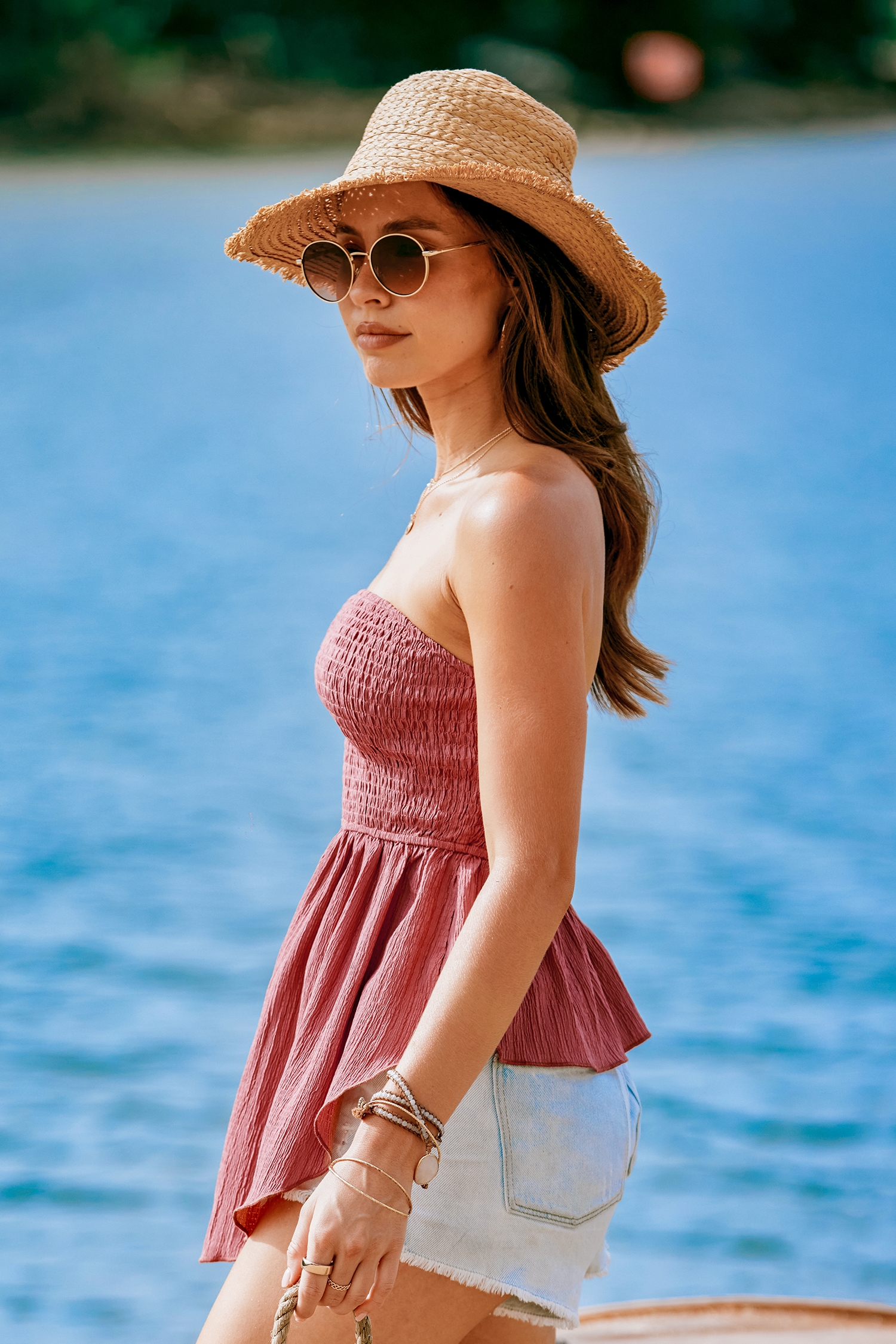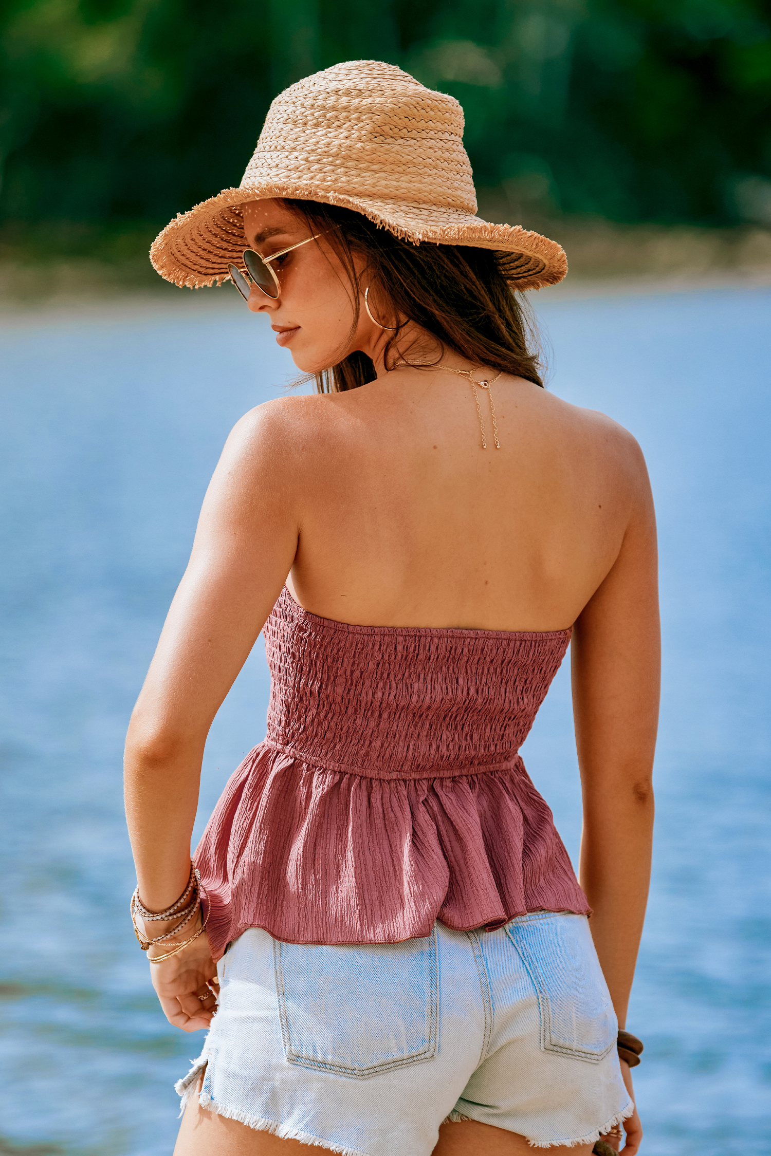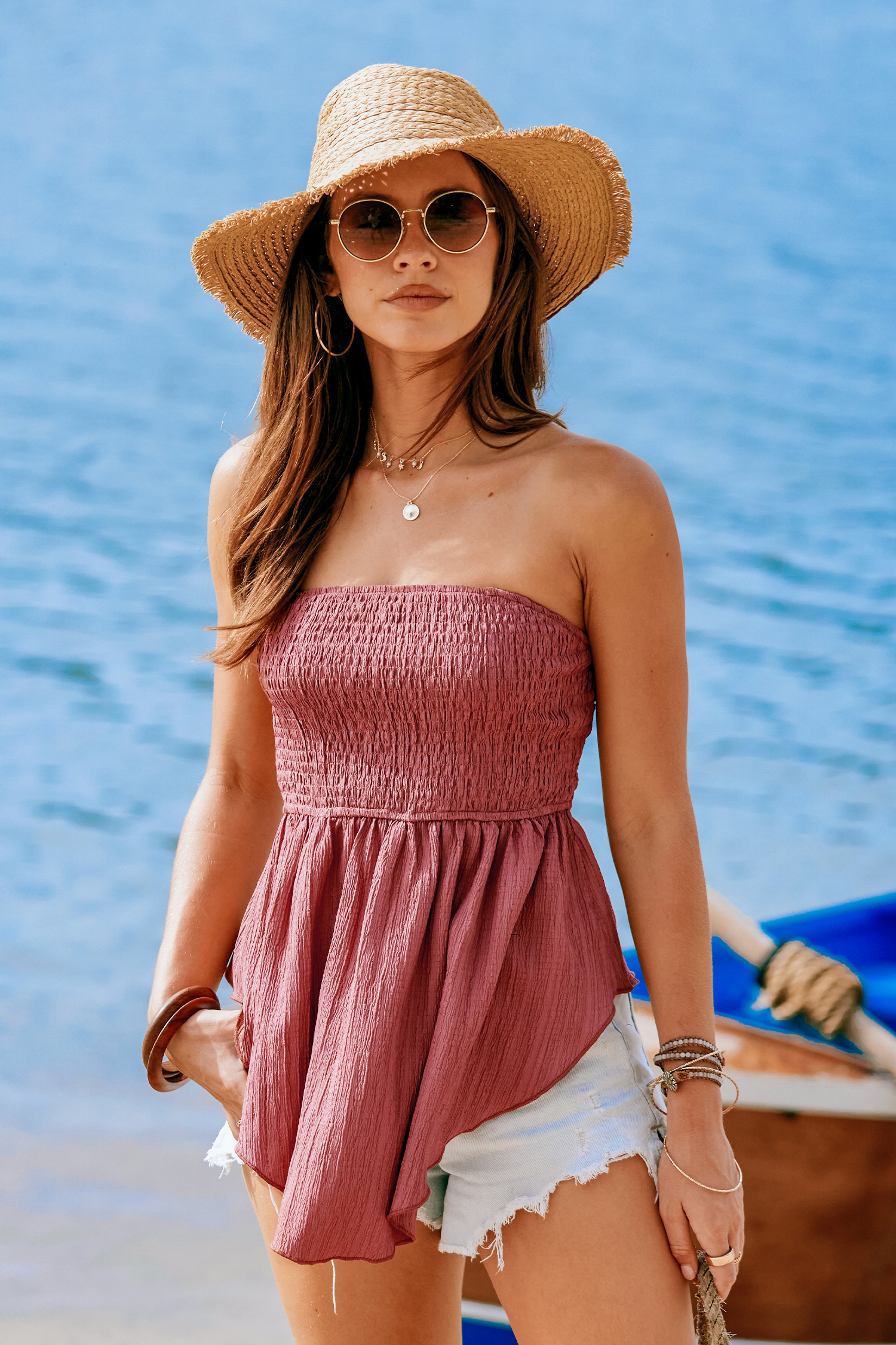 Maroon Smocked Bodice Asymmetrical Hem Tube Top