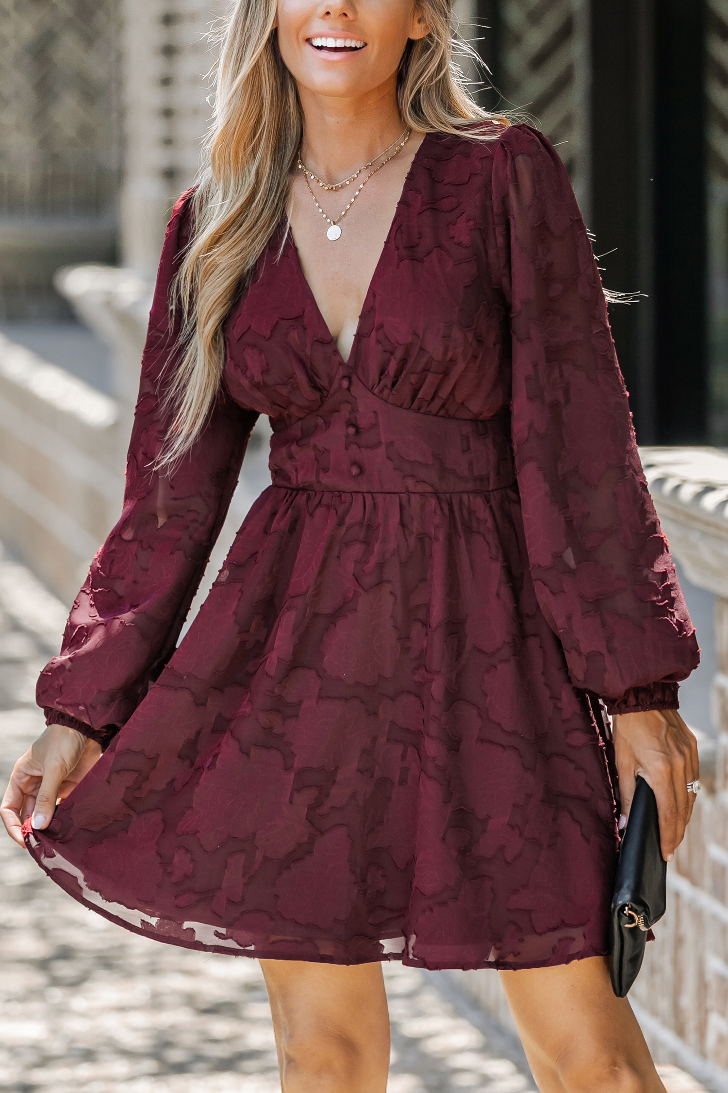 HomeMaroon Textured Floral Lace Mini Dress