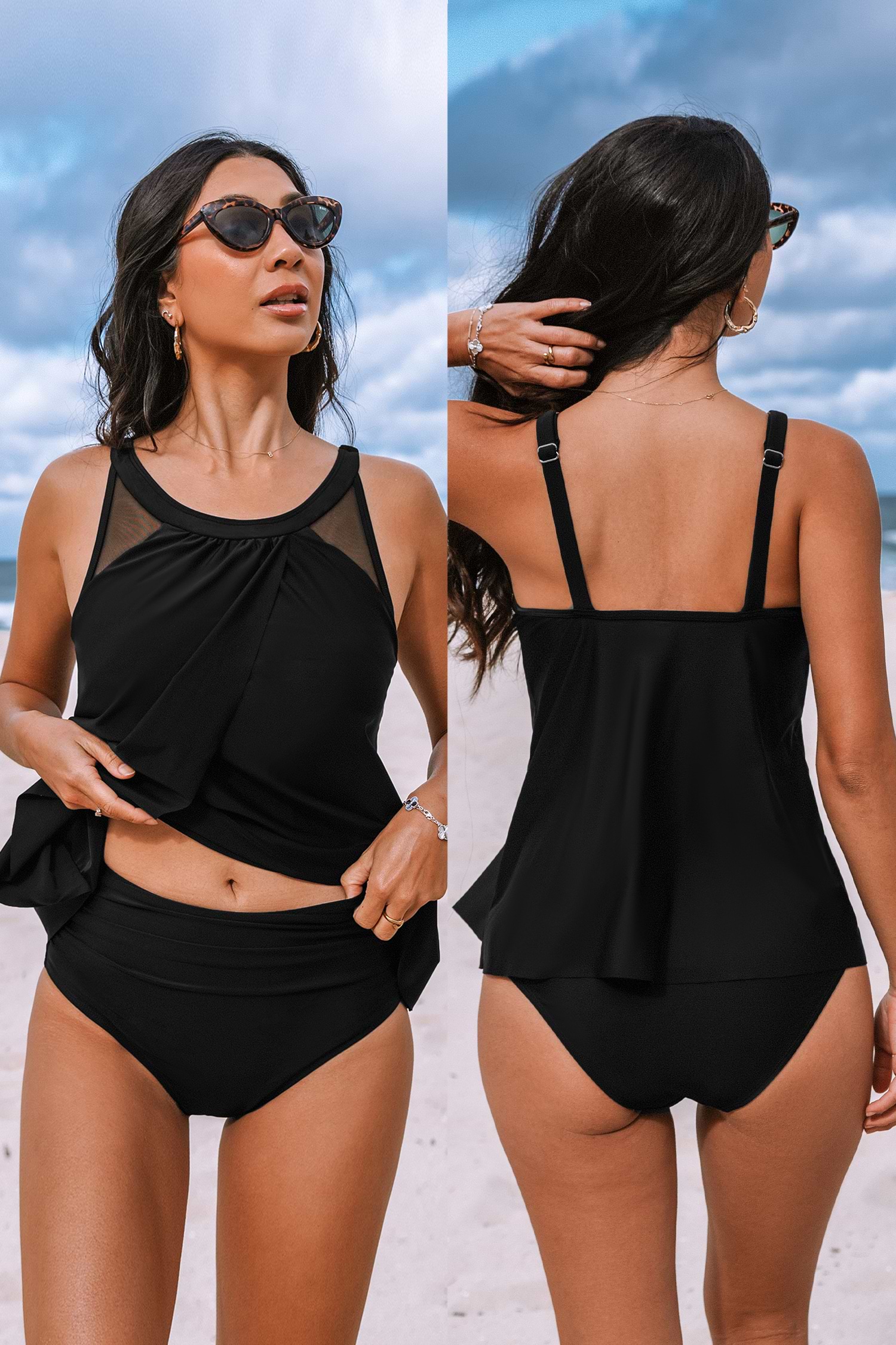 Mesh Round Neck Tankini & Retro Bottoms Set