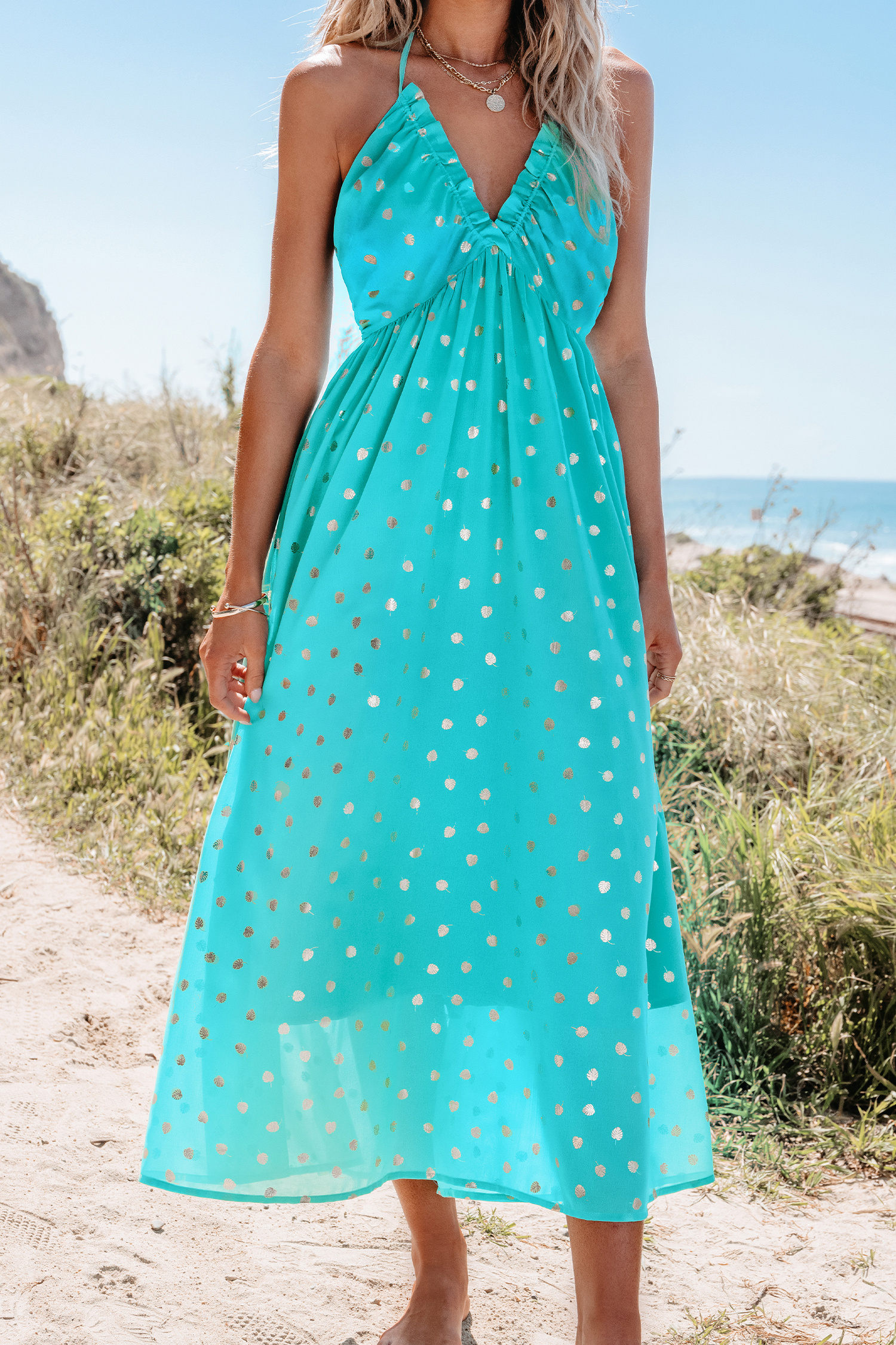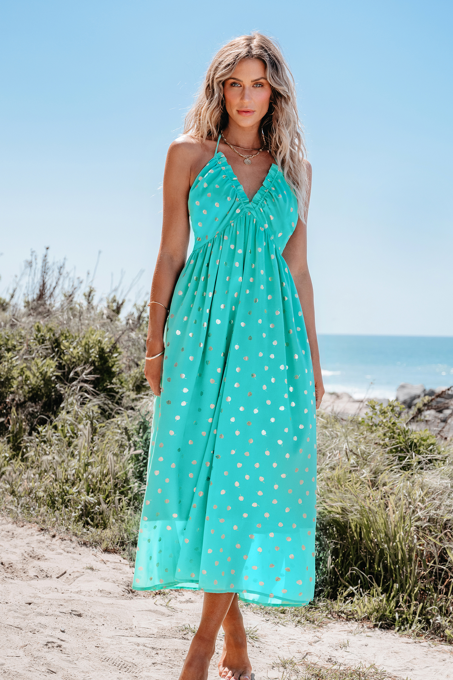 Mint Polka Dot Halterneck Midi Dress
