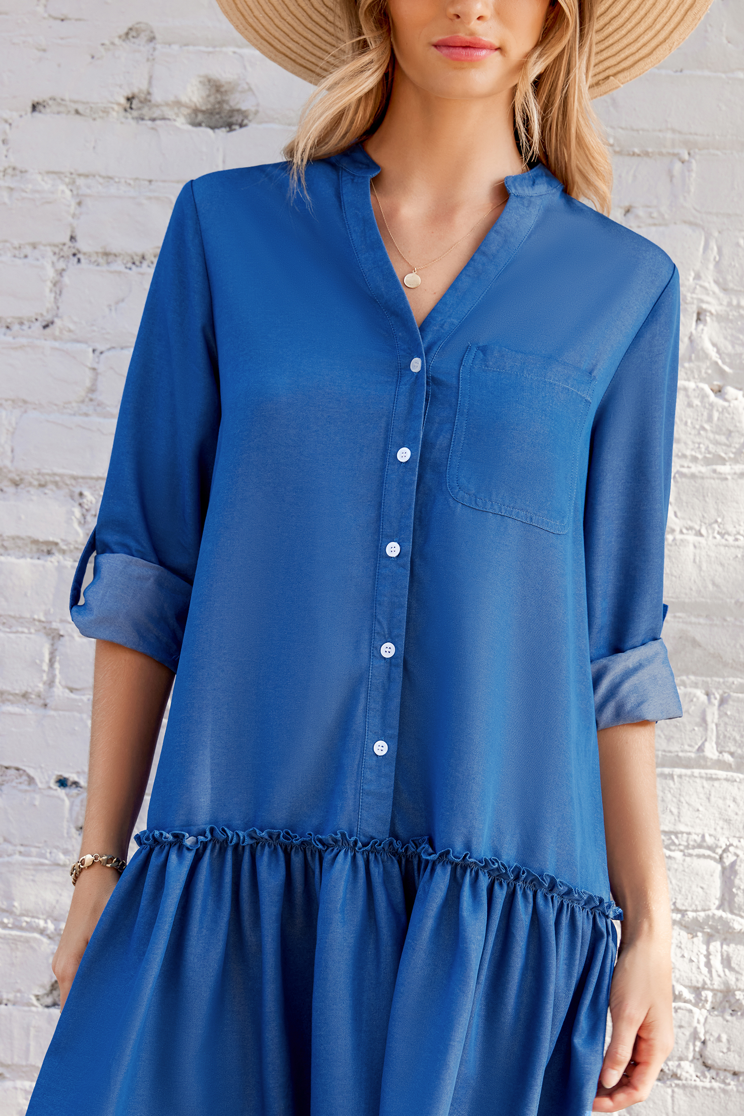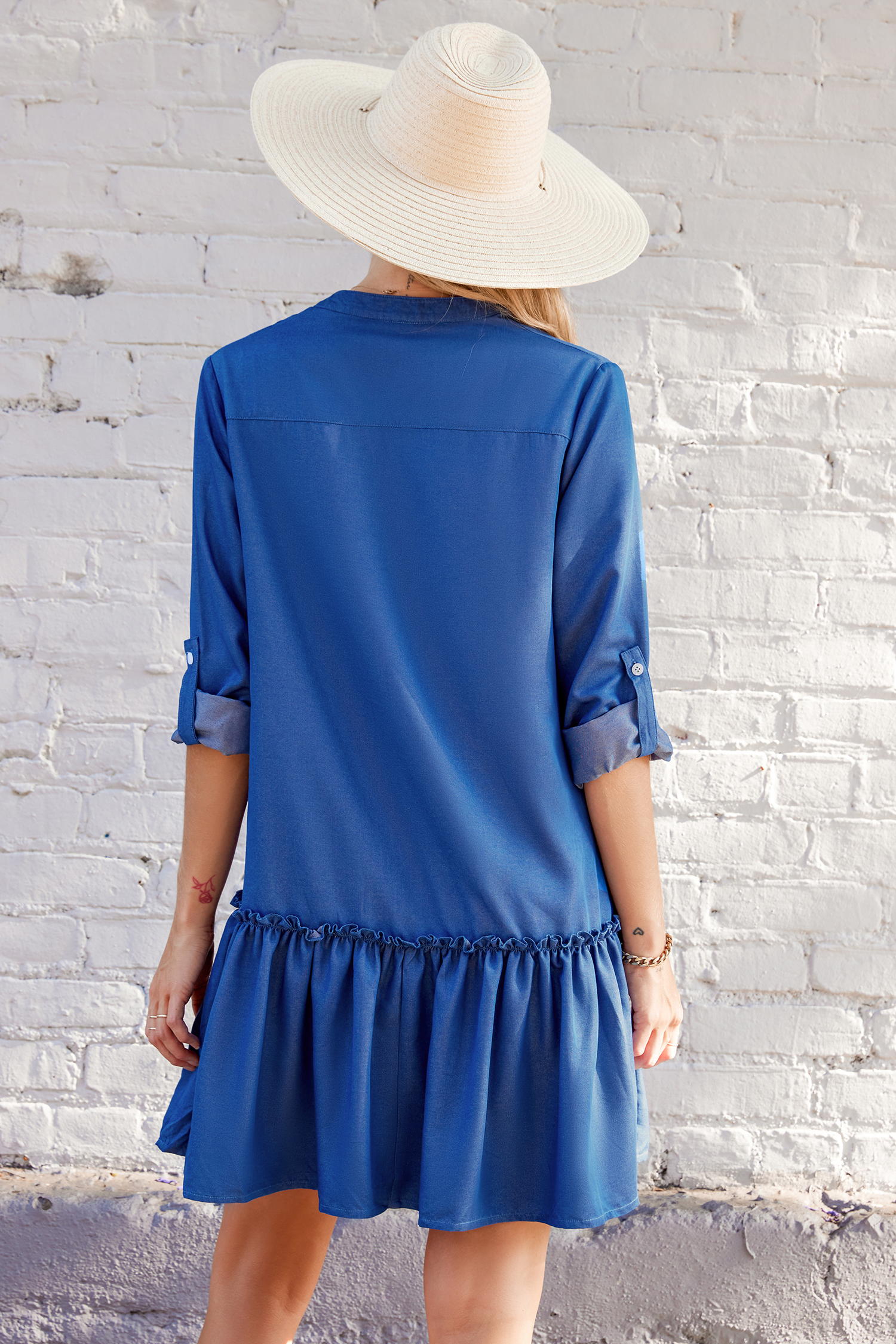 Navy Long Sleeve Drop Waist Ruffle Hem Mini Dress