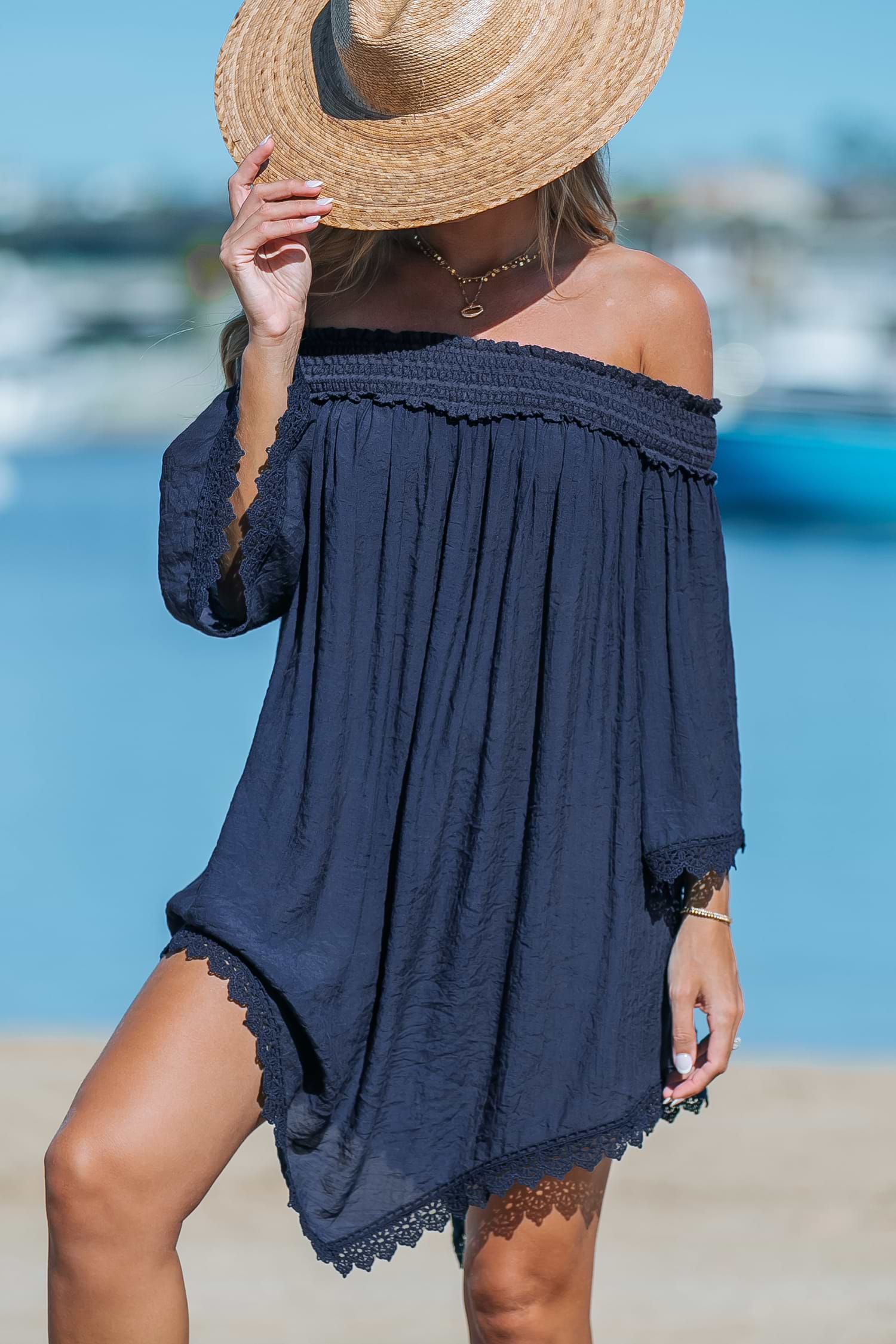 Navy Off Shoulder Asymmetrical Hem Cover-Up Dress