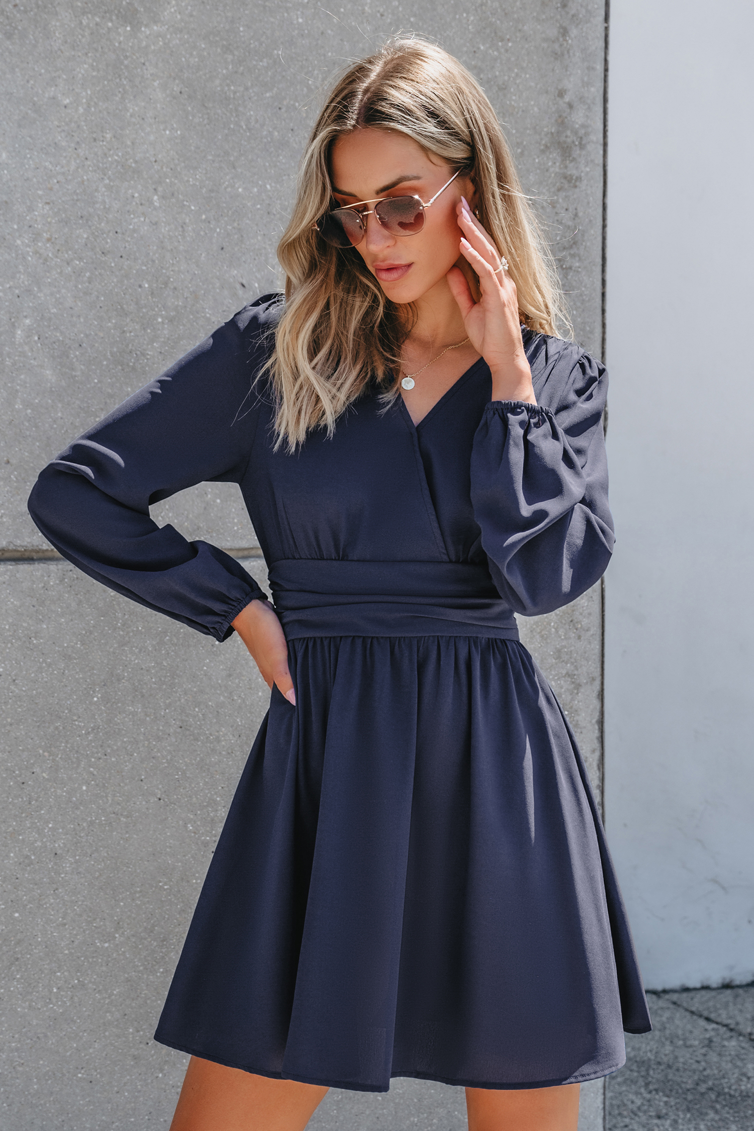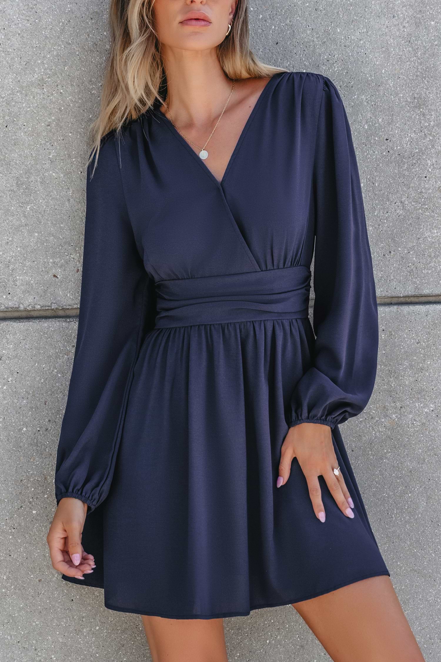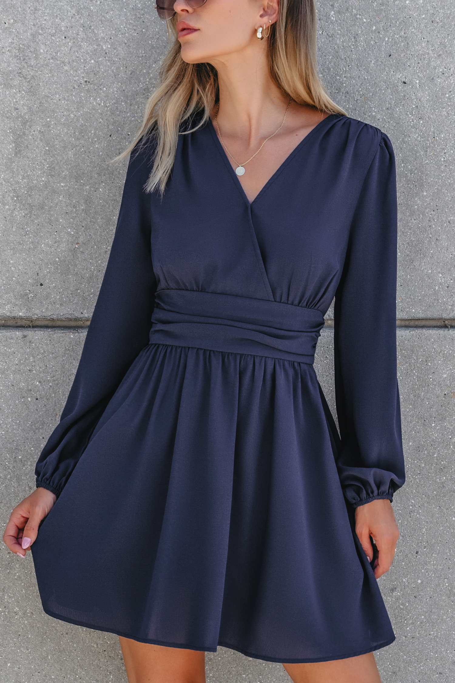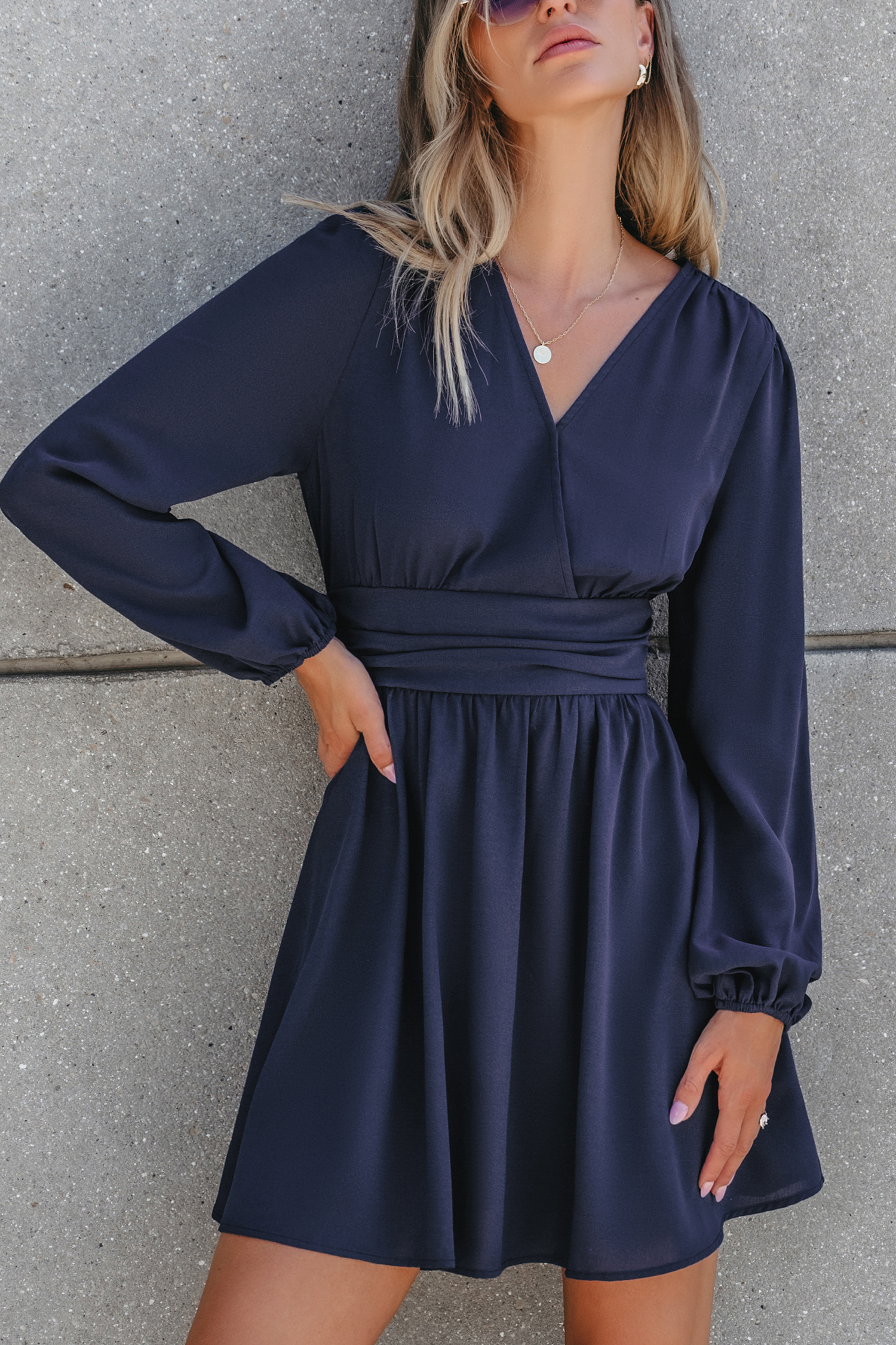 Navy Surplice Blouson Sleeve Ruched Waist Mini Dress