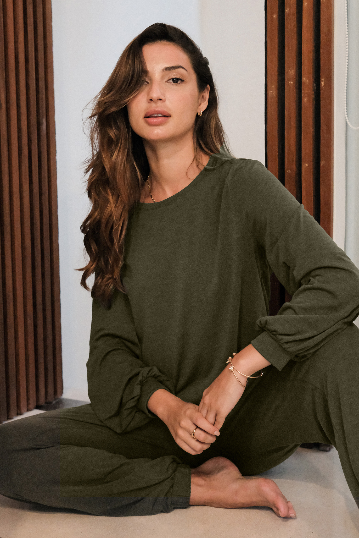 Olive Green Long Sleeve Top & Tapered Pajama Bottoms Set