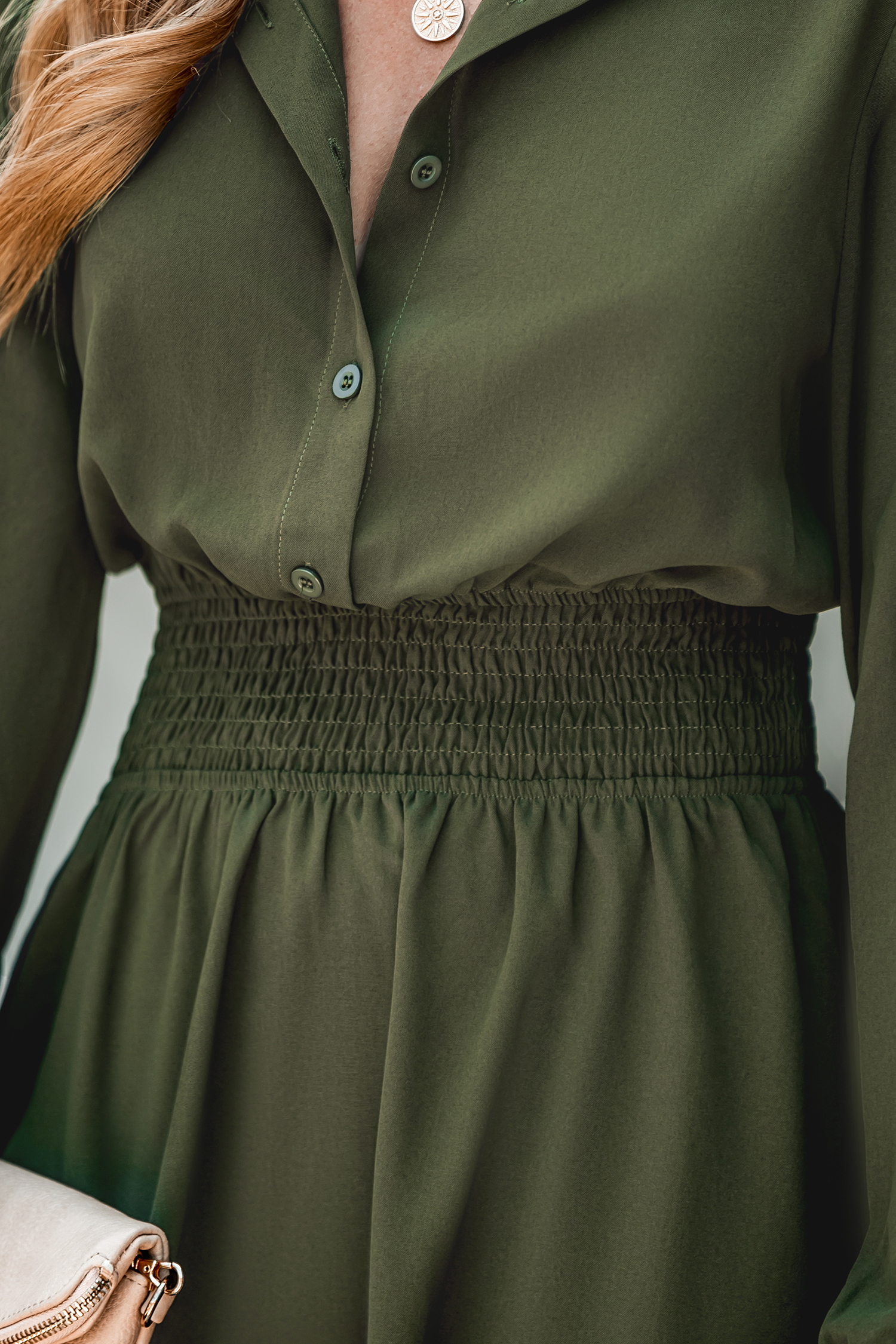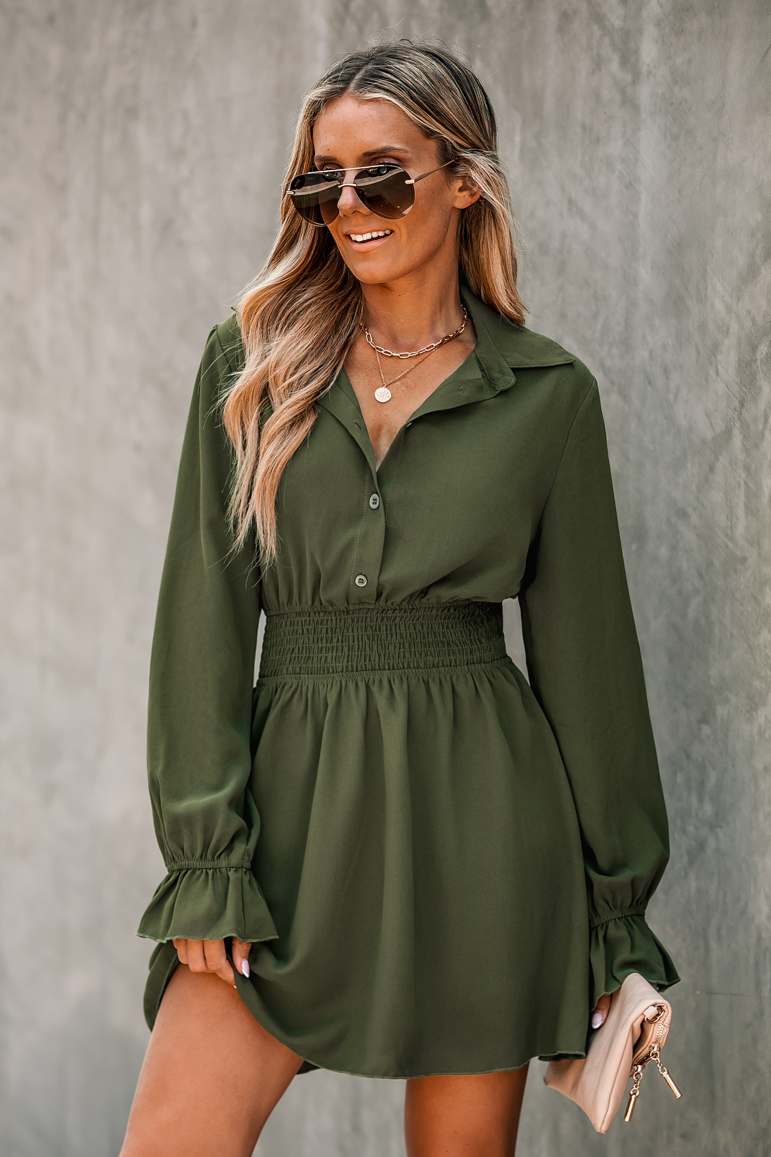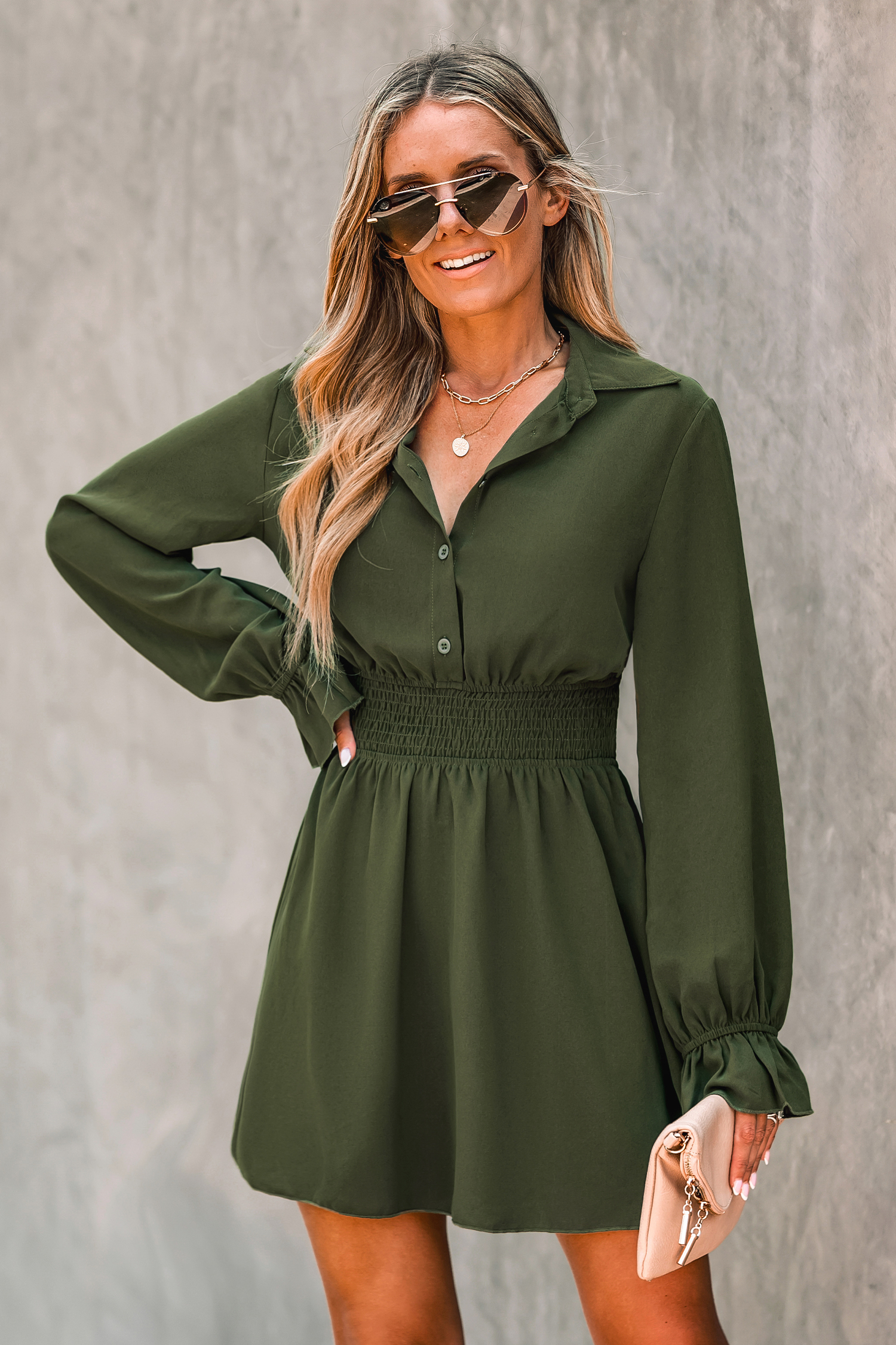 Olive Green Smocked Button-Front Mini Dress