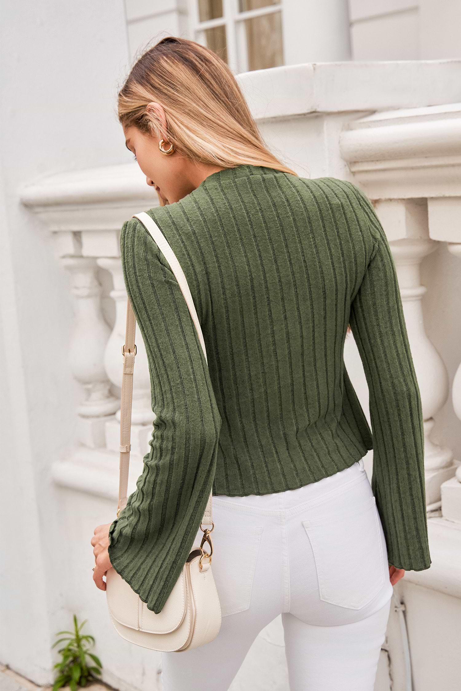 Olive Ribbed Knit V-Neck Long Sleeve Top