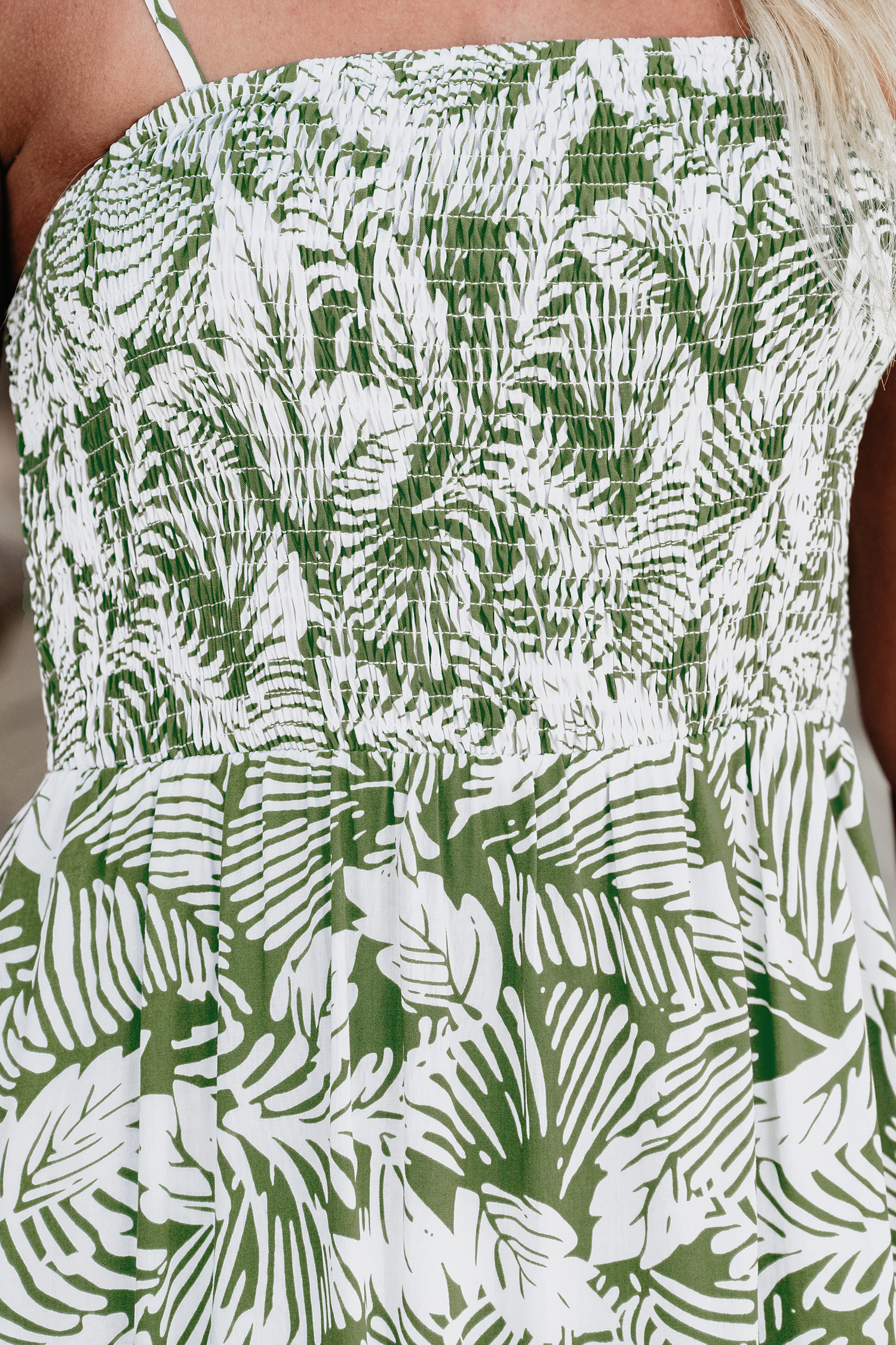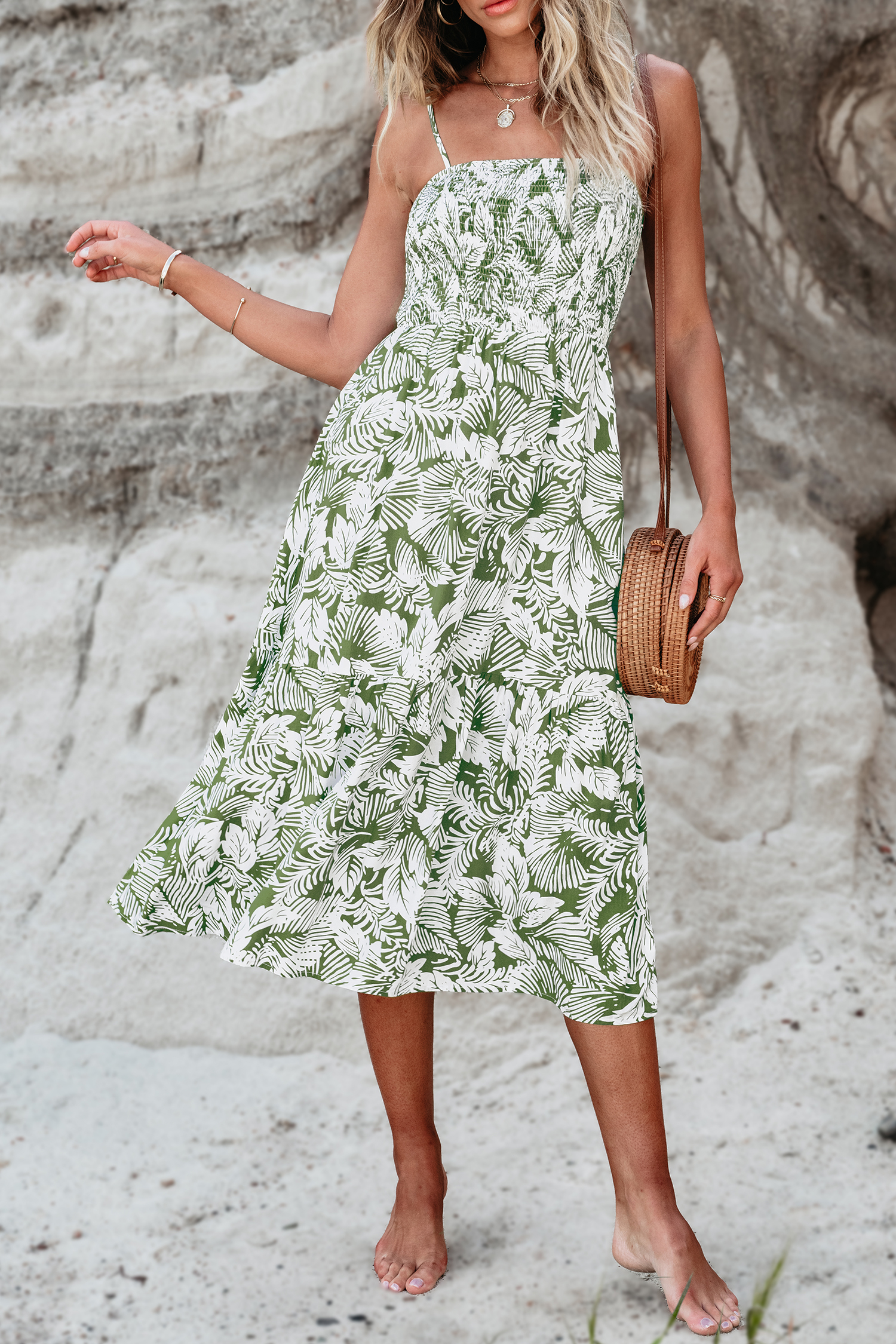 Olive Tropical Square Neck Smocked Bodice Midi Dress