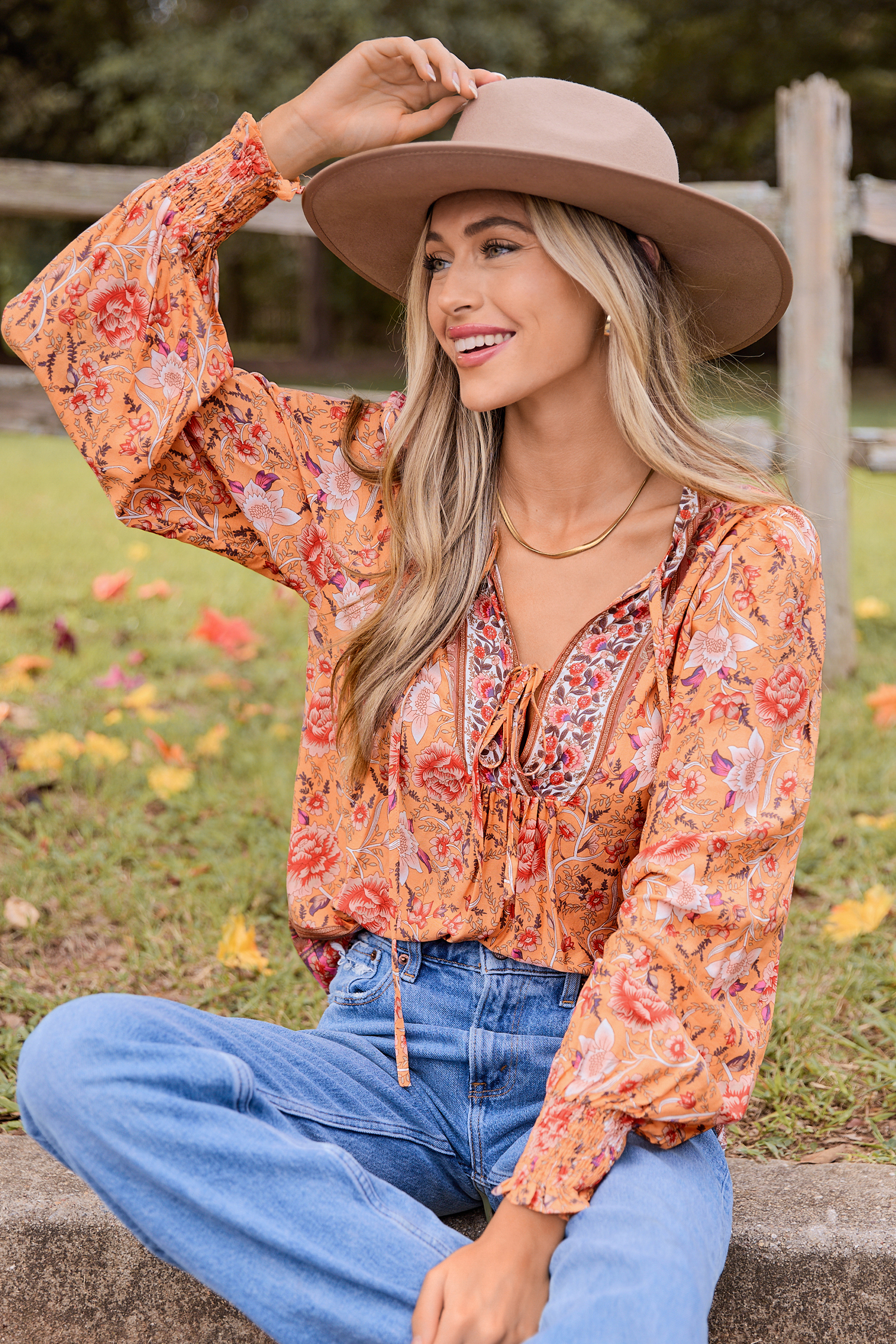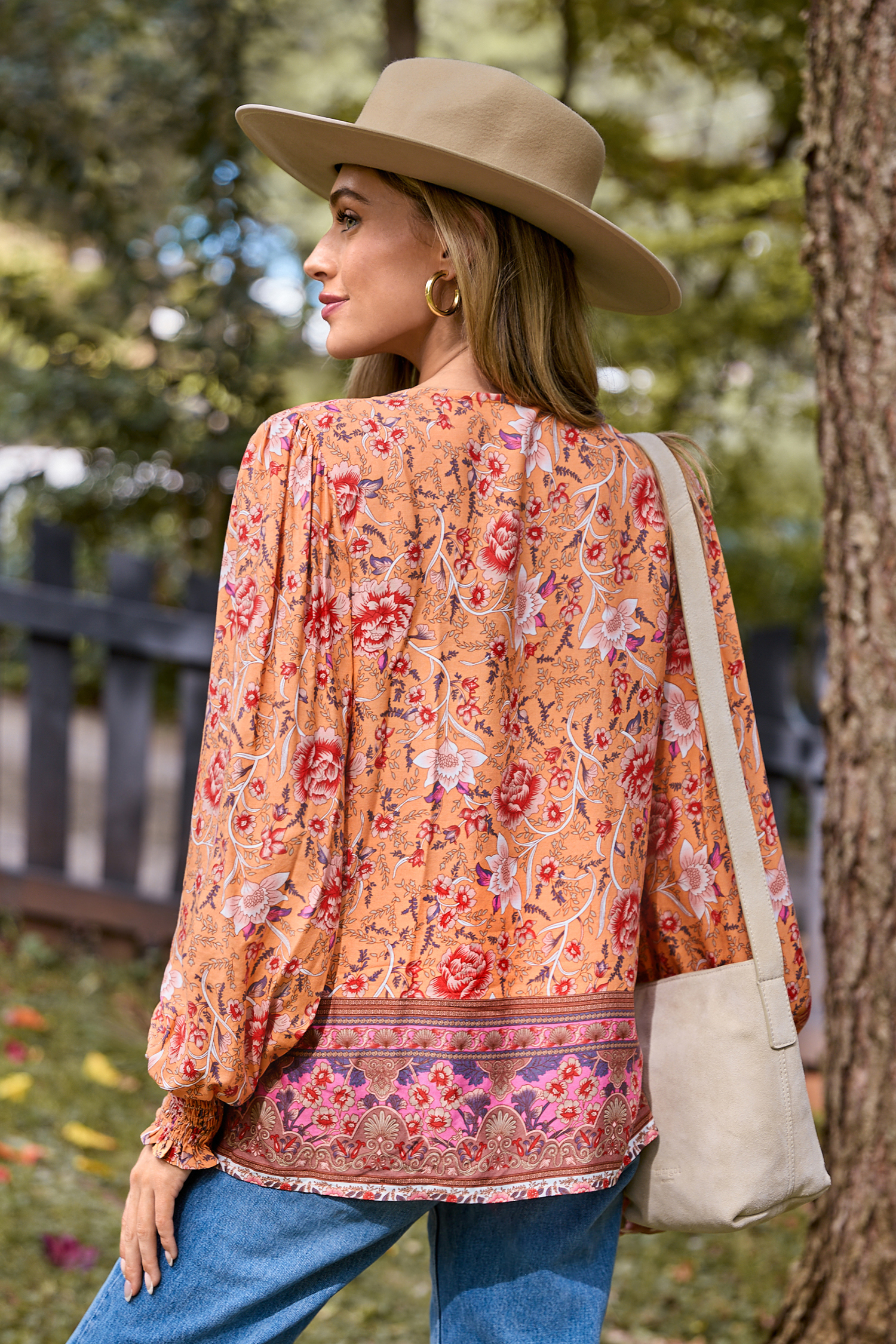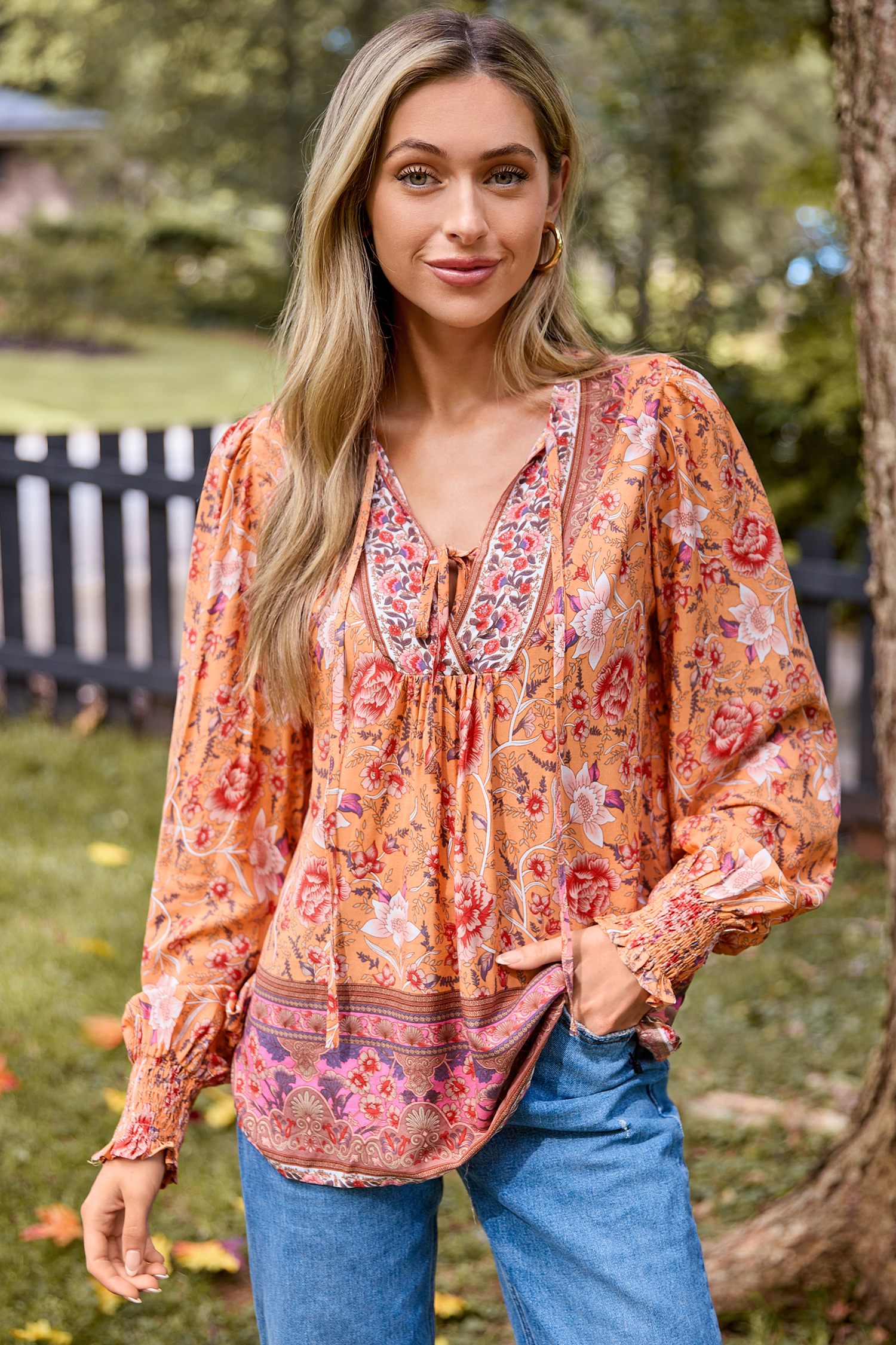 Orange Floral Split Tie Neck Blouson Sleeve Top