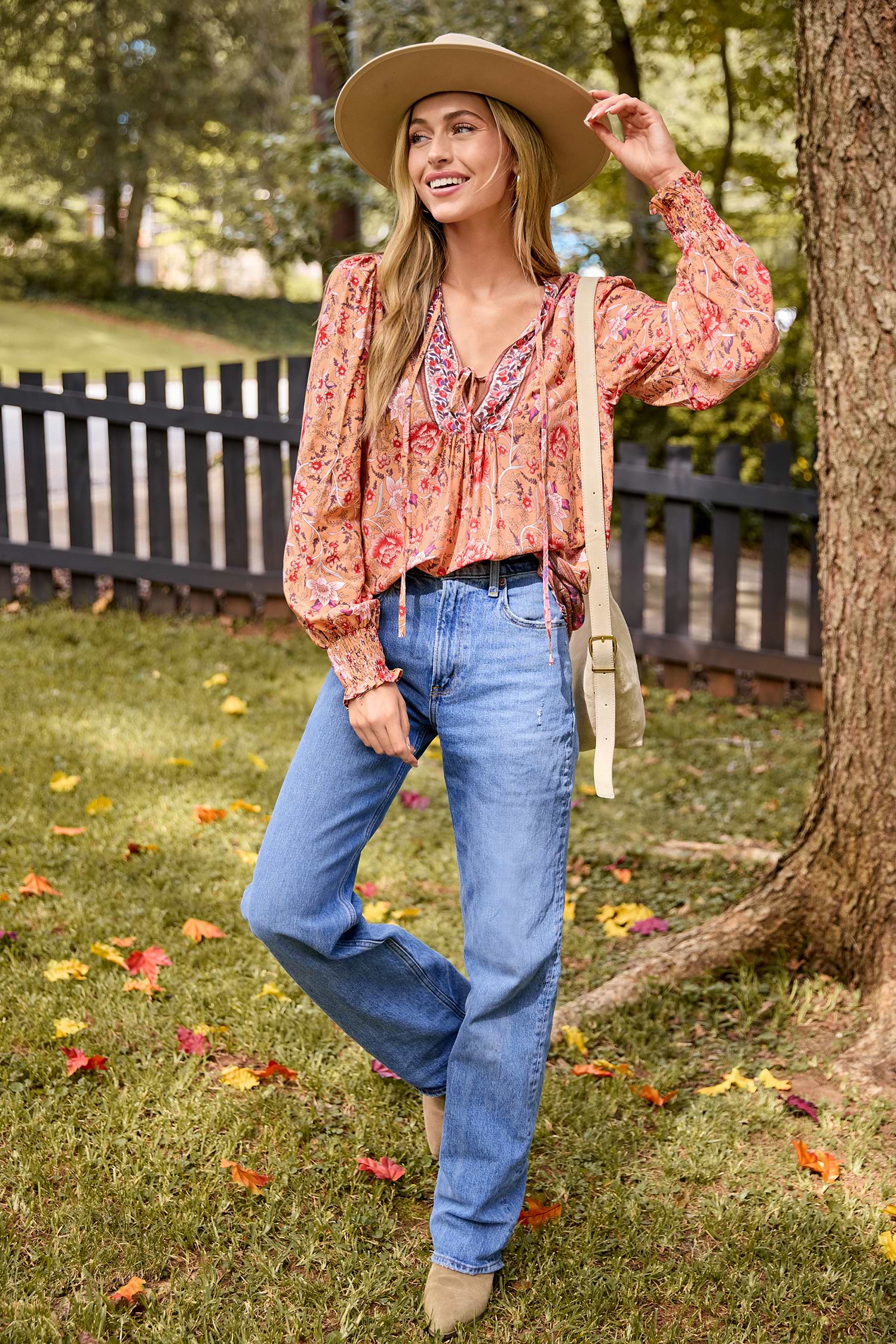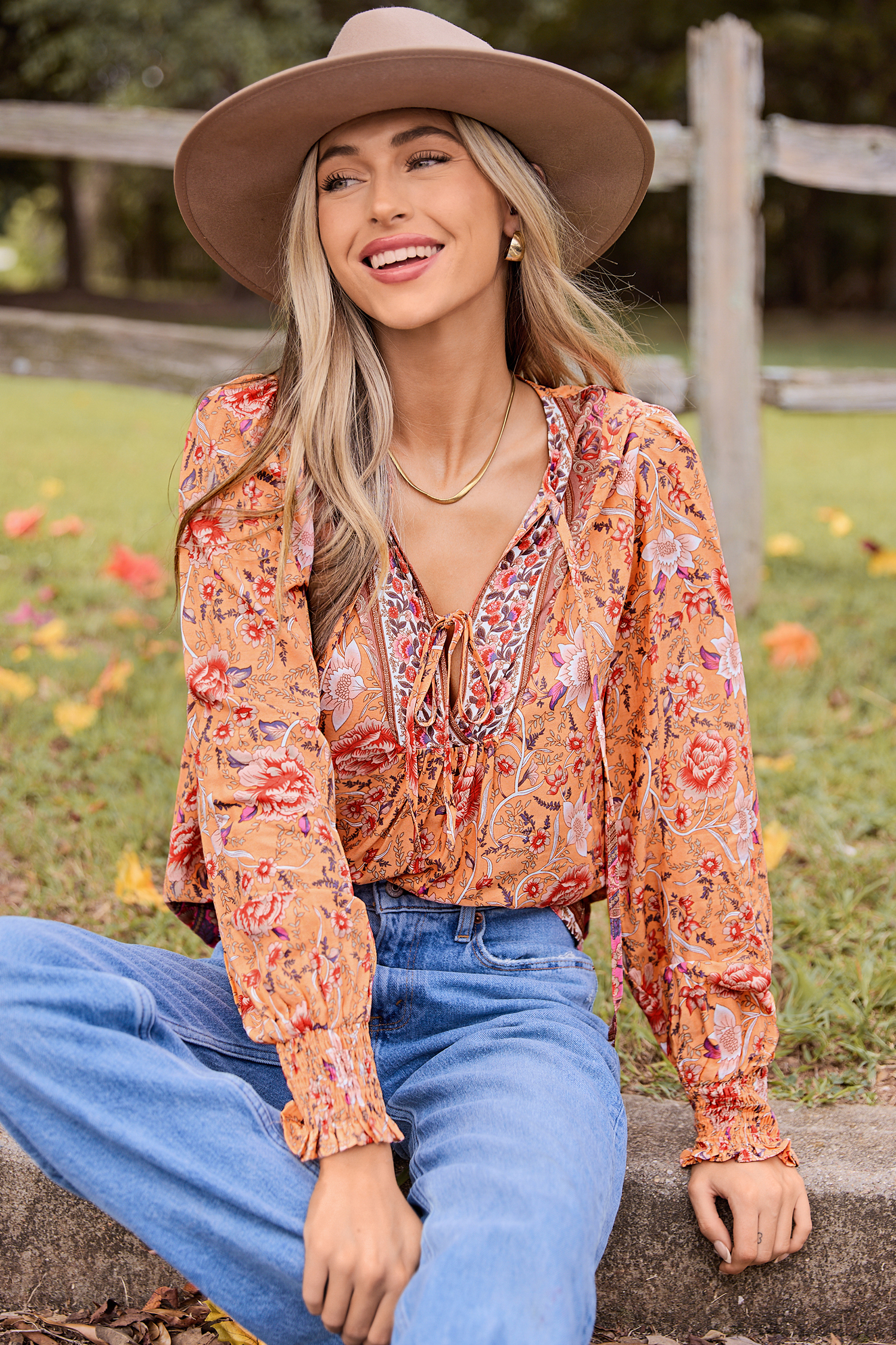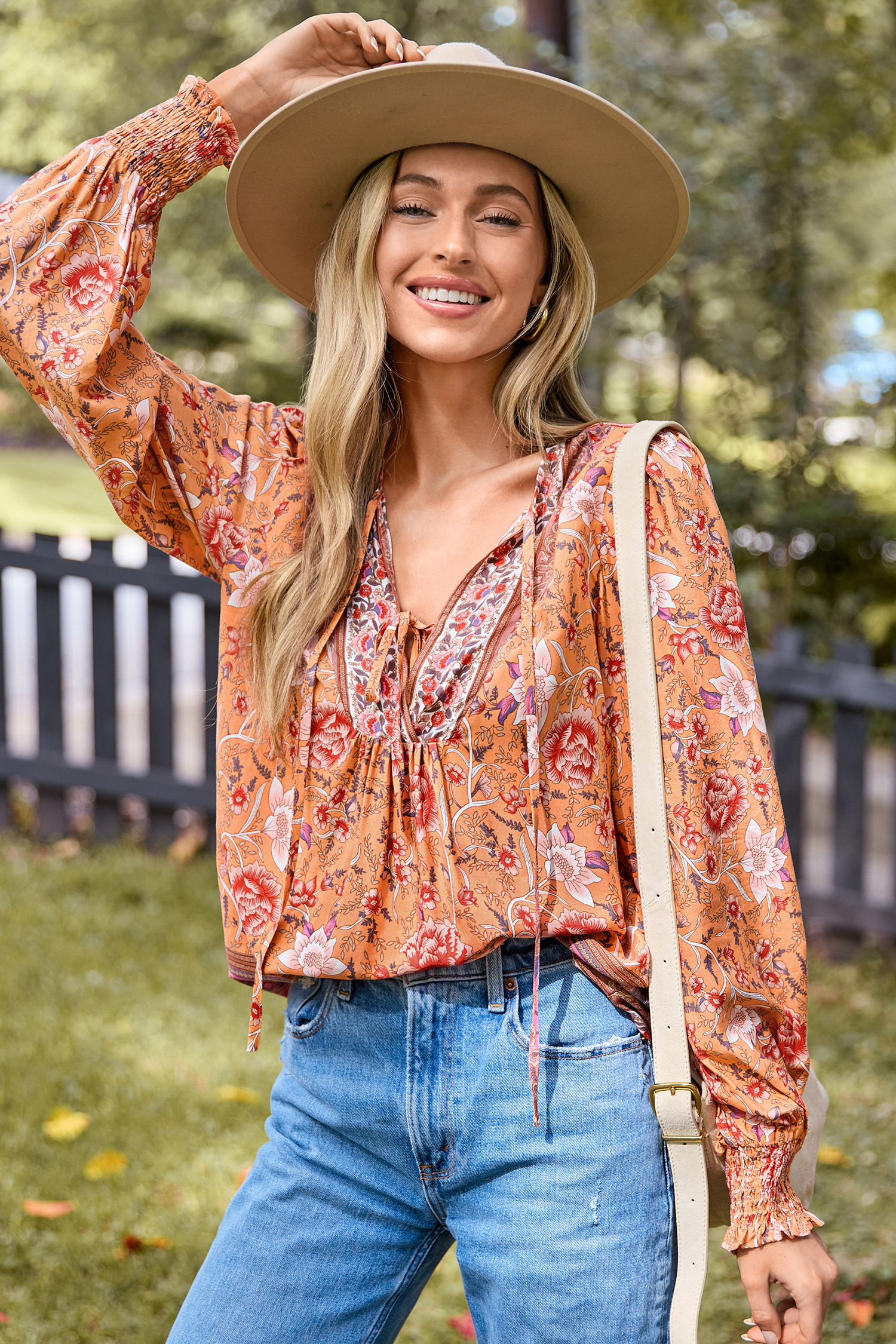 Orange Floral Split Tie Neck Blouson Sleeve Top