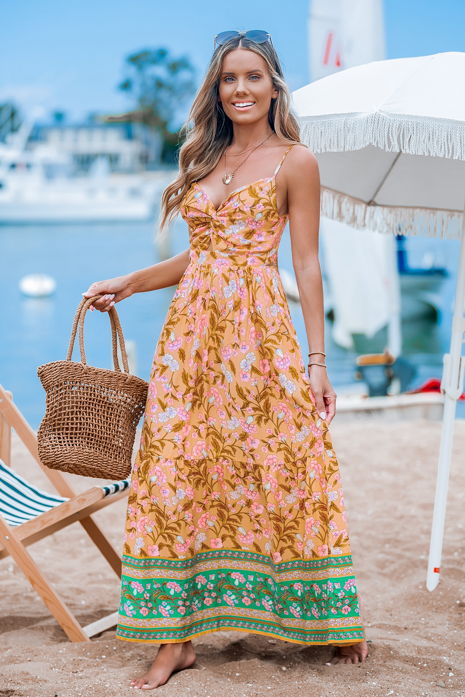 Orange Floral Sweetheart Twist & Keyhole Maxi Dress