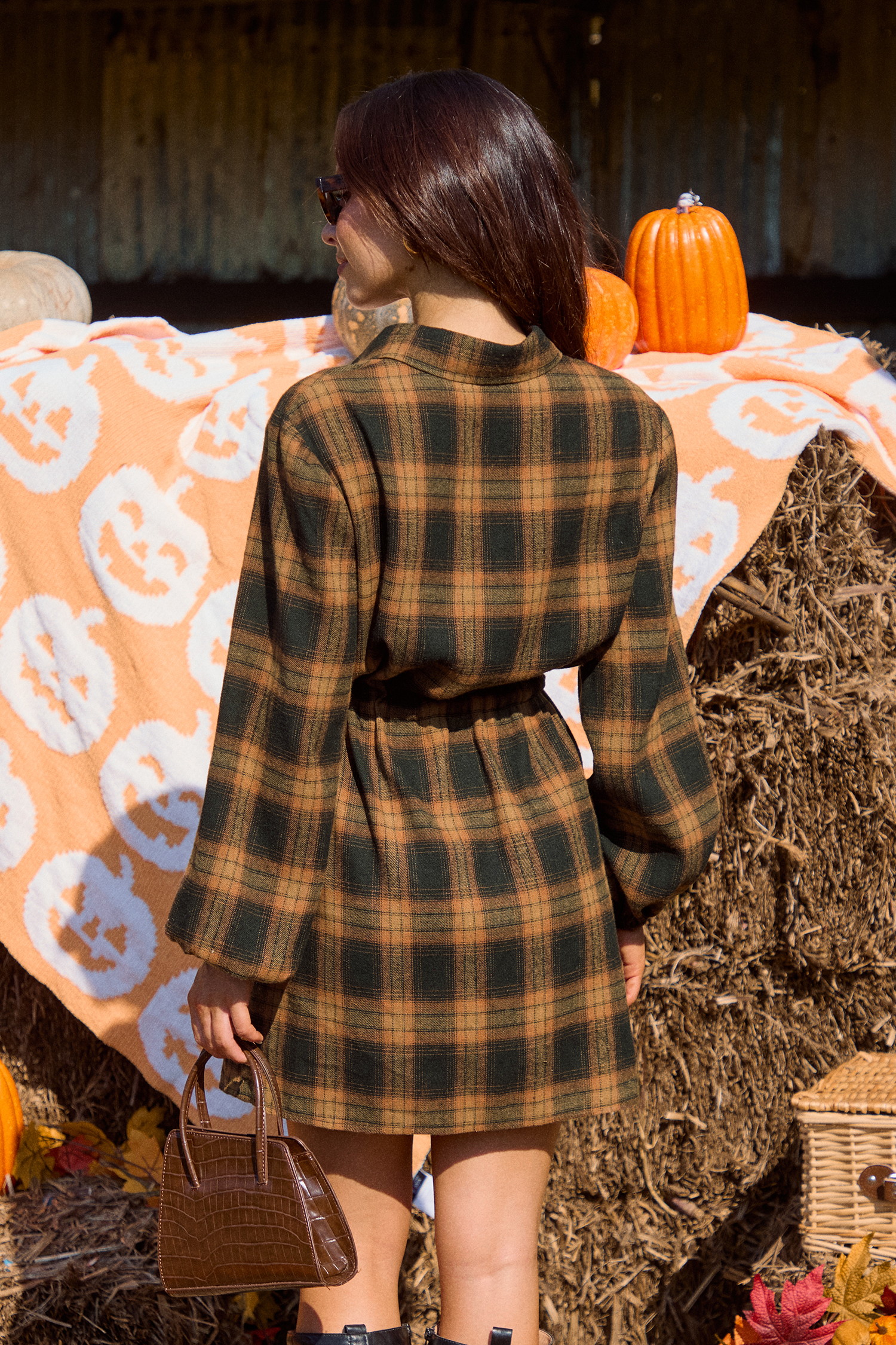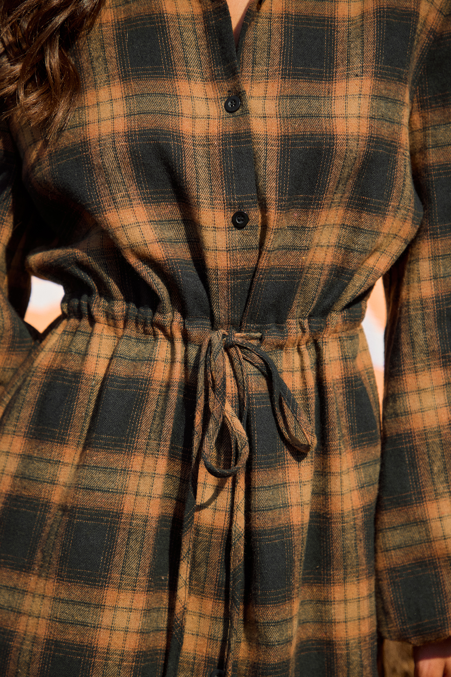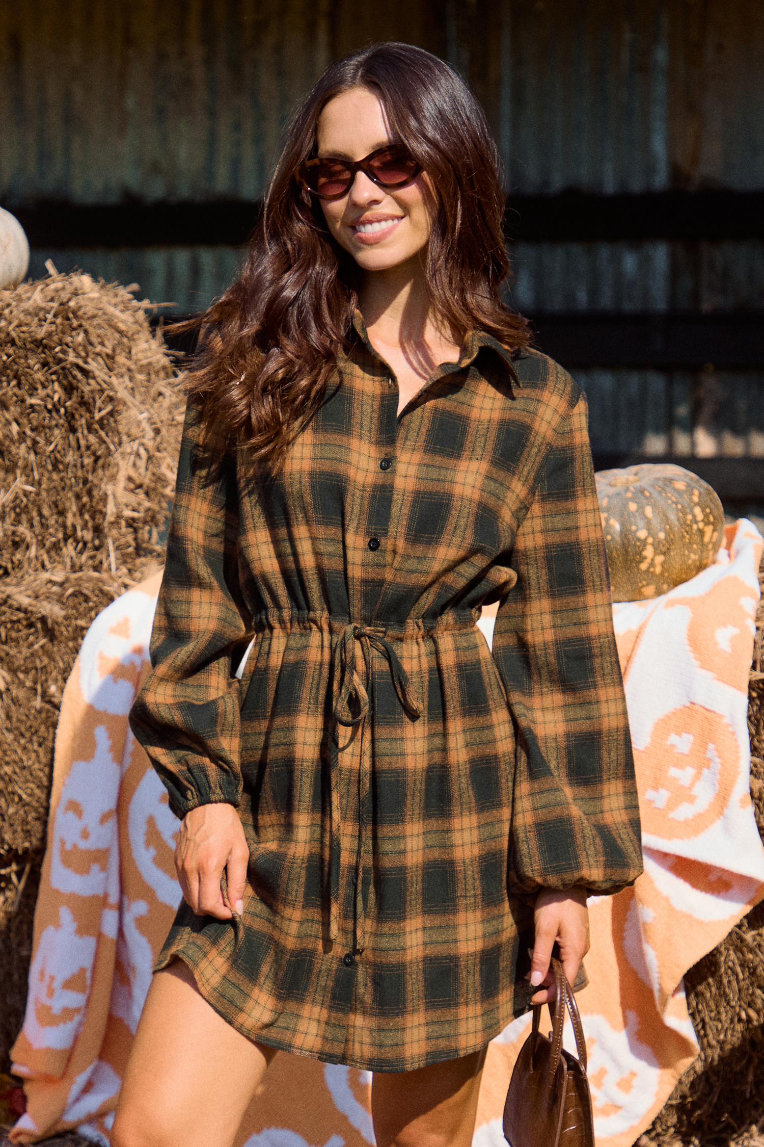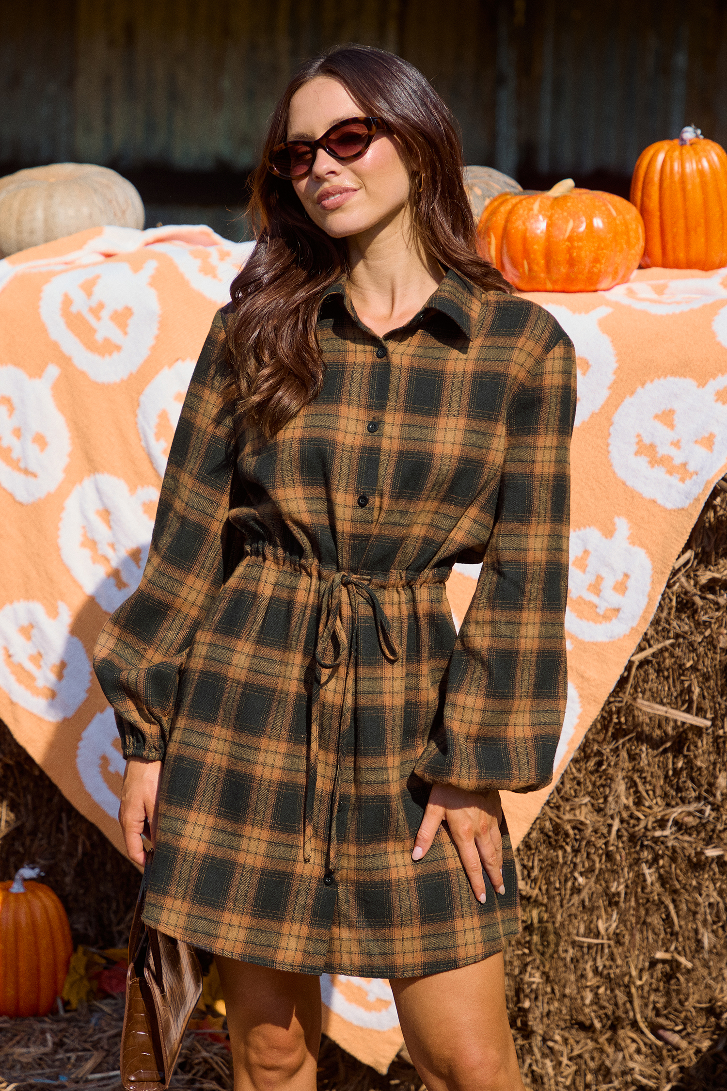 HomeOrange Plaid Collared Long Sleeve Button Up Mini Shirt Dress