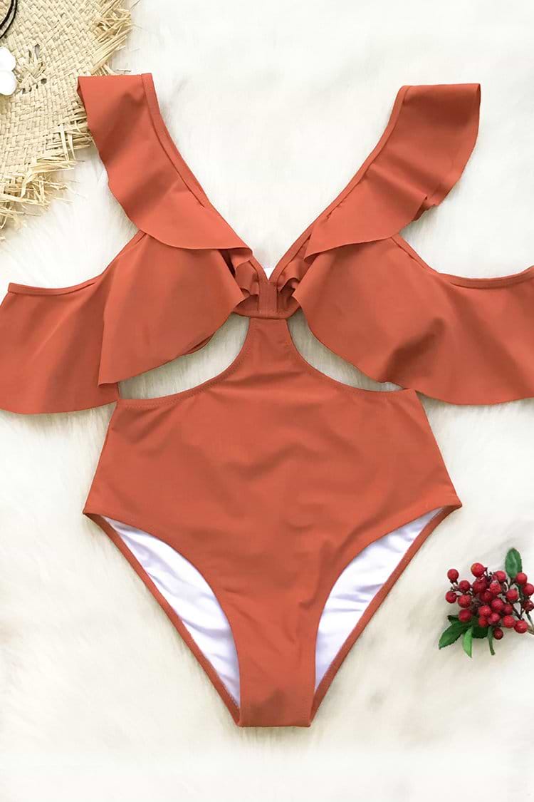 HomeOrange Ruffled Cold Shoulder One-Piece Swimsuit