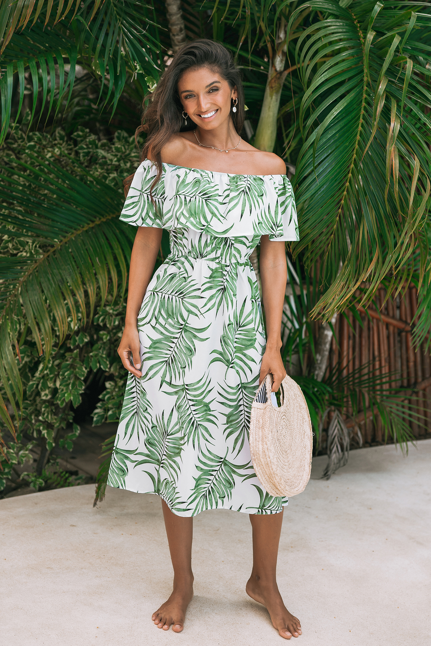 HomePalm Leaf Off-Shoulder Flounce Bodice Maxi Dress