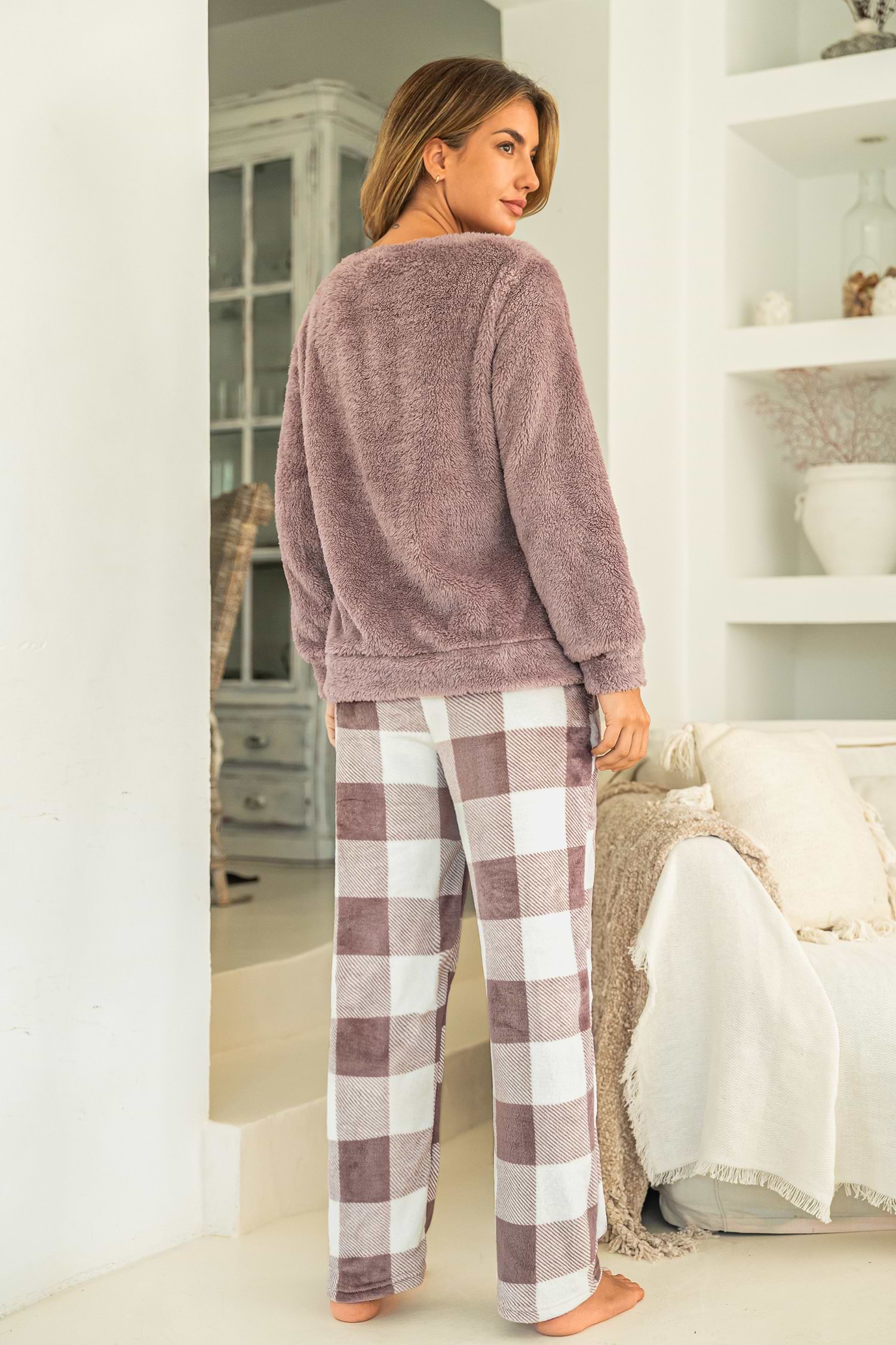 HomePink Fuzzy Knit Sweater & Plaid Pants Pajama Set