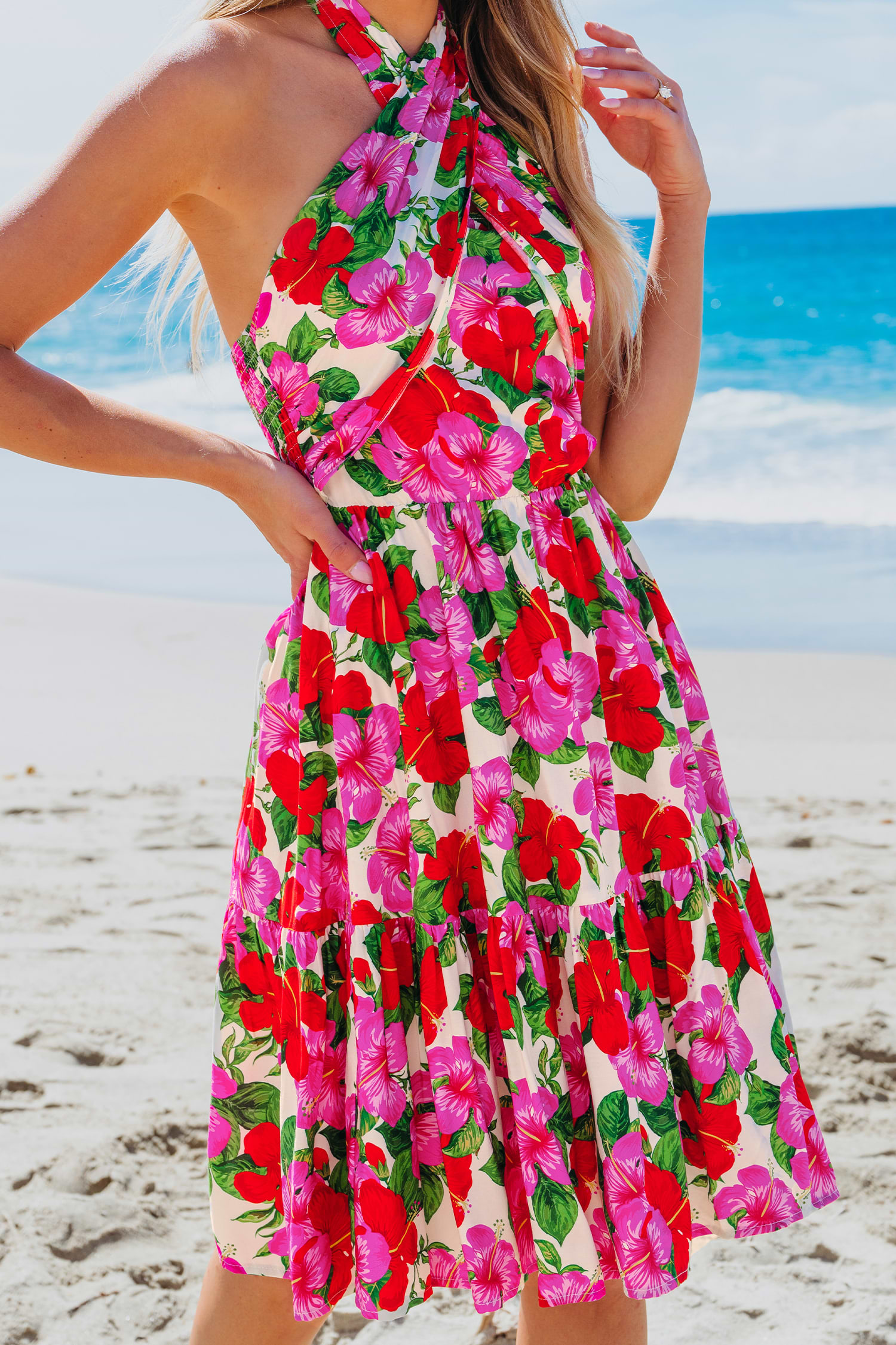 Pink & Red Floral Crossover Halterneck Mini Dress