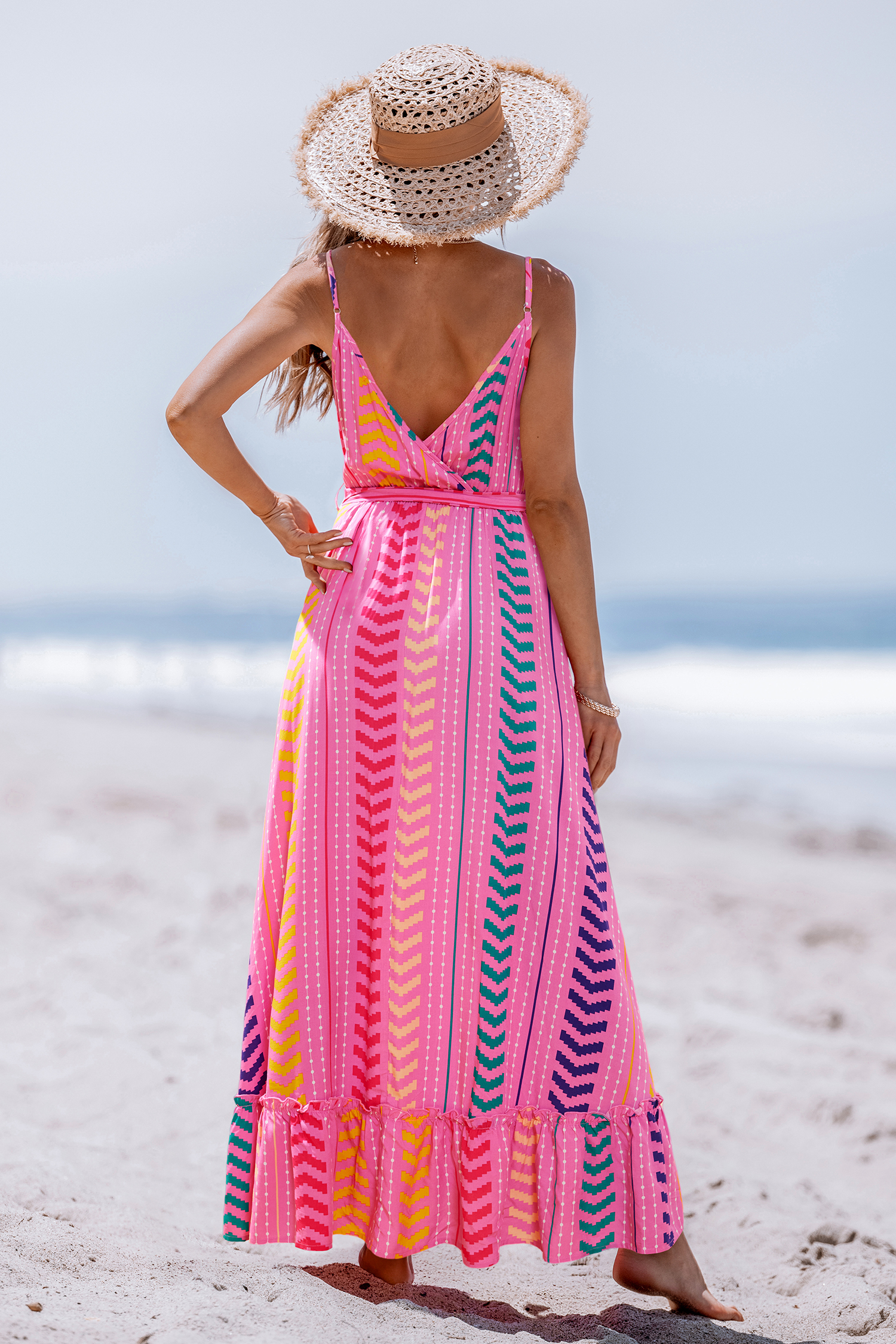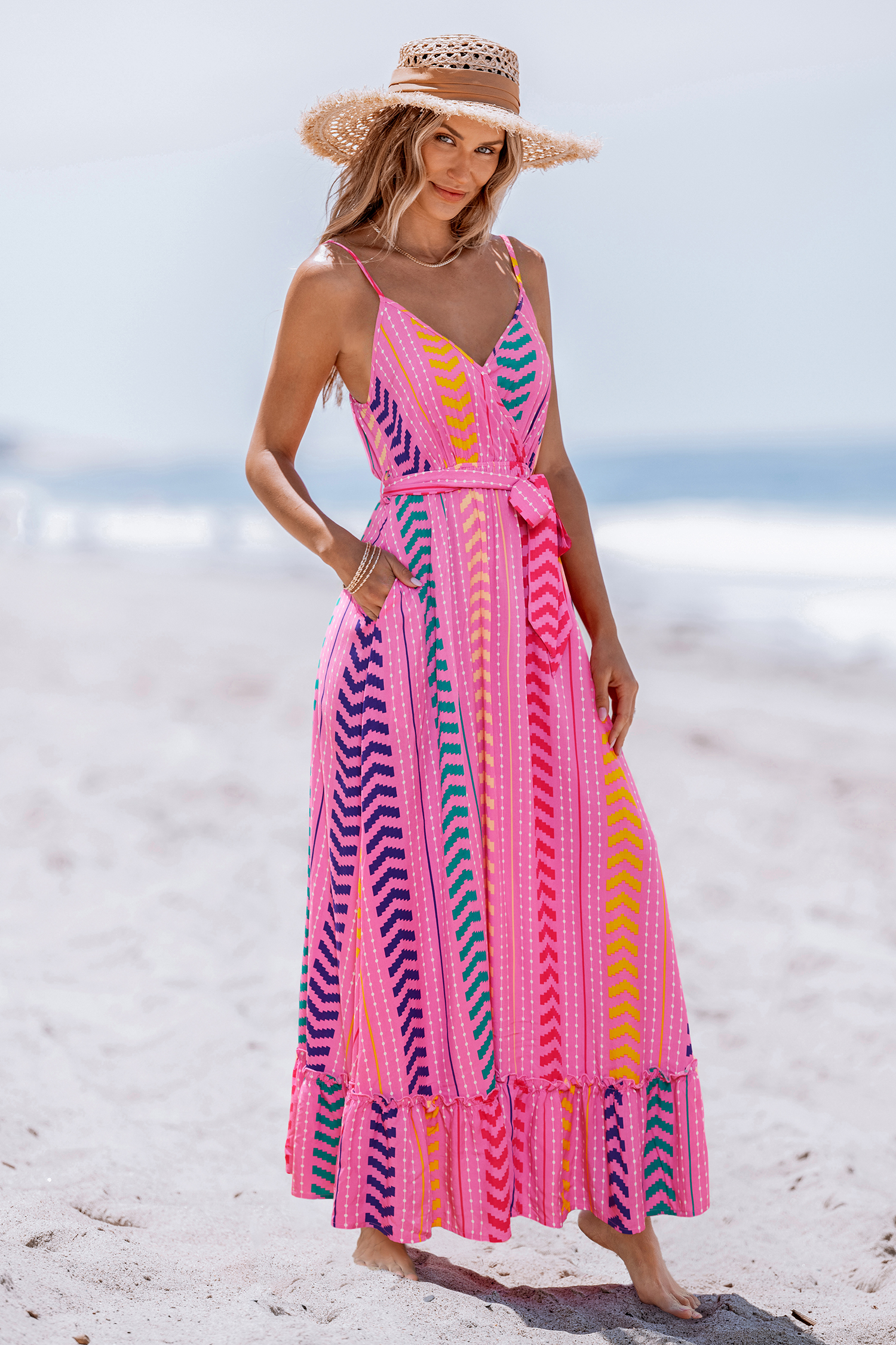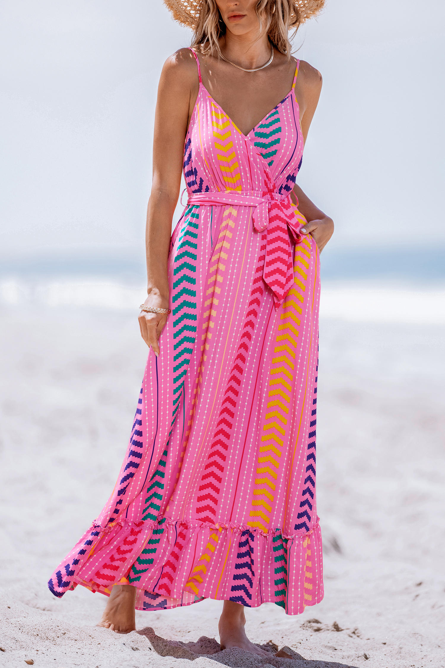 Turn heads with our Pink V-Neck Belted Maxi Dress. Featuring a geo print, v neckline, and a flattering belt, this dress combines style and tropical flair.