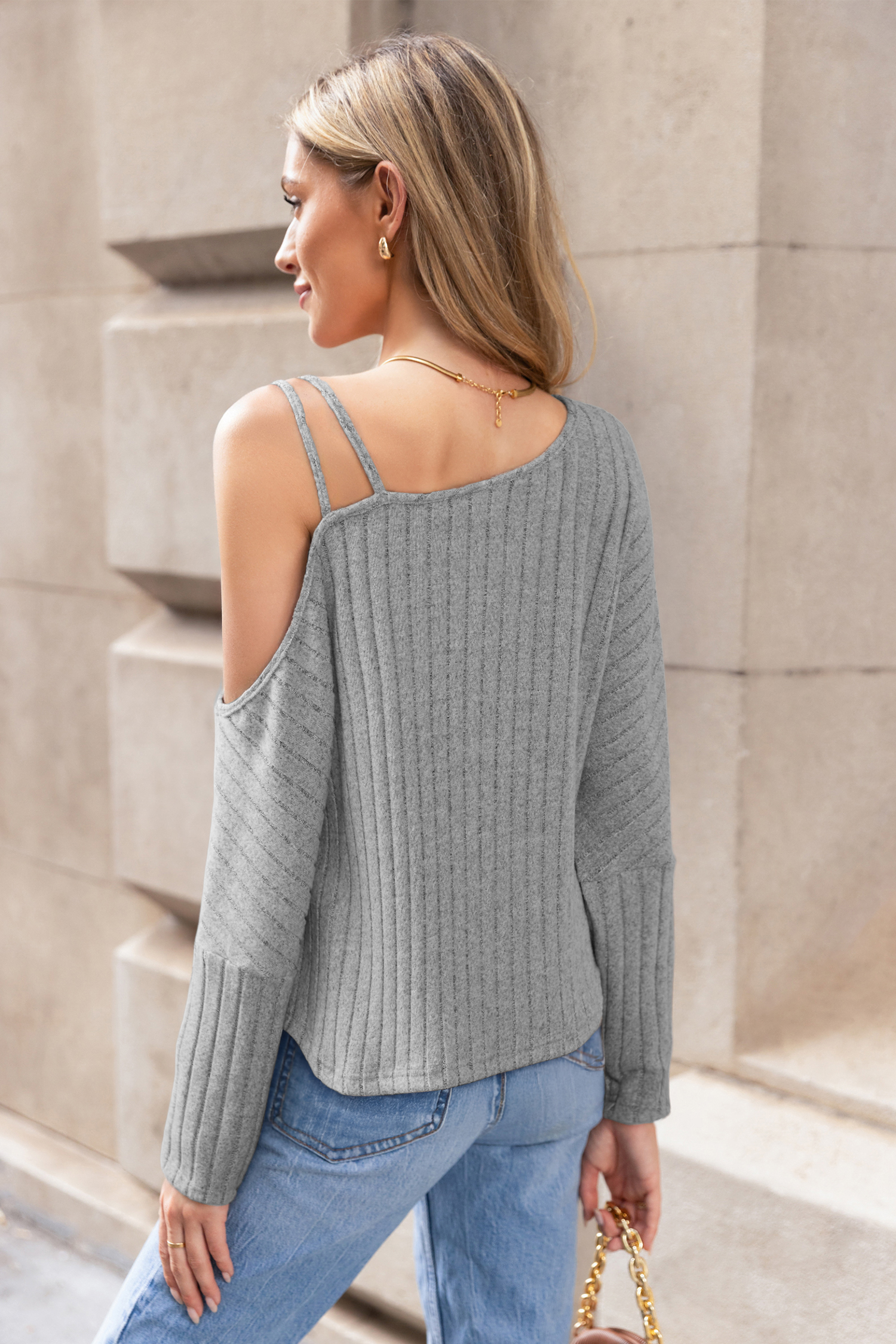 Grey One-Shoulder Knotted Ribbed Knit Top