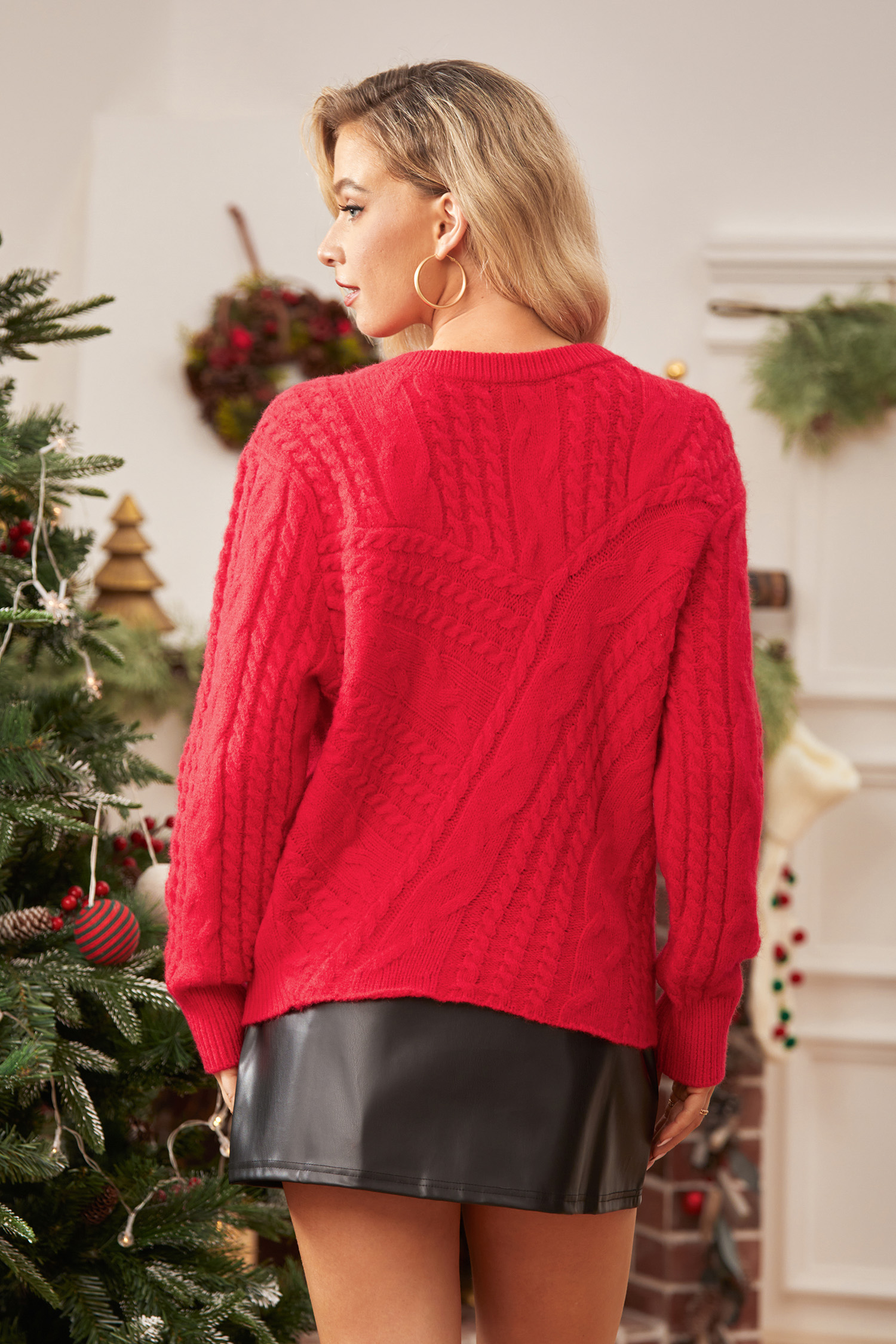 Red Long Sleeve Cable Knit Crewneck Sweater