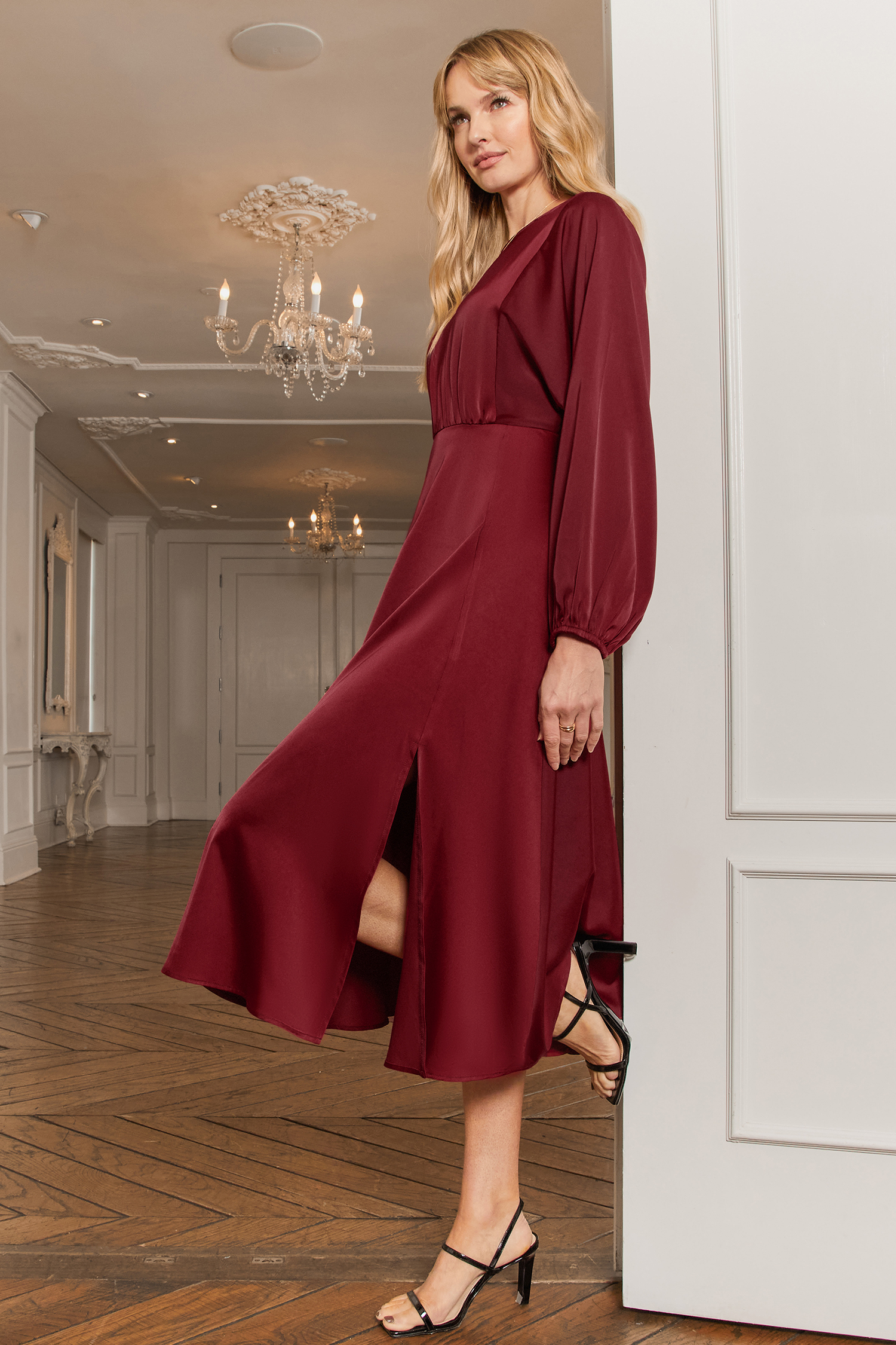 HomeRed Satin Boatneck Puff Sleeve Maxi Dress