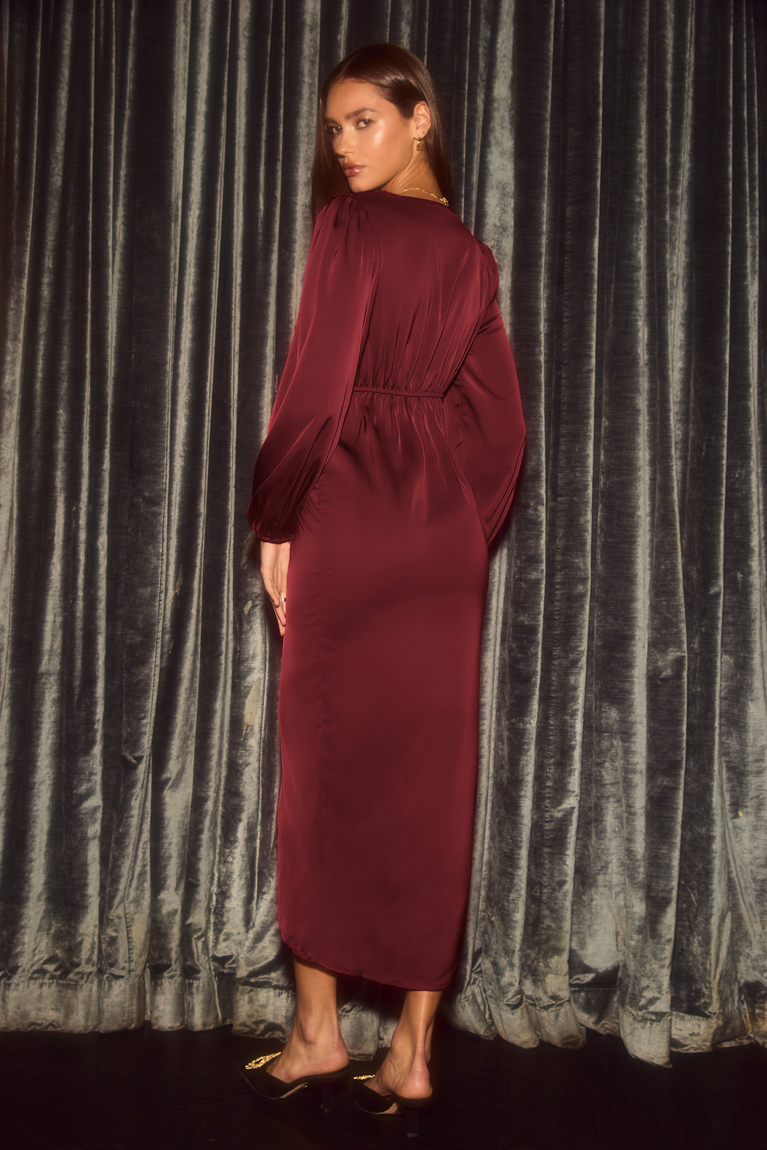 Burgundy Satin Surplice Draped Tulip Hem Midi Dress