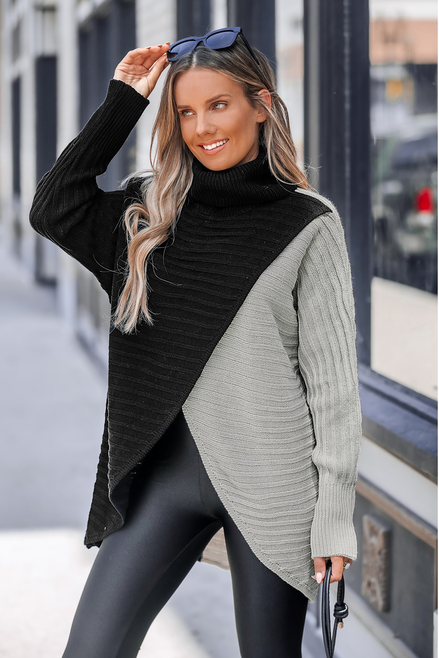HomeRibbed Knit Asymmetric Colorblock Turtleneck Sweater