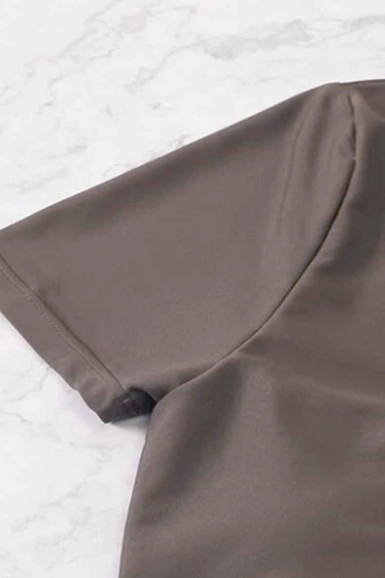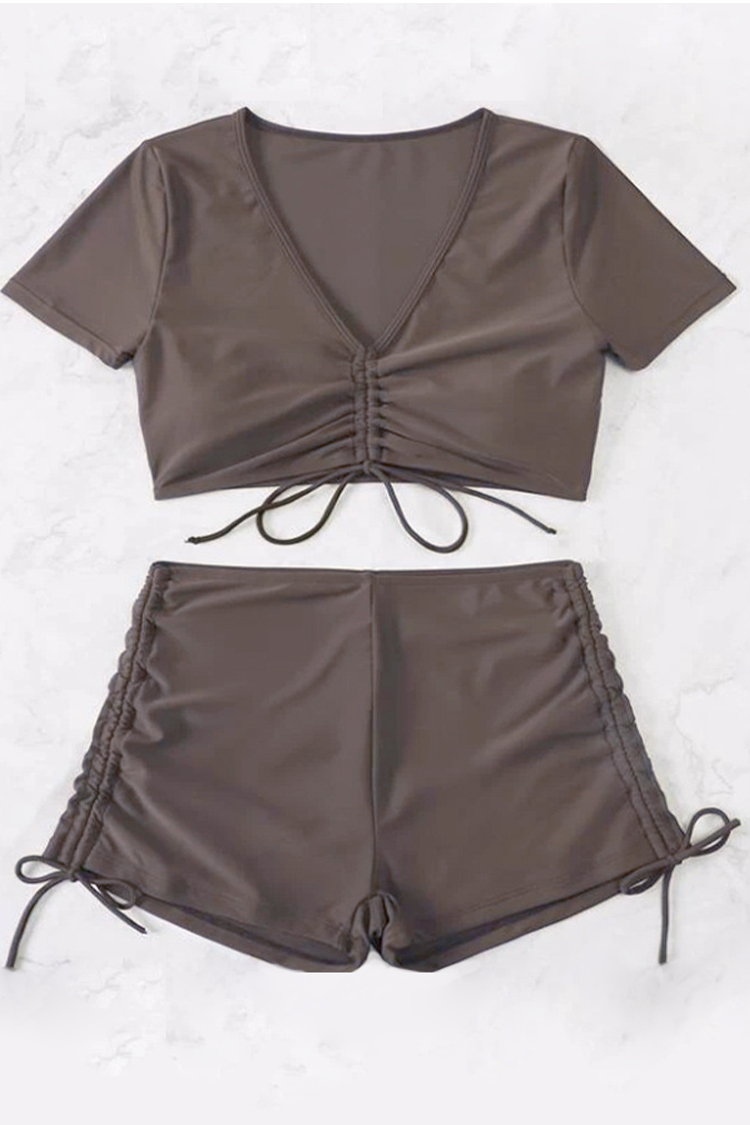 Ruched Drawstring V Neck Midkini & High Waist Shorts Set