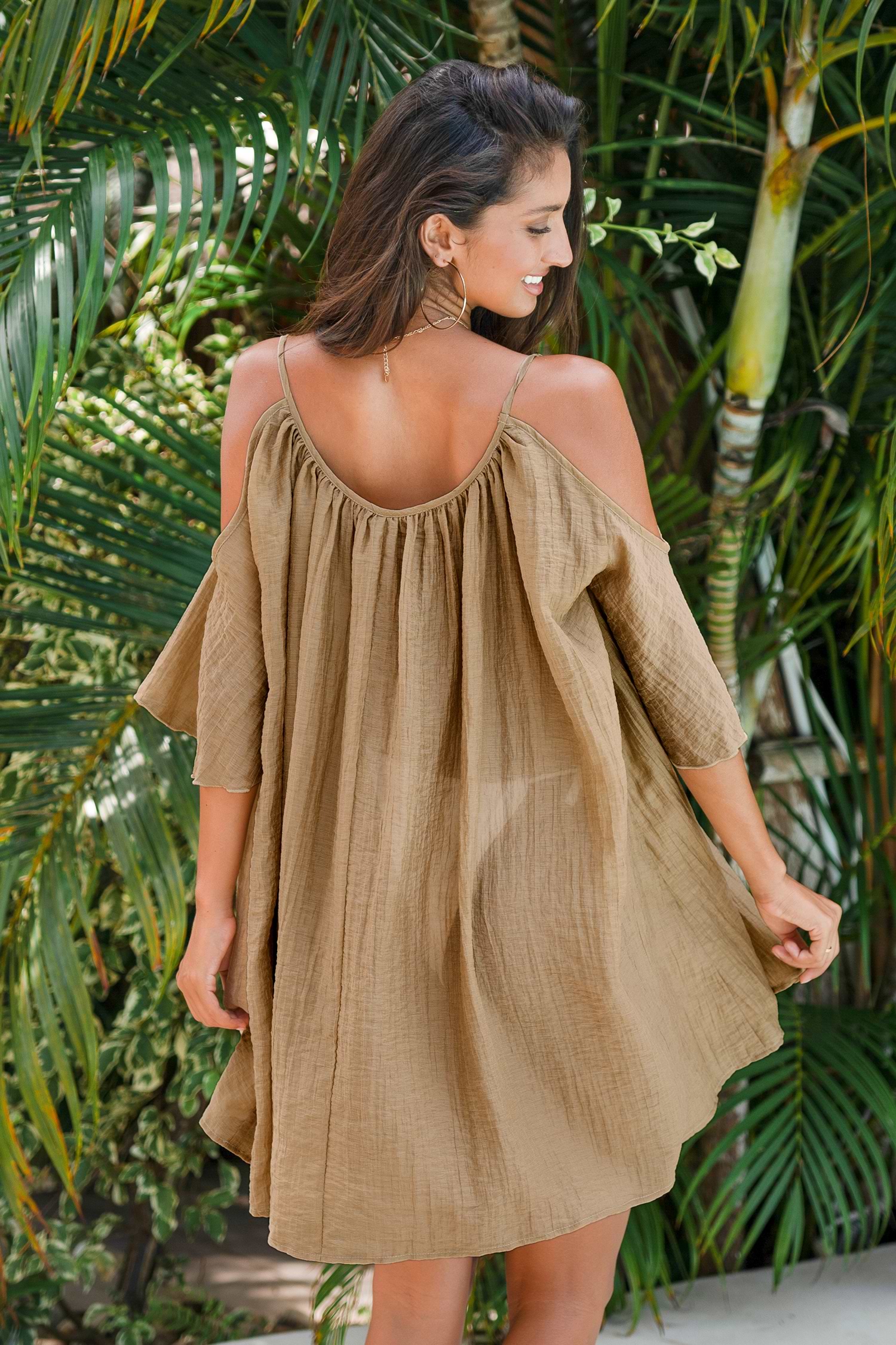 Sand Flared Sleeve Cut-Out Mini Cover-Up Dress