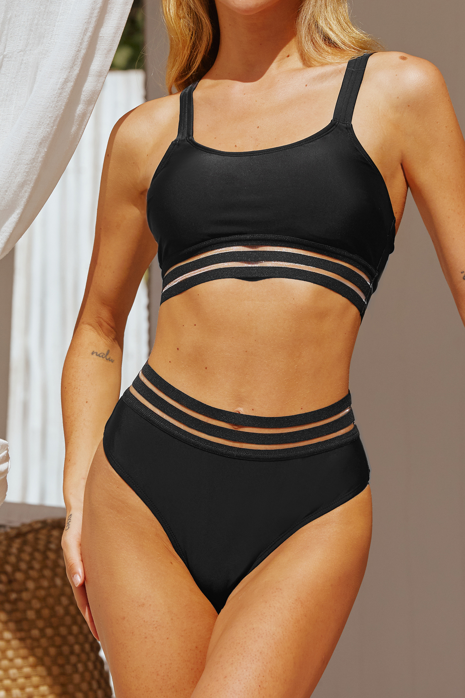 Sheer Striped Trim Scoop Neck Top & Mid Rise Bikini Set